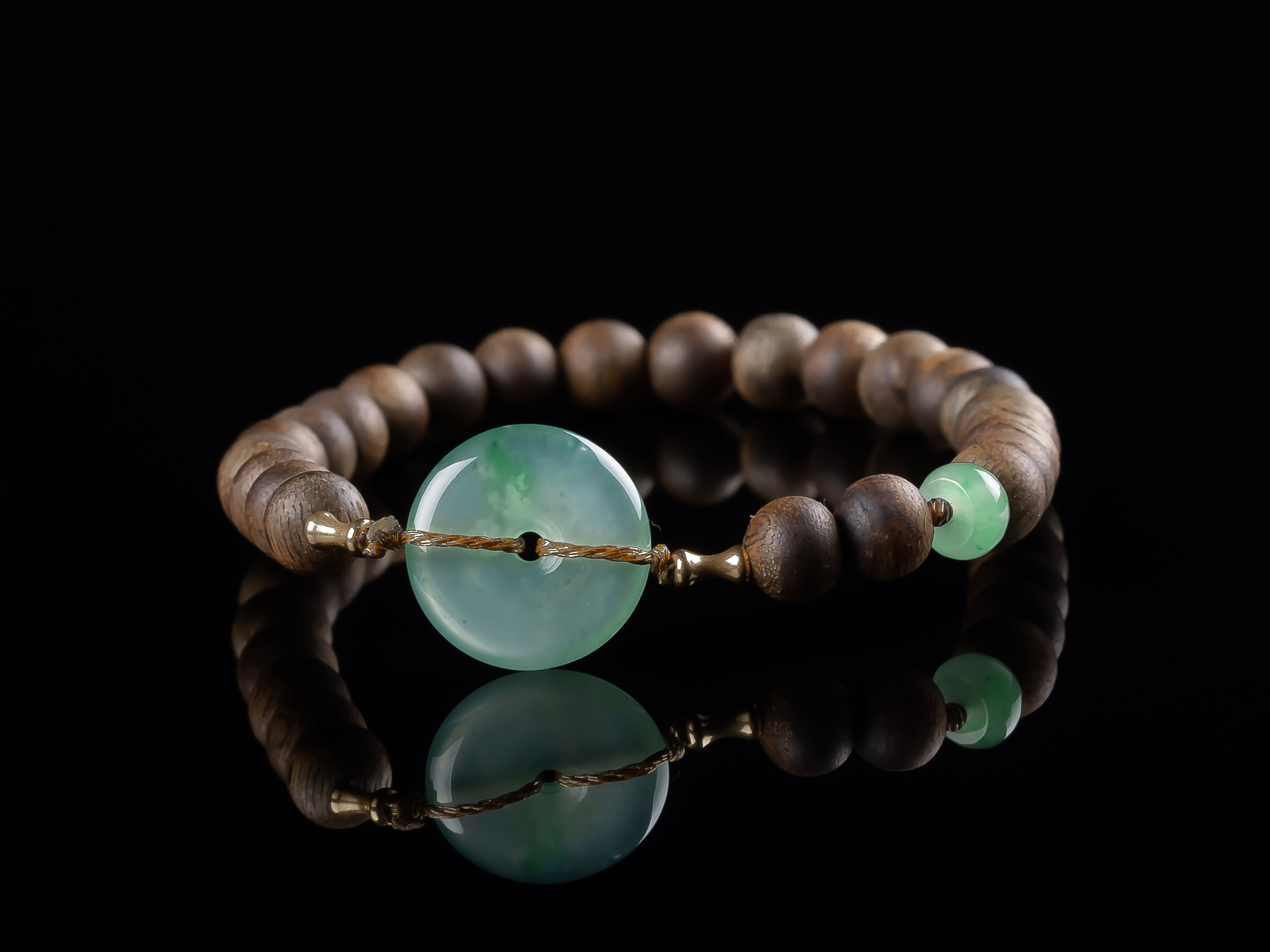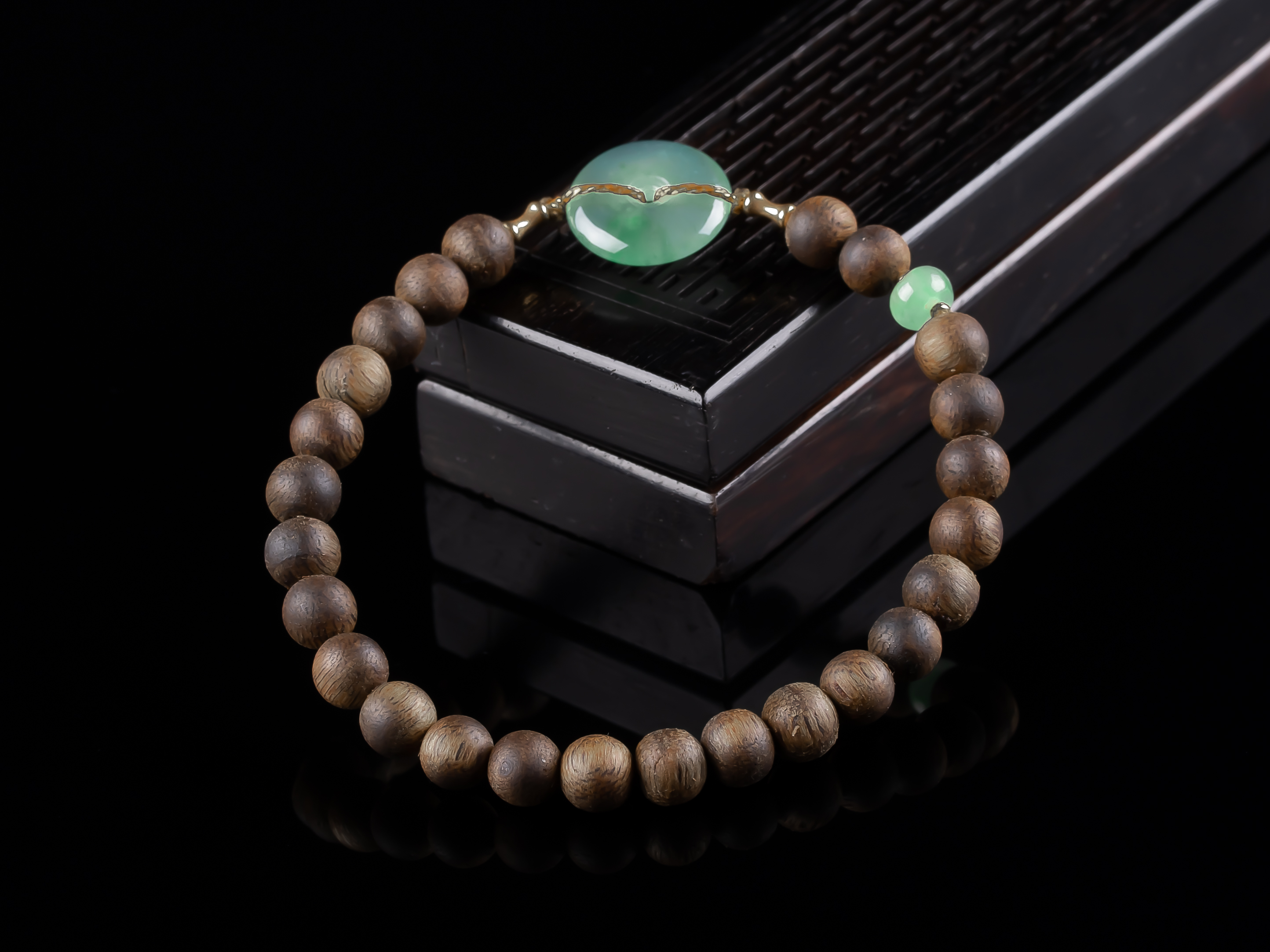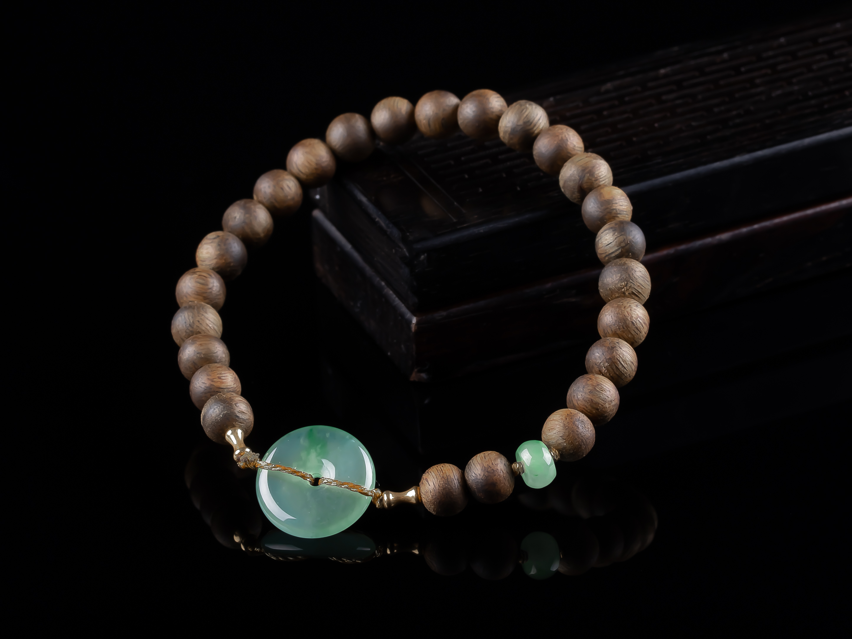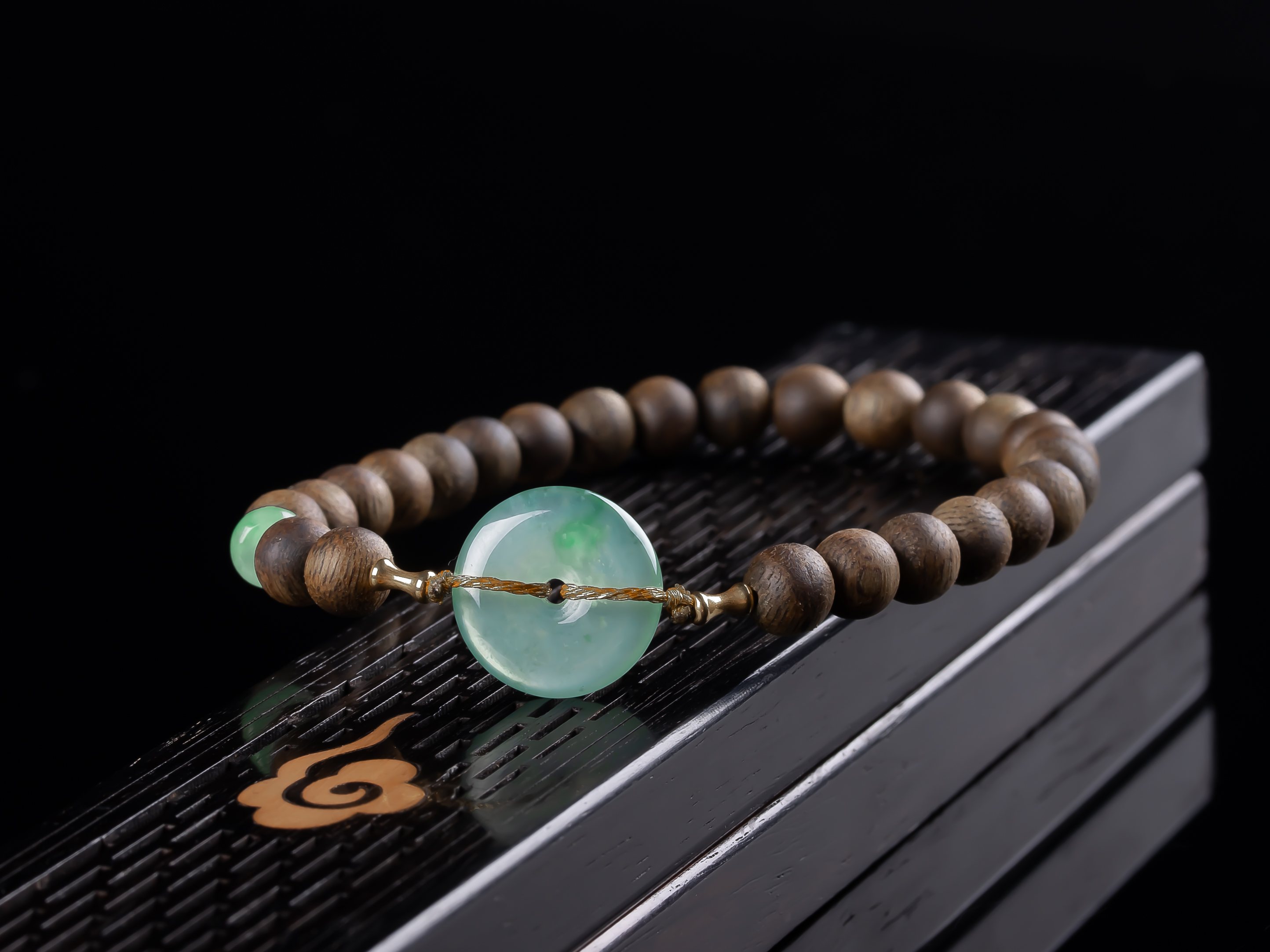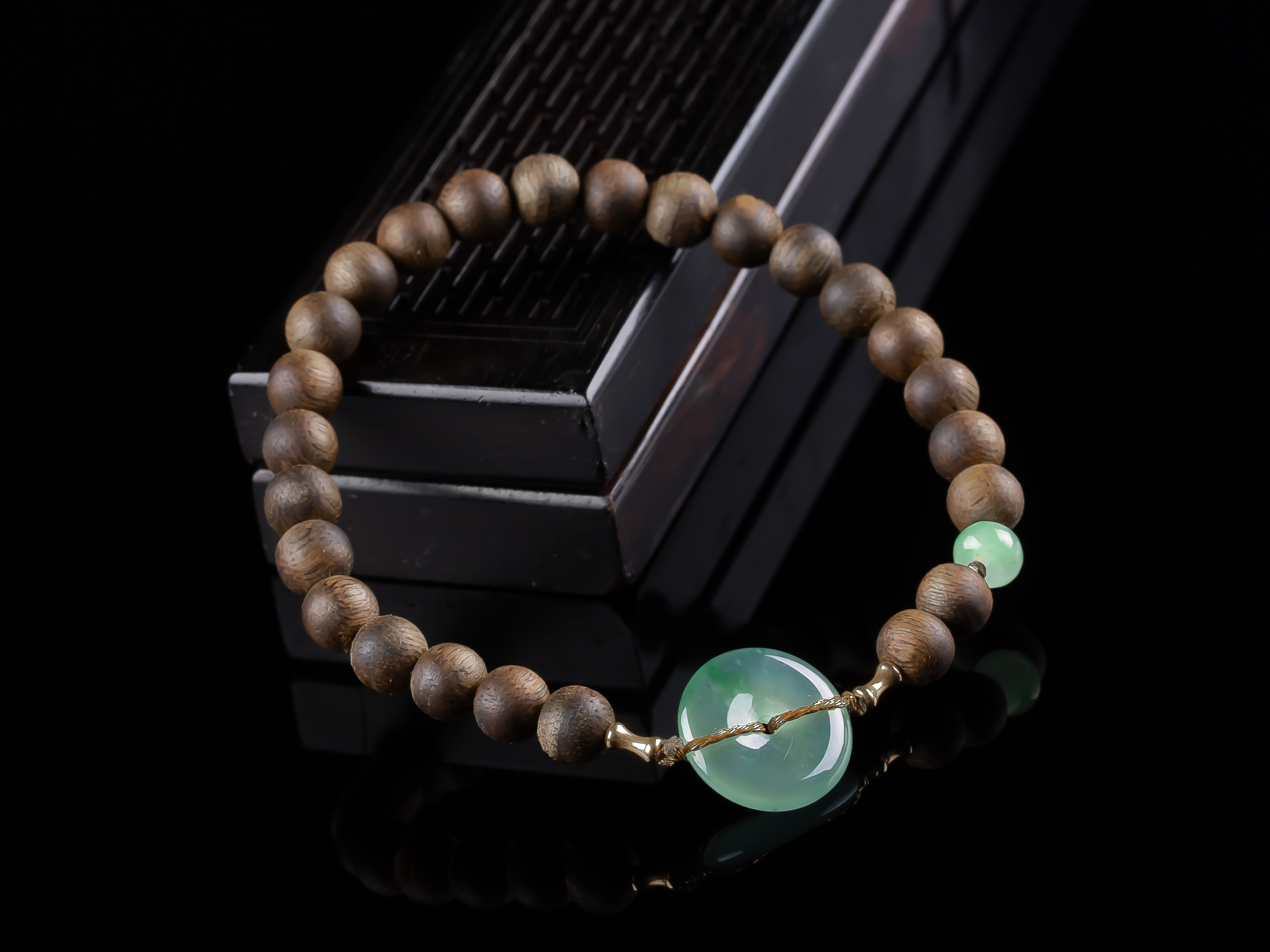 原创 沉香+冰飘花翡翠平安扣手串,天然沉香圆珠6.3mm,原色原味,香味自然清甜,冰种飘花的翡翠平安扣14.5*3mm,18K金穿搭,款式简约大方,平安有福!