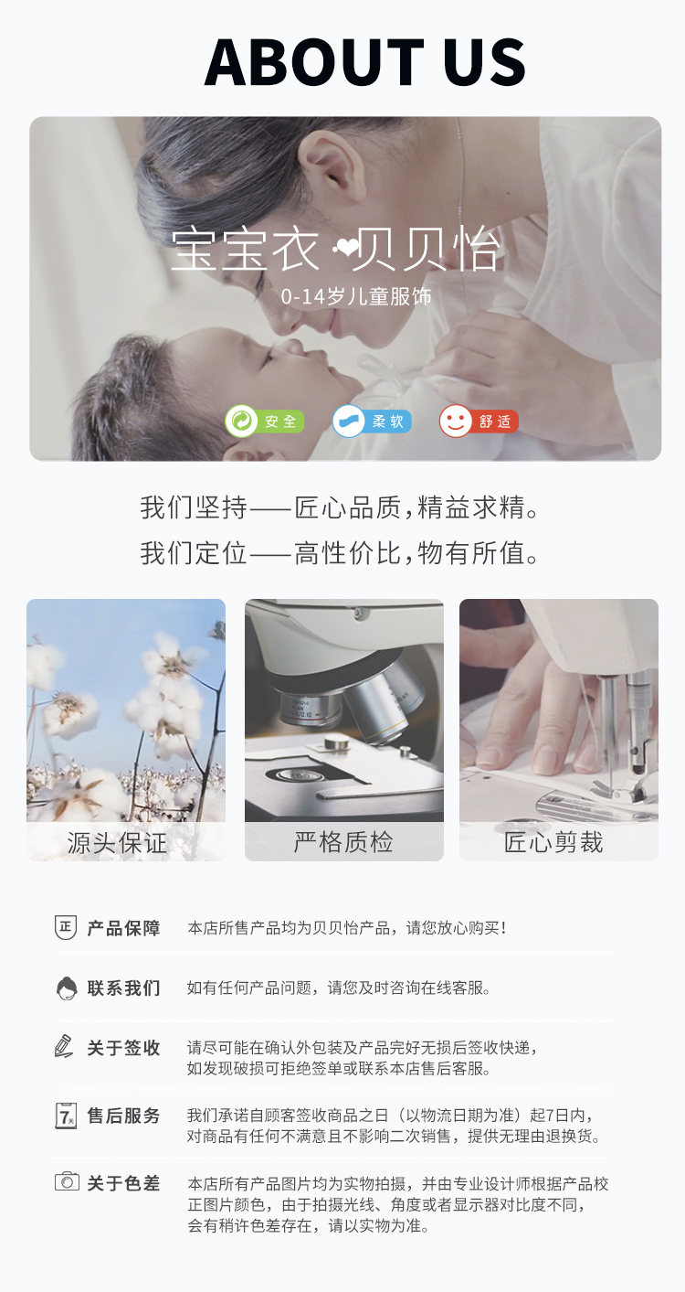 - 贝贝怡专注0-6岁婴幼儿服饰,坚持安全、柔软、舒适的产品理念,为千万中国家庭提供超高品质、安全可靠的婴幼儿服饰产品,妈妈放心,宝宝开心!