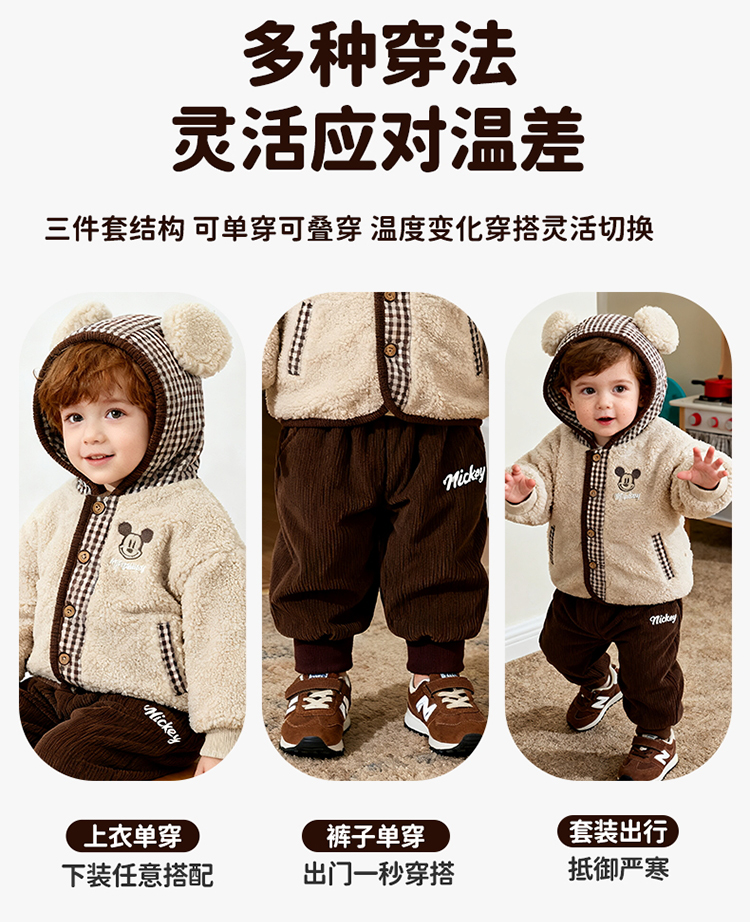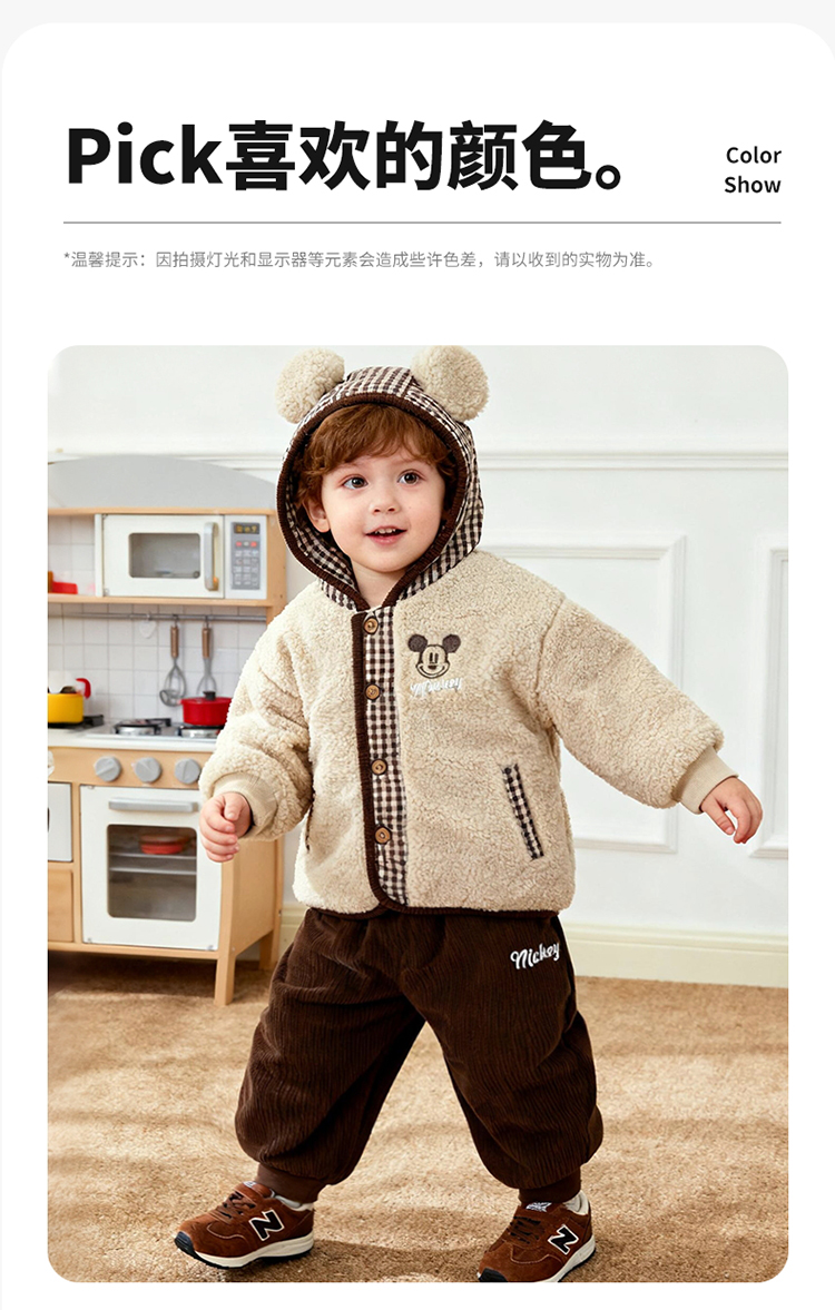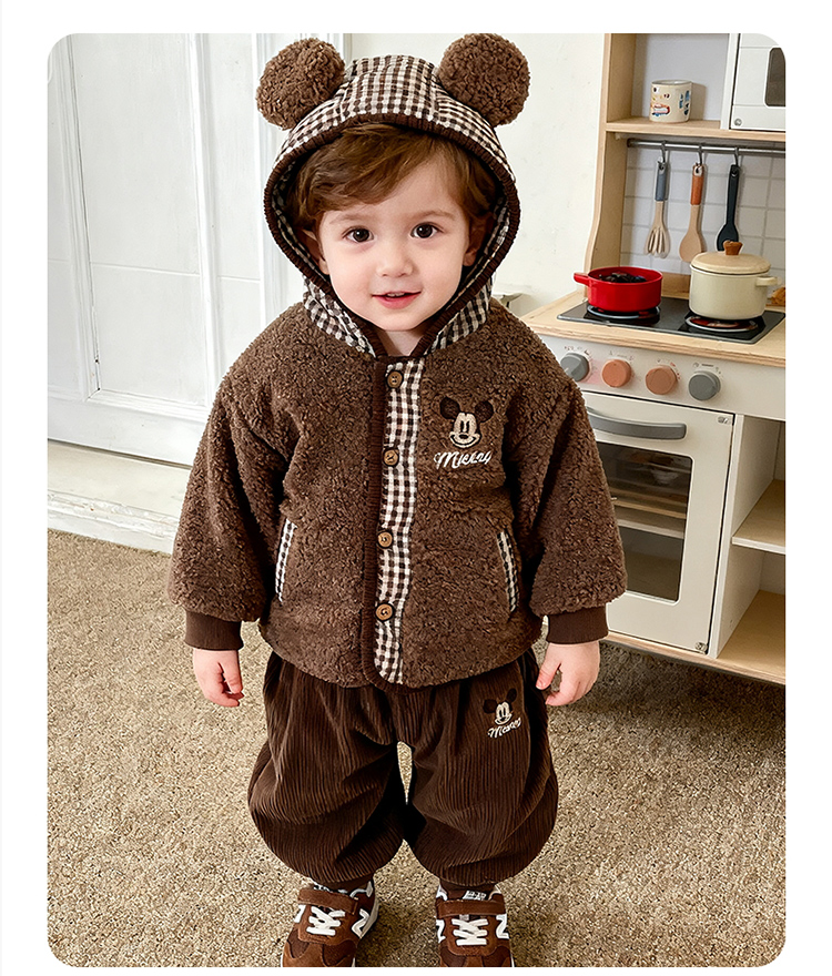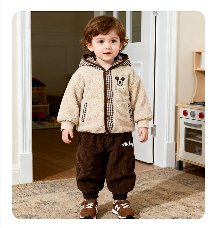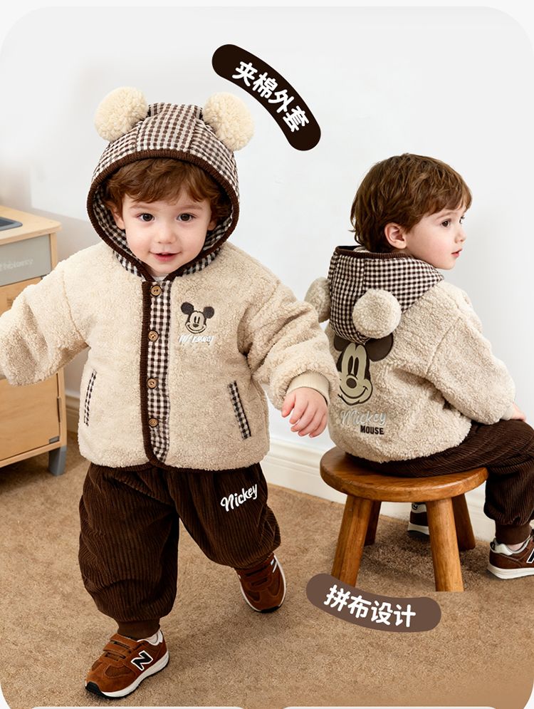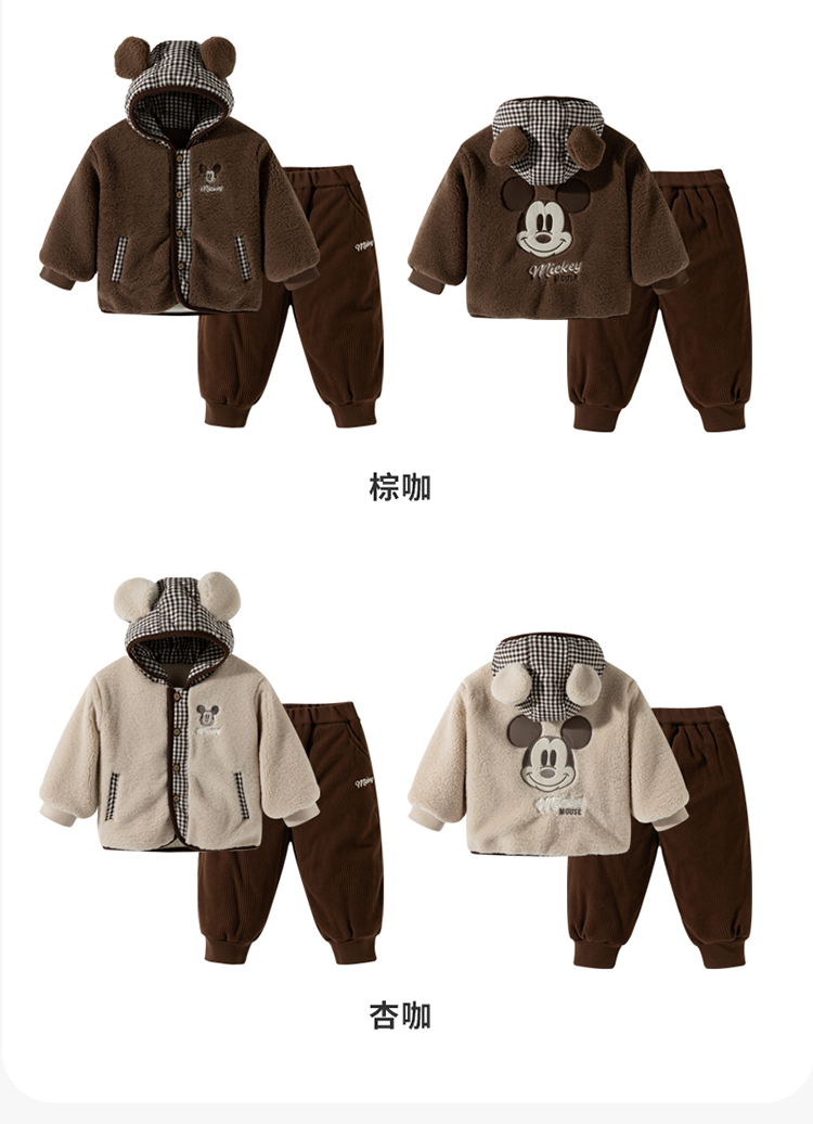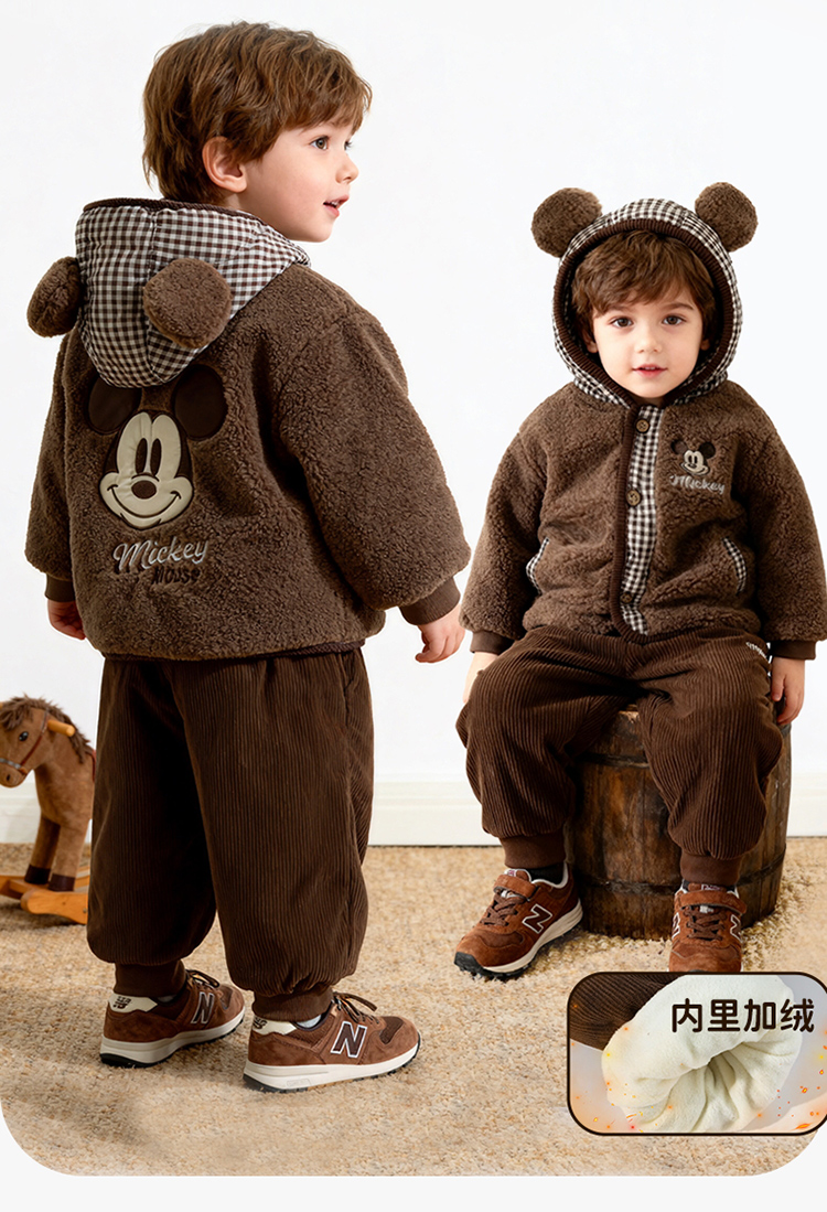 迪士尼(Disney)儿童夹棉保暖加绒羊羔毛外穿卡通外套裤子套装两件套男童童装新款