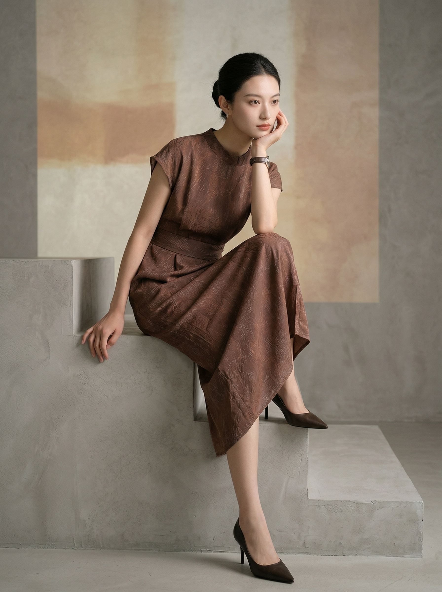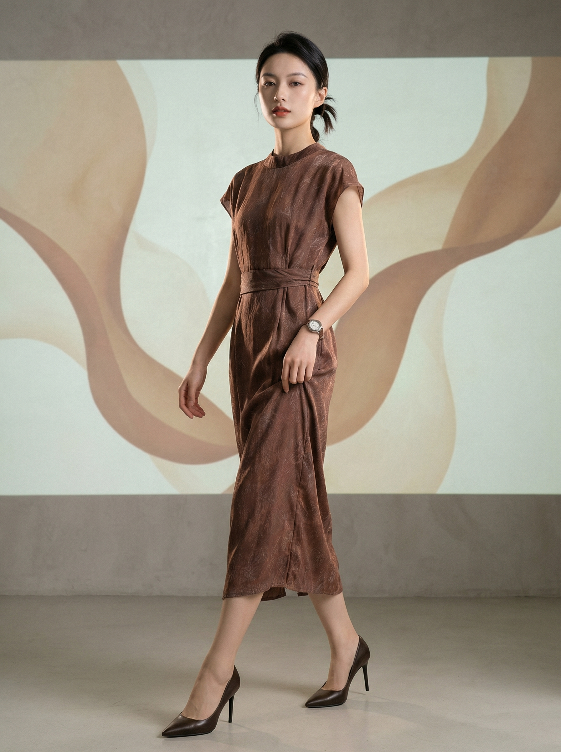 伯妮斯茵 | 小立领+连肩袖肌理几何提花 系带收腰高腰栗壳色直筒开叉中长裙SC2S59 优雅显瘦气质通勤百搭
