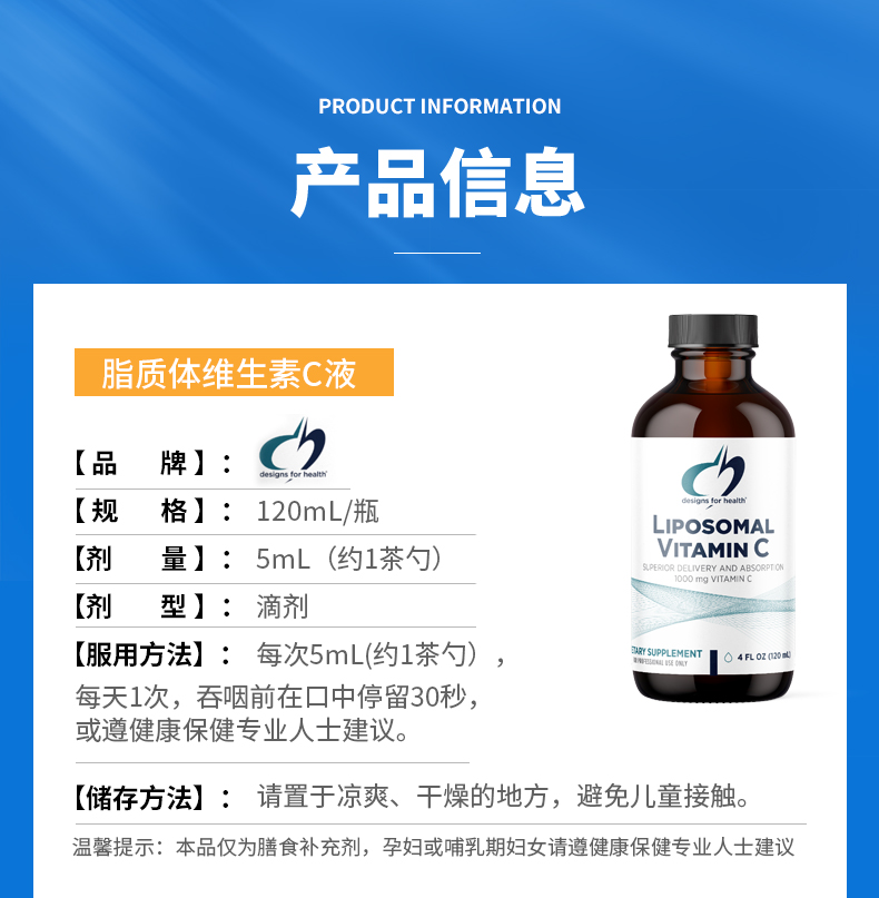 【效期至26年8月】脂质体维生素C液 Designs for health Liposomal Vitamin C 120mL/瓶