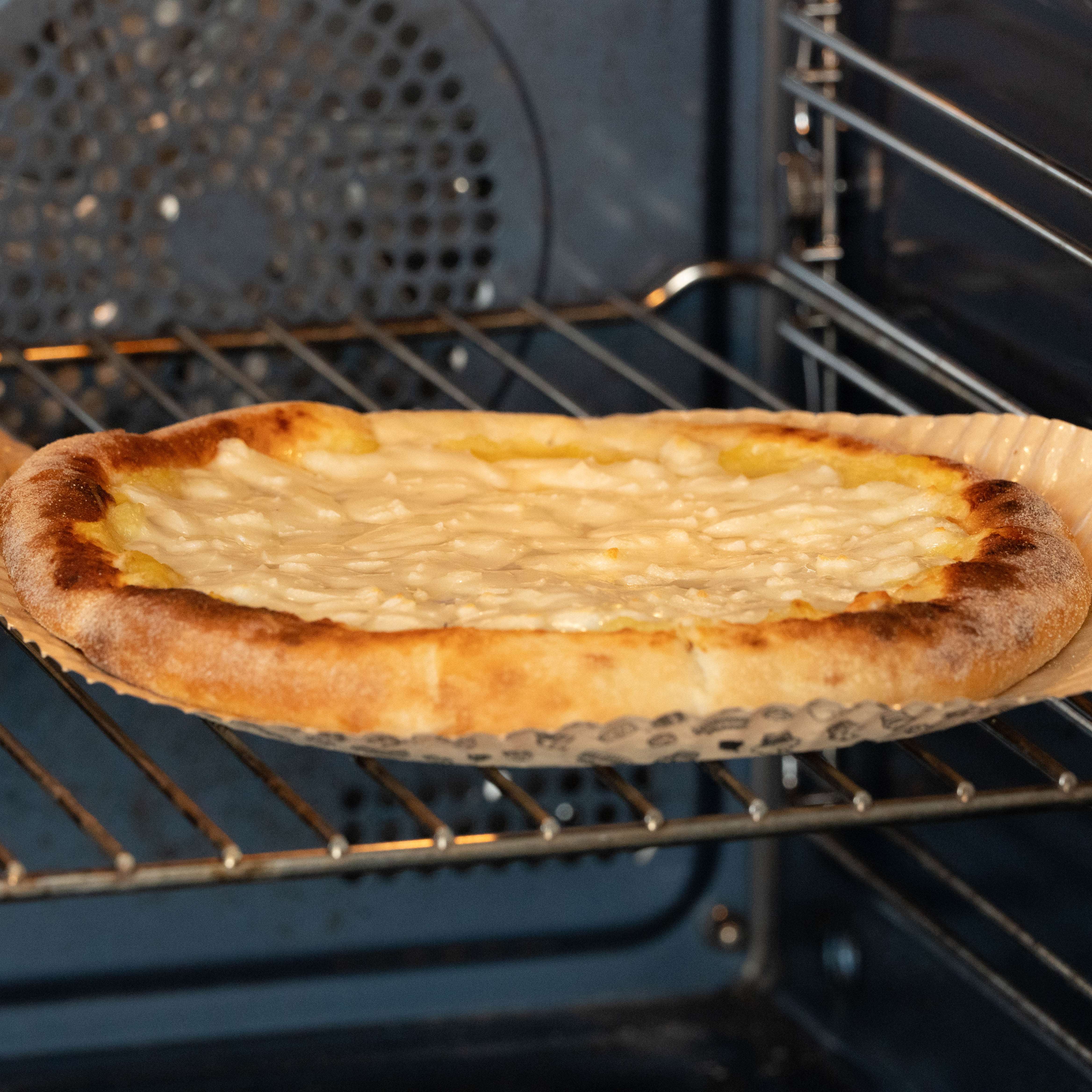 2. 烤箱烘烤:烤箱上火230℃,下火180℃预热3分钟,解冻后的披萨直接放入烤箱,9寸披萨烤制6-7分钟;6寸披萨烤制3-5分钟(芝士微焦、饼面金黄为止)。