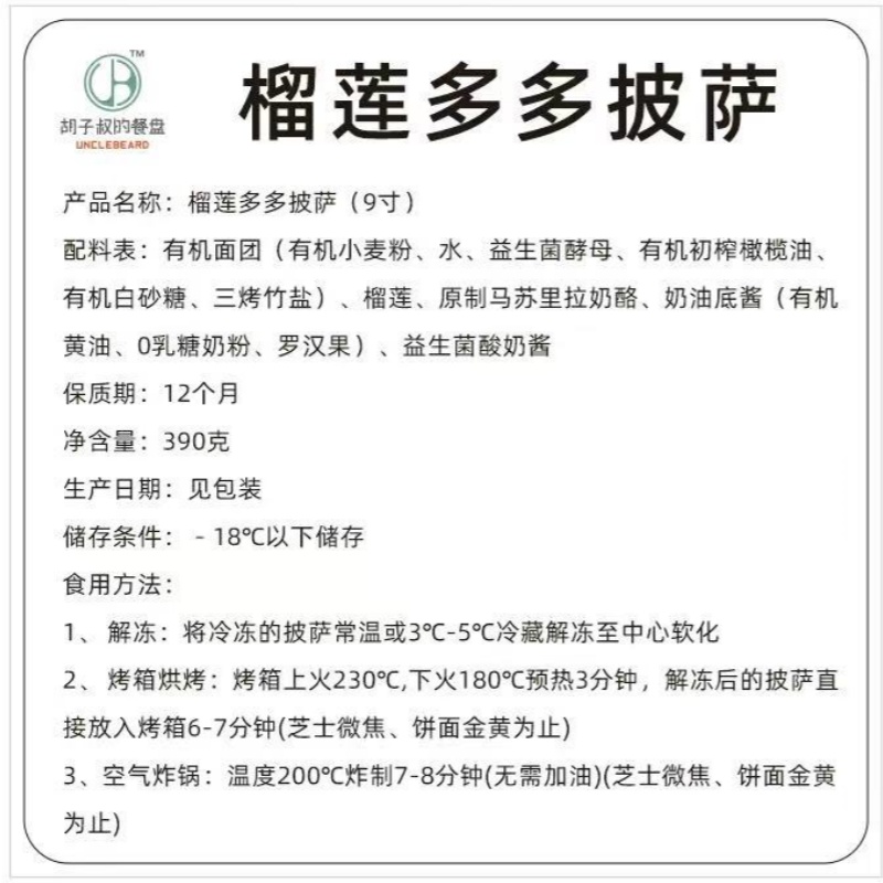 【配料表】有机面团(有机小麦粉、水、益生菌酵母、有机初榨橄榄油、有机白砂糖、三烤竹盐)、榴莲、原制马苏里拉奶酪、奶油底酱(有机黄油、0乳糖奶粉、罗汉果)、益生菌酸奶酱