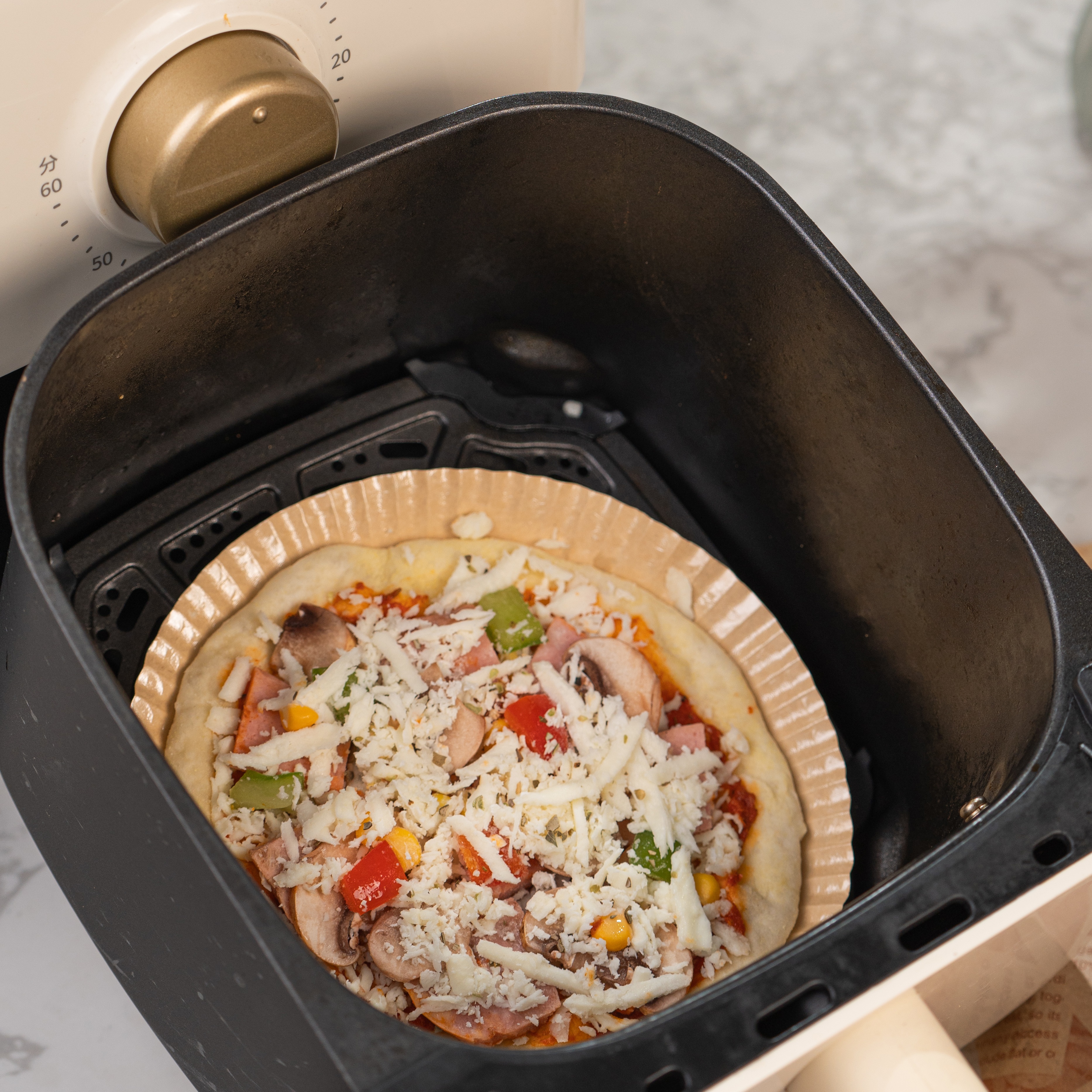 3. 空气炸锅:温度200℃,9寸披萨烤7-8分钟;6寸披萨烤3-5分钟(无需加油)(芝士微焦、饼面金黄为止)