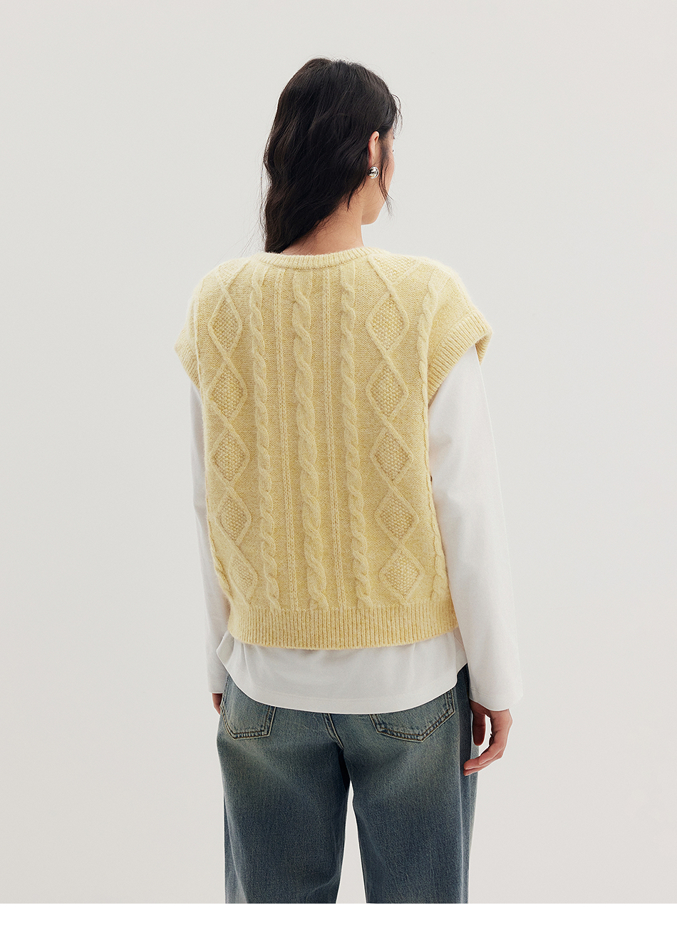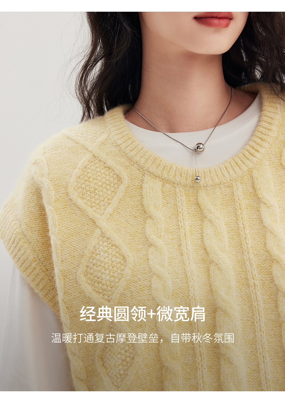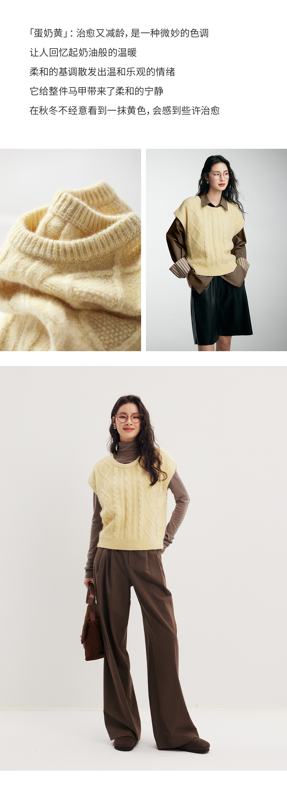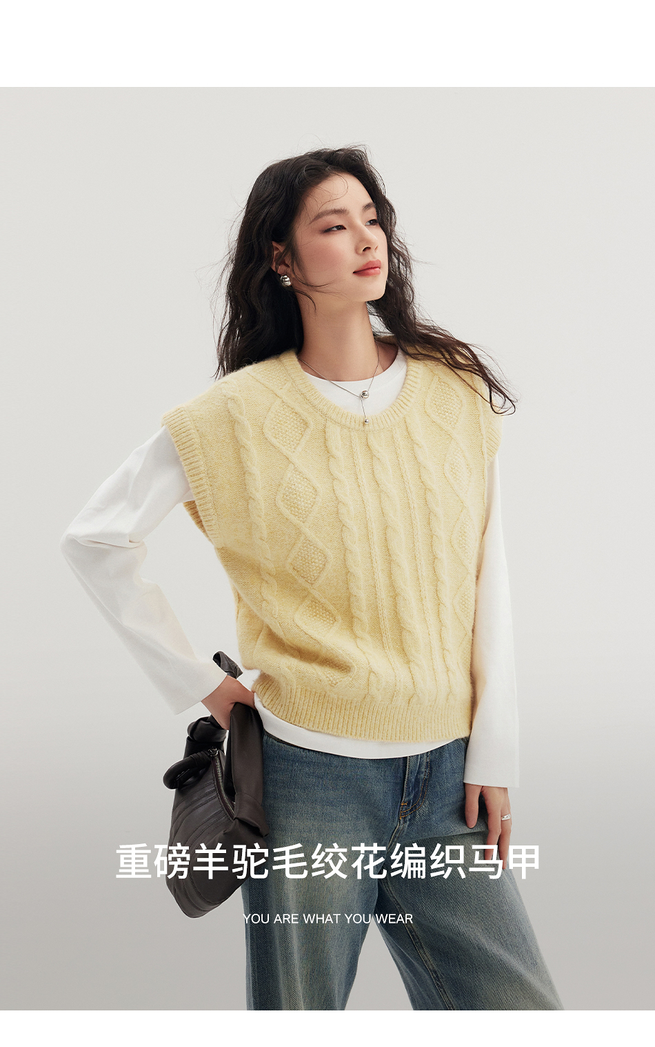 棉仓3576990010-重磅羊驼毛绞花编织马甲——蛋奶黄