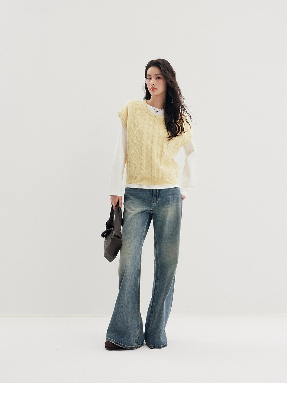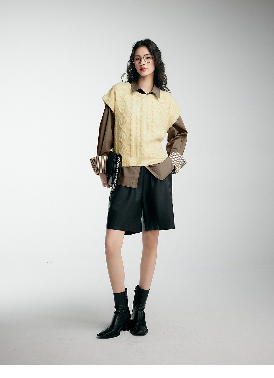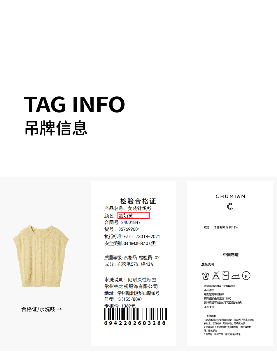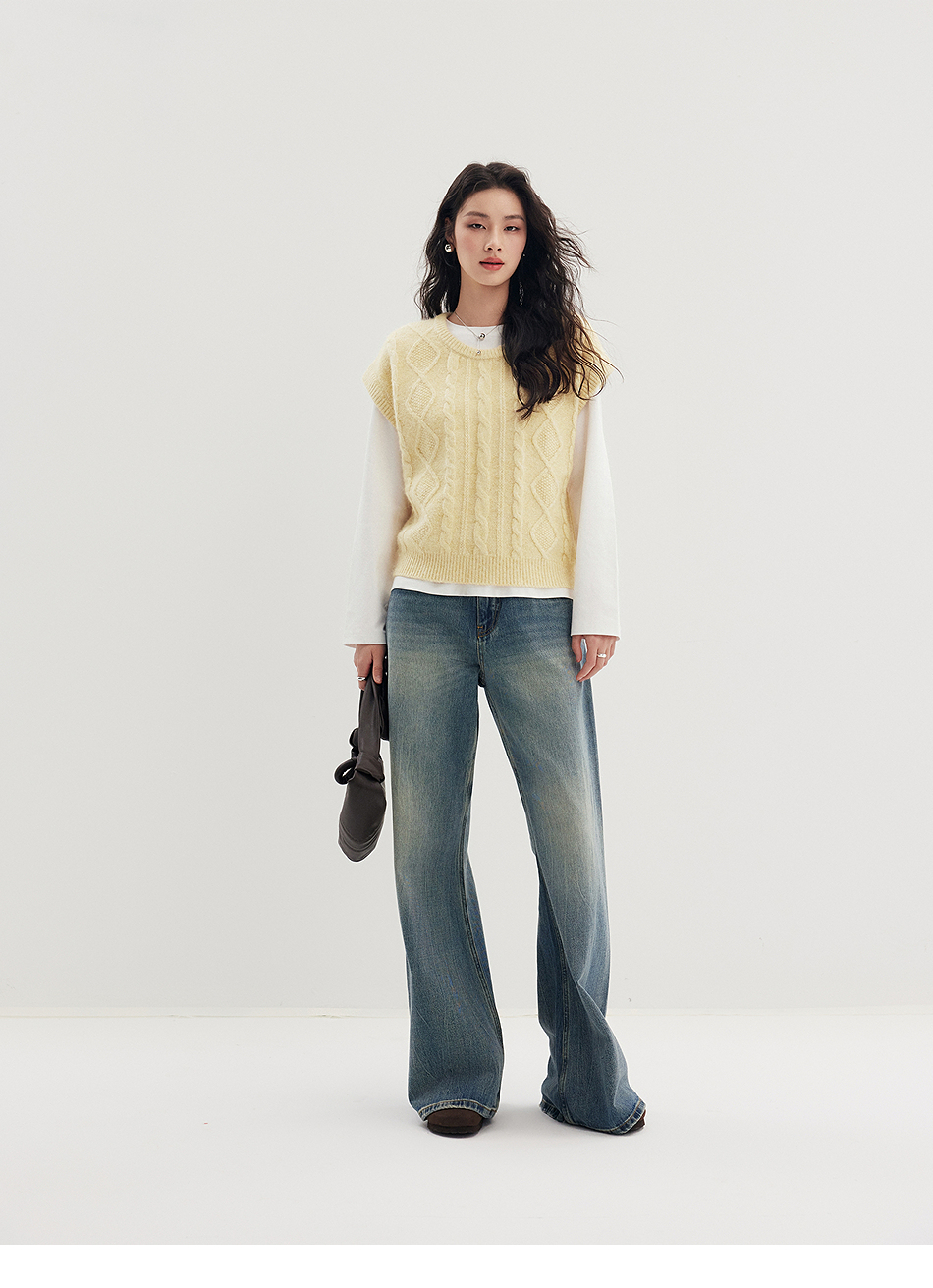 棉仓3576990010-重磅羊驼毛绞花编织马甲——蛋奶黄