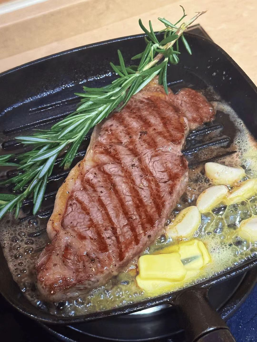 5. 煎牛排:放入牛排,颜色焦黄时翻面,另一面微微焦黄时,再放入黄油、迷迭香、大蒜等配菜;