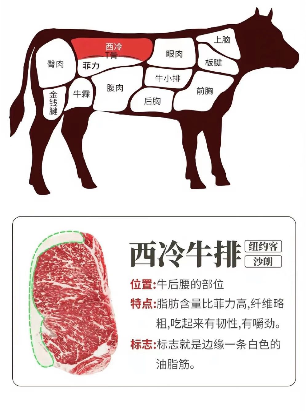 西冷牛排取自牛的上腰部脊肉(外脊),