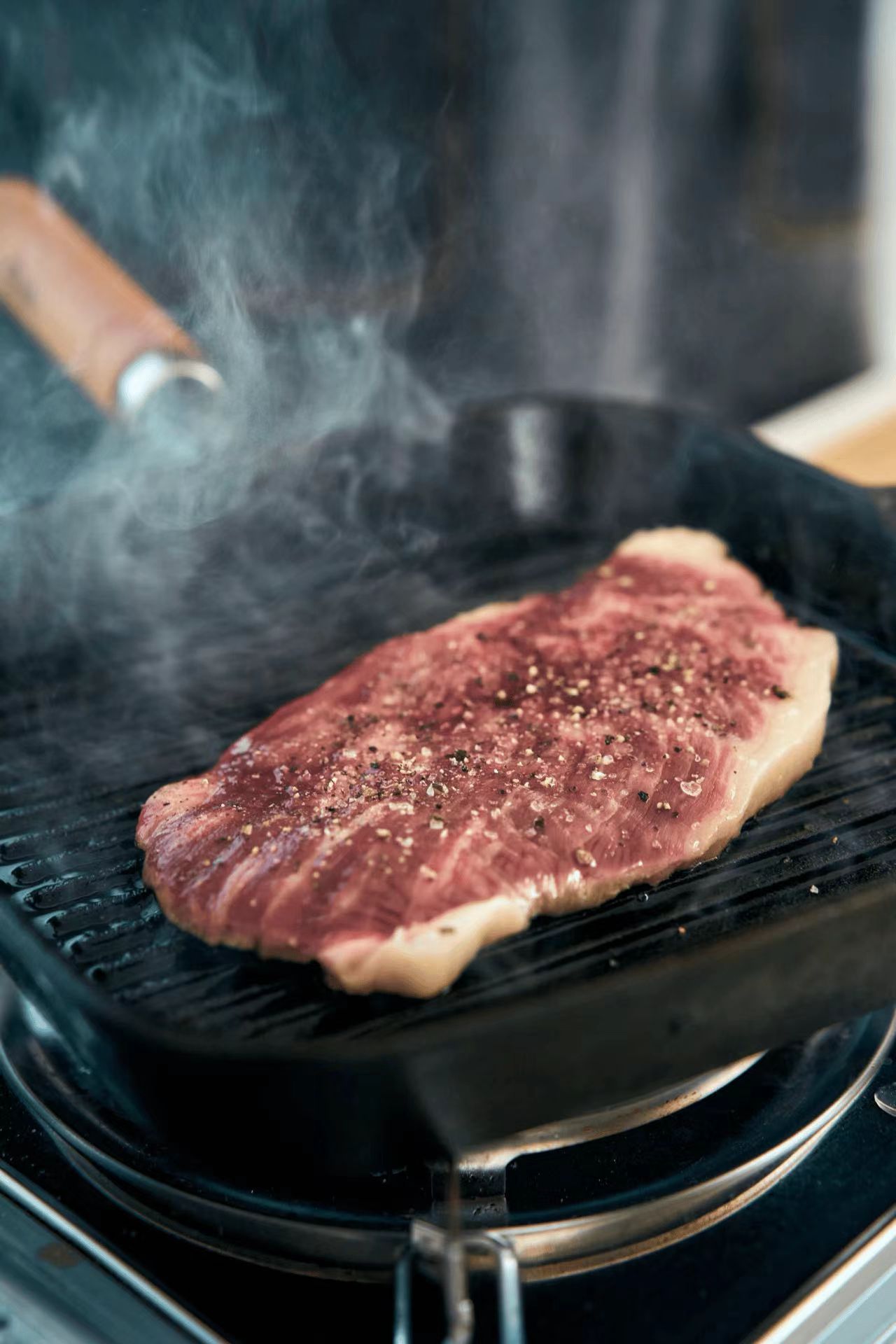 4. 热锅:倒油后,需要等到锅热到冒烟时才能放入牛排;(铸铁锅更佳)