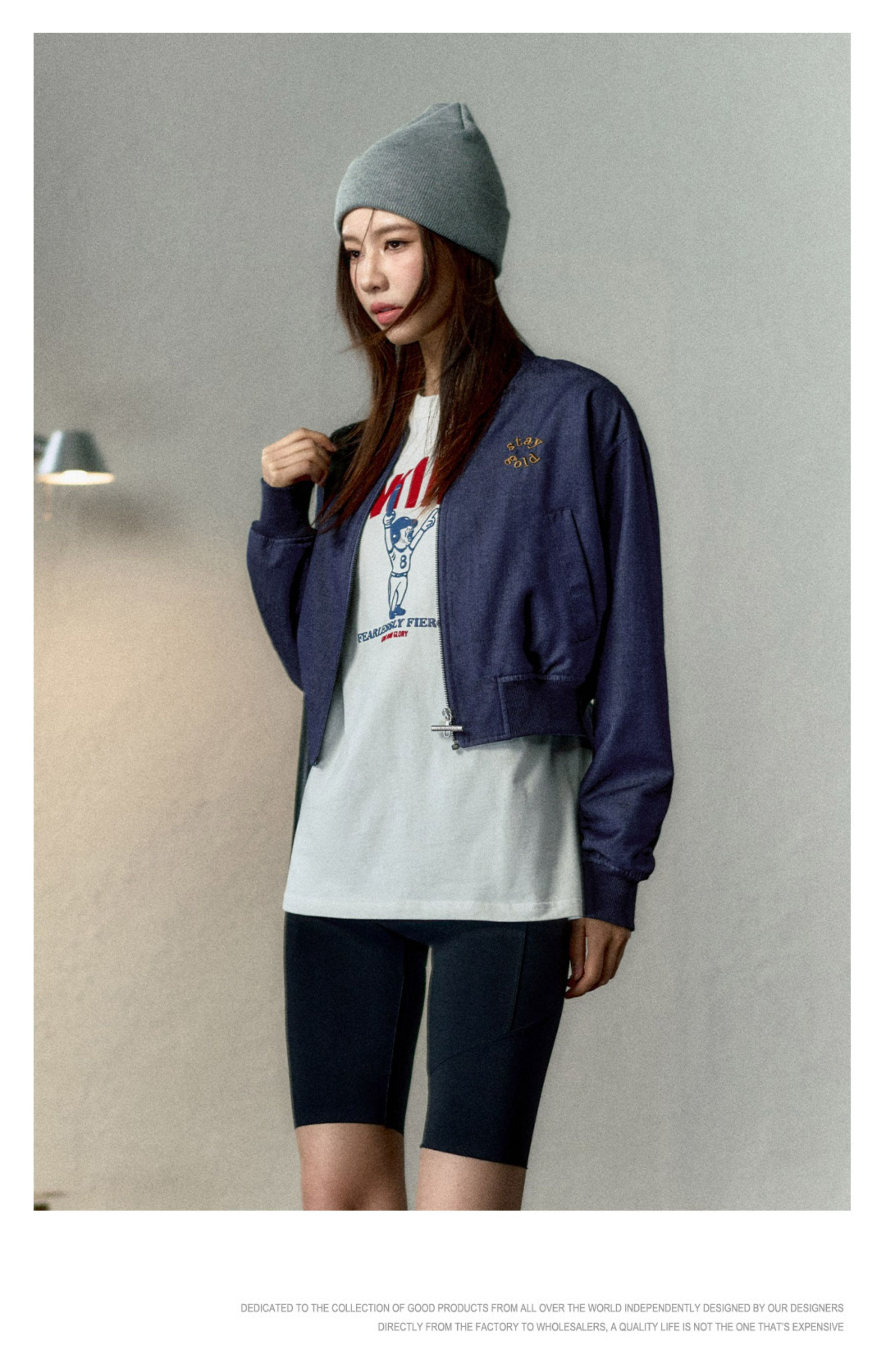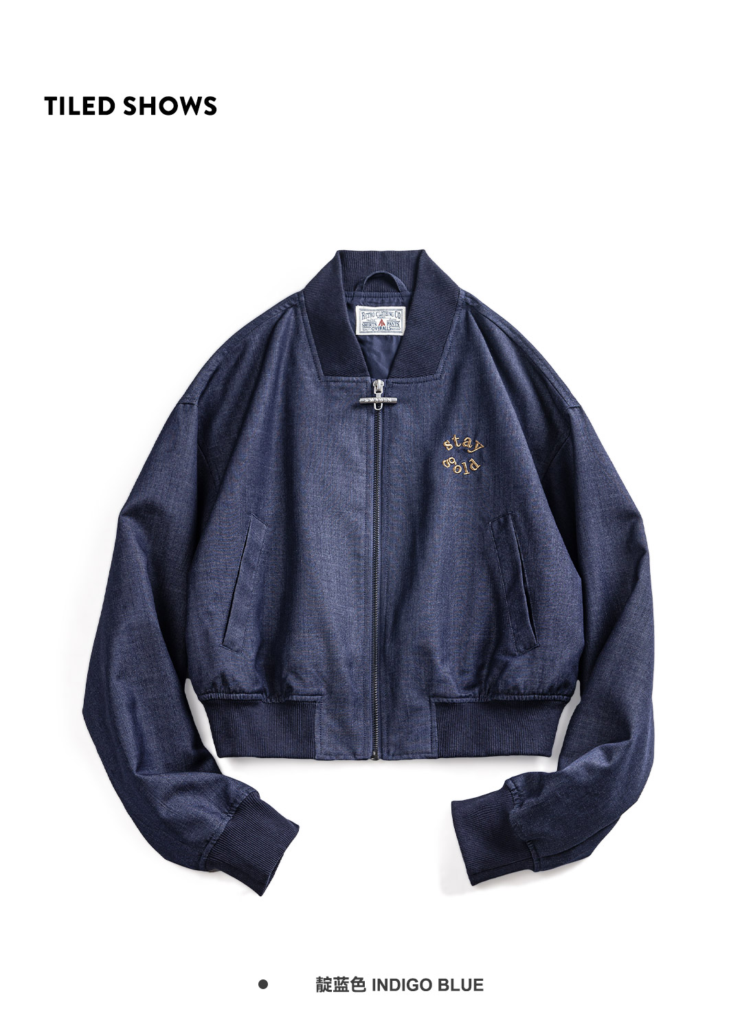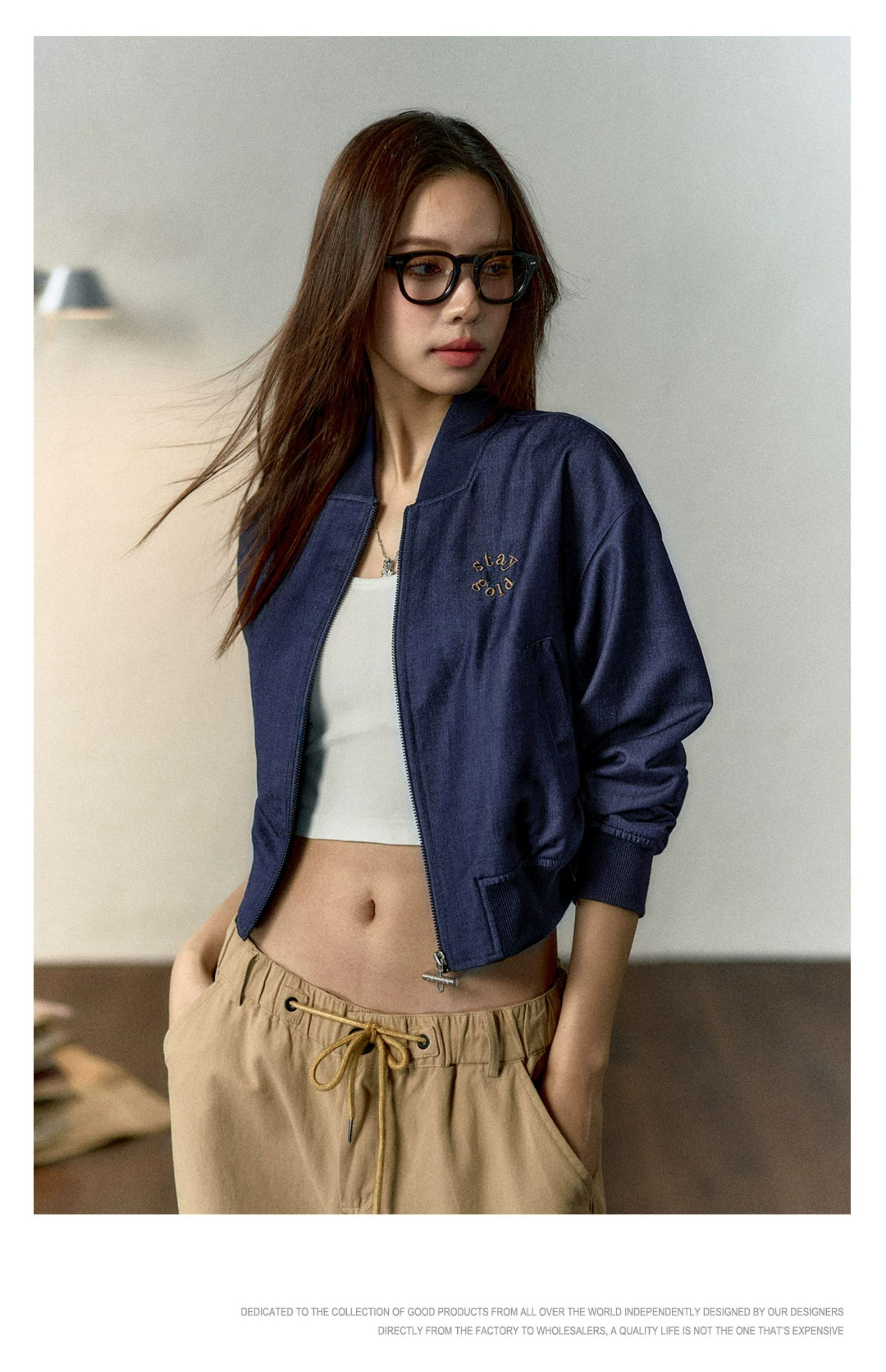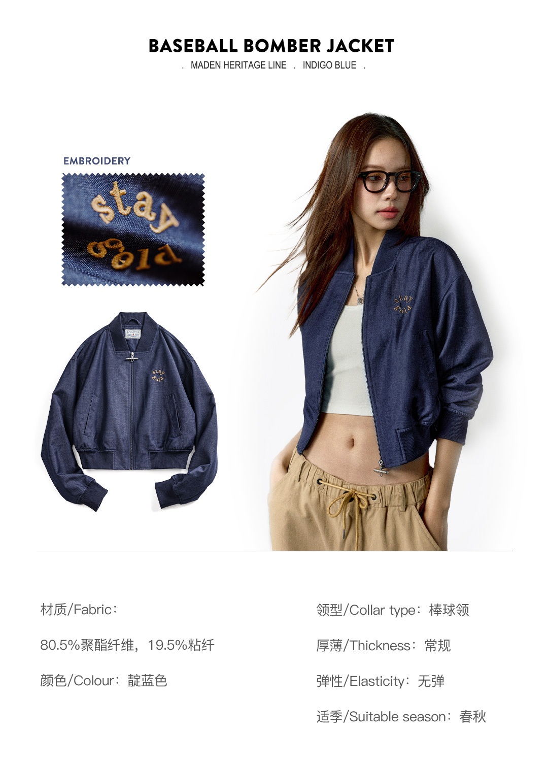 马登女装仿牛仔刺绣高腰棒球服辣妹风飞行员夹克拼接棒球衫外套