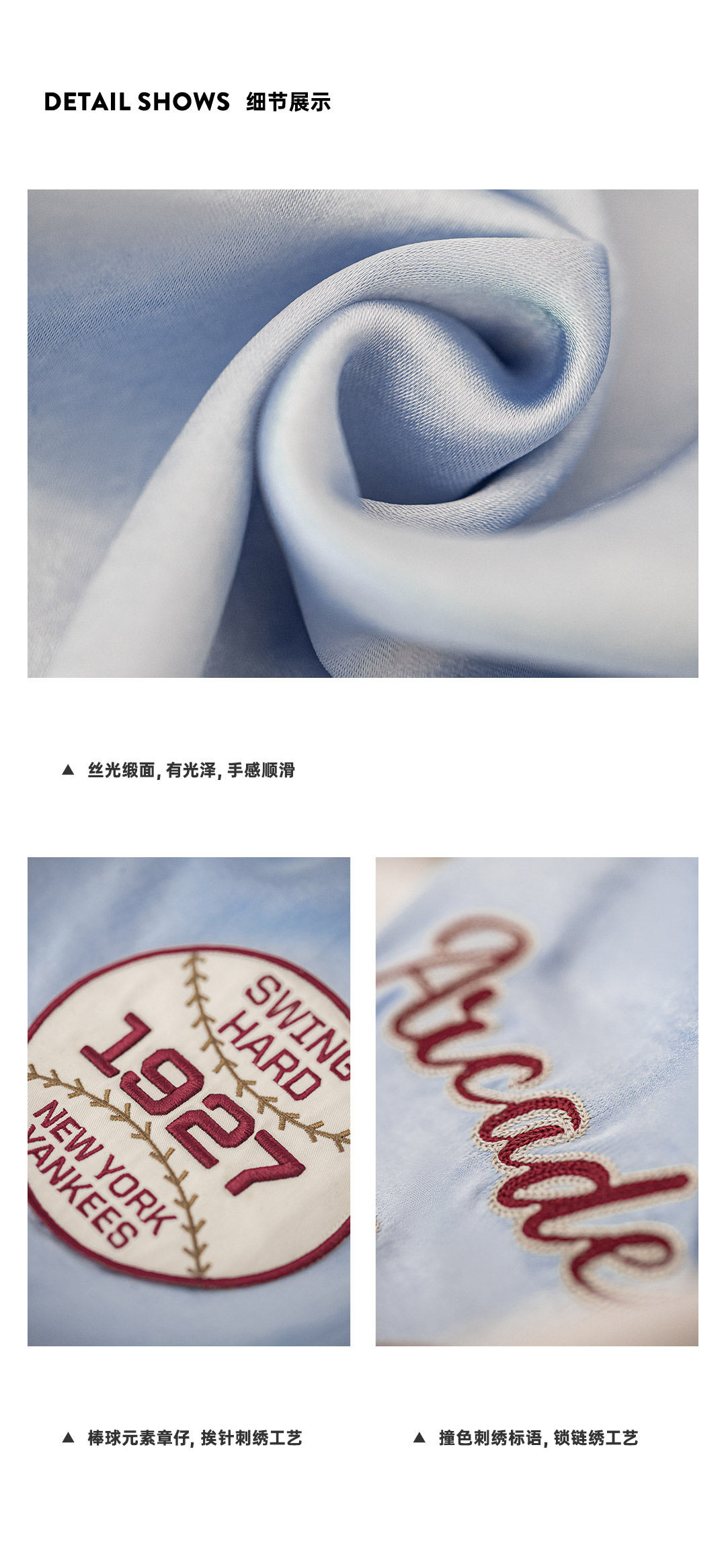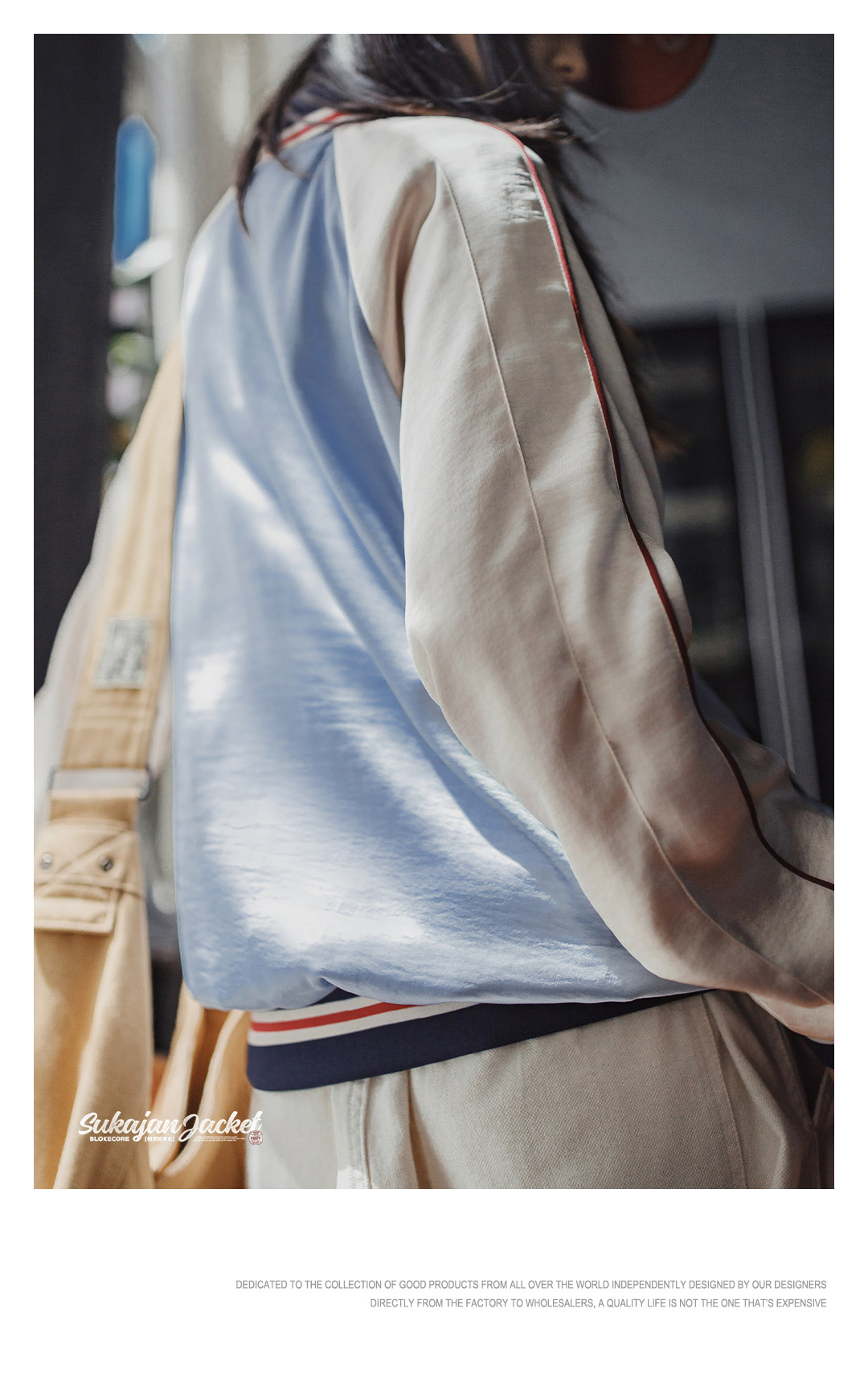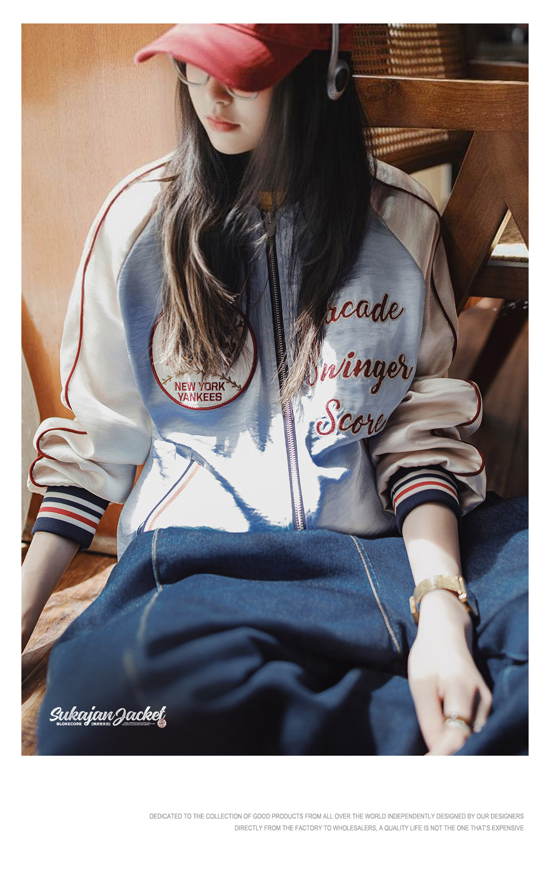马登美式复古宽松横须贺重工刺绣棒球服领夹克缎面开衫外套女士秋