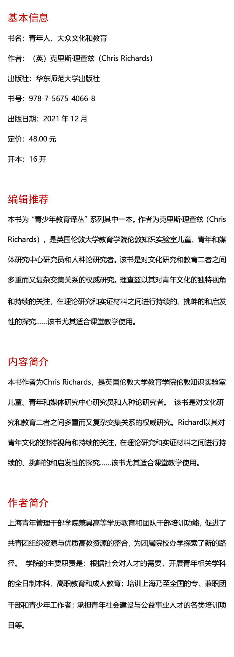 青年人、大众文化和教育 青少年教育译丛 克里斯理查兹 青年文化研究 教育理论 正版 华东师范大学出版社
