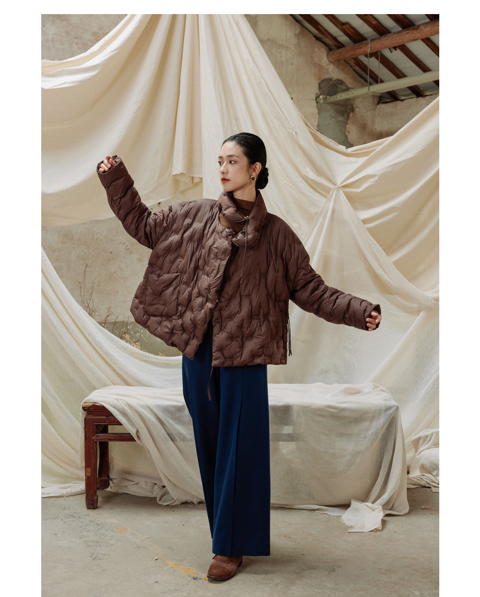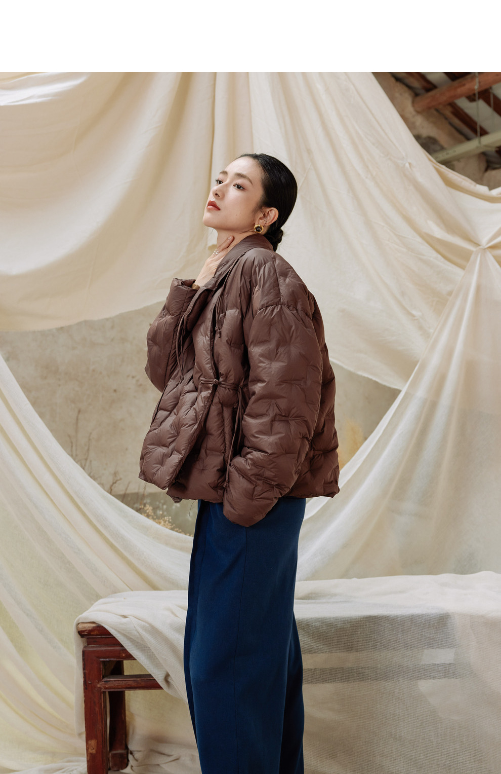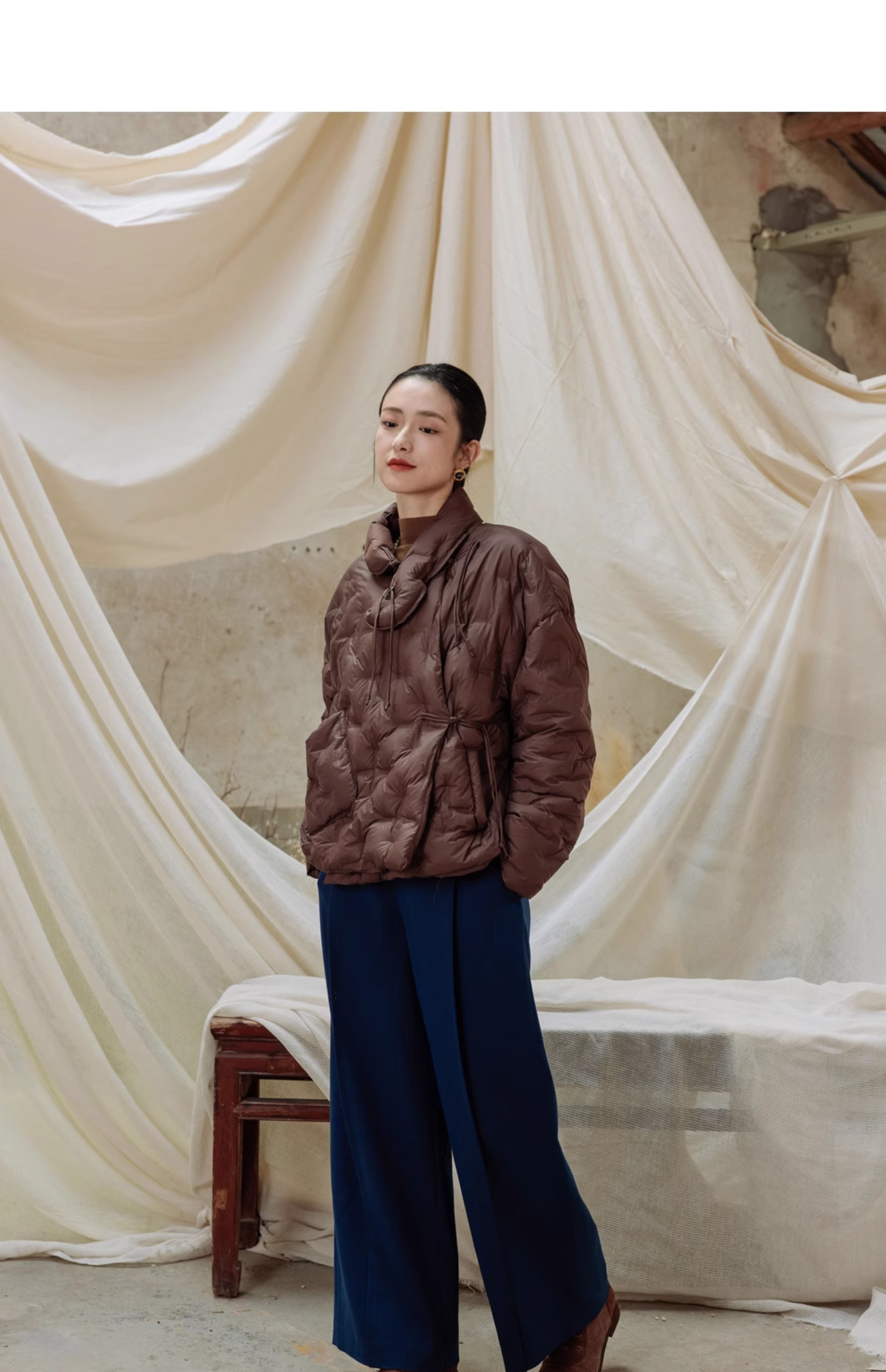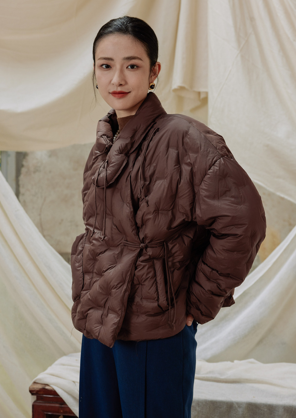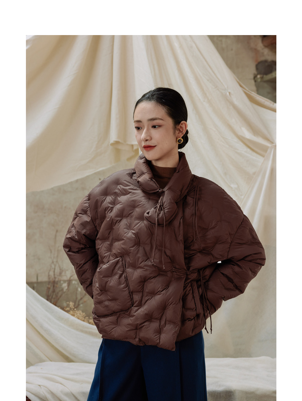 绽放786朵/新中式盘扣系带绗缝不对称圆领咖啡色轻薄短款羽绒服