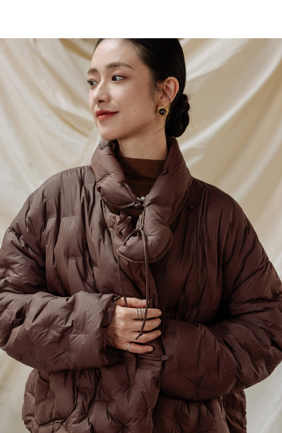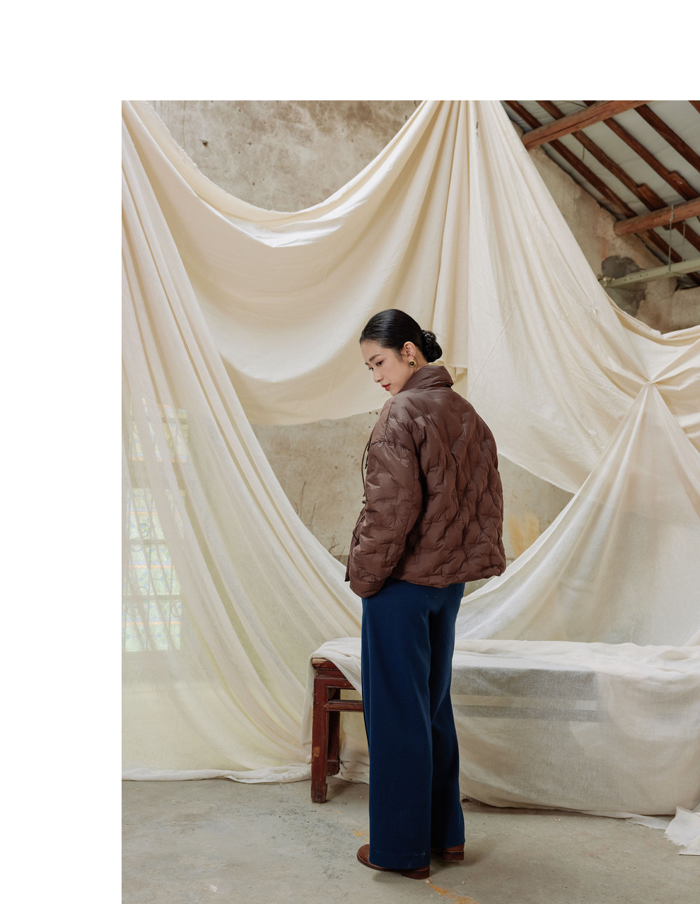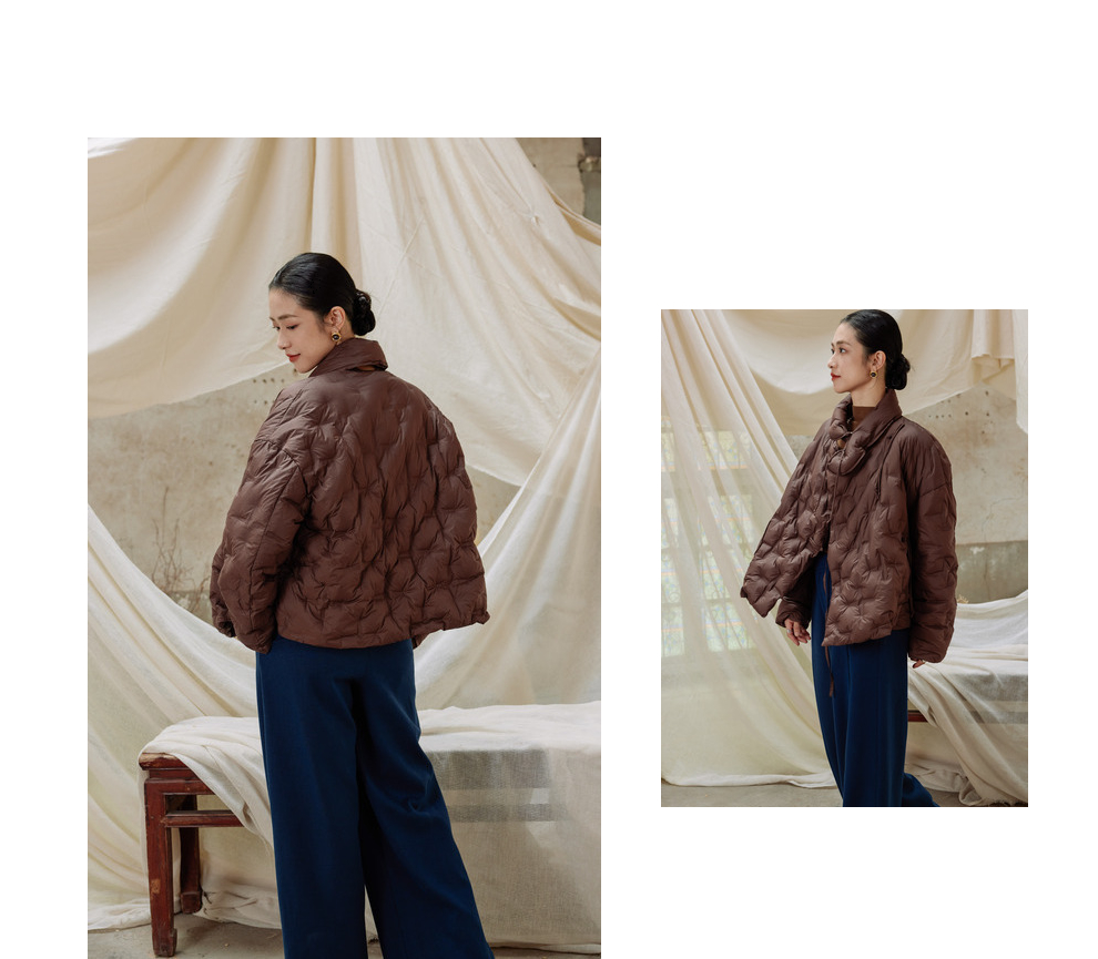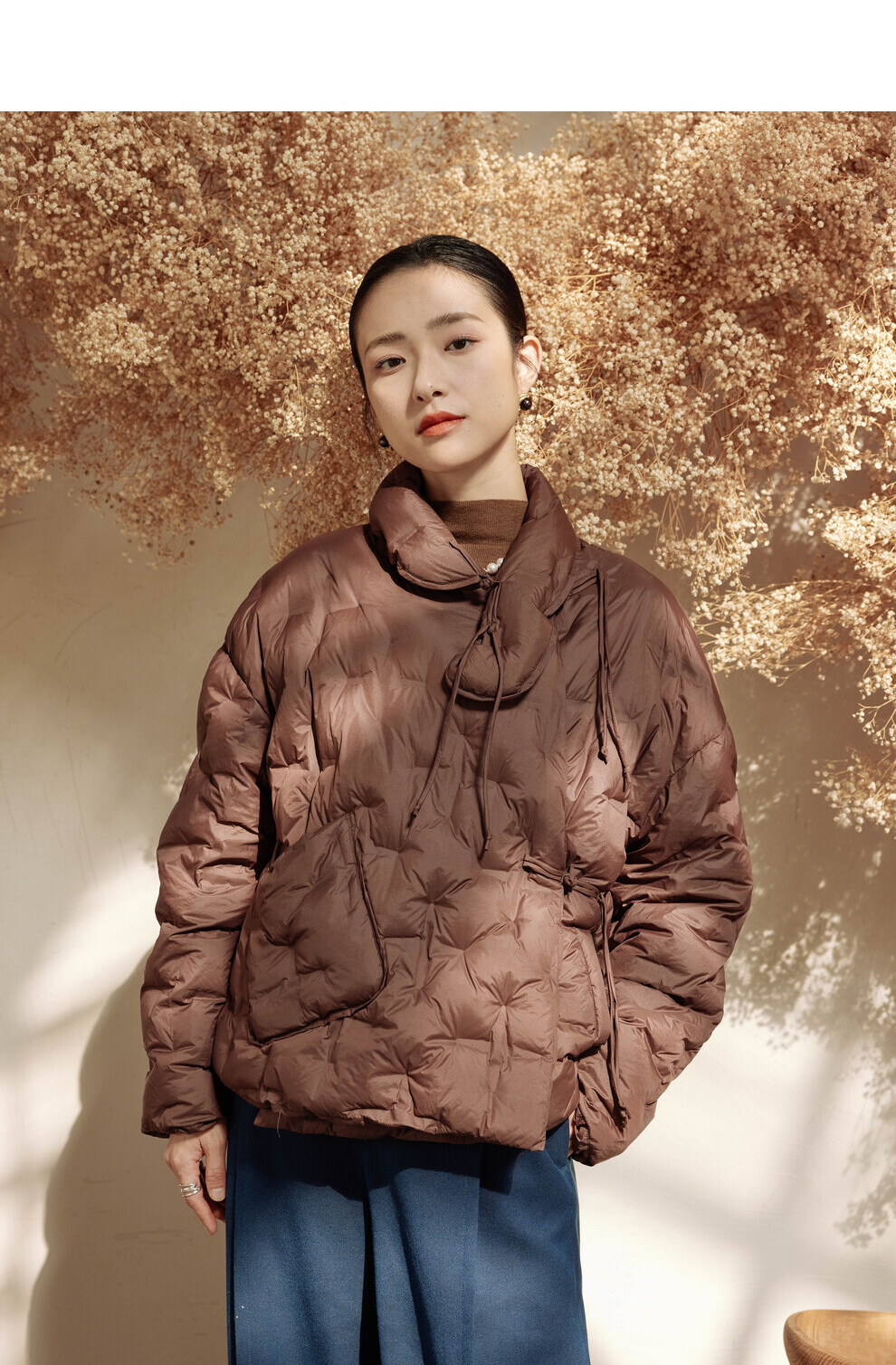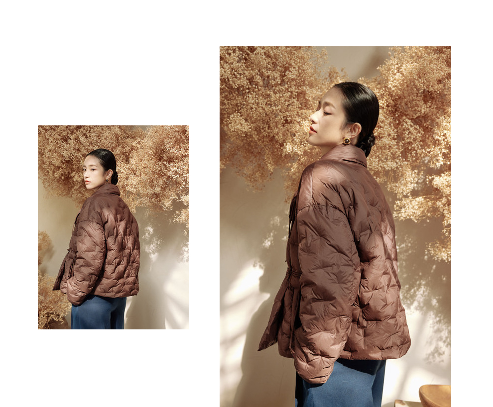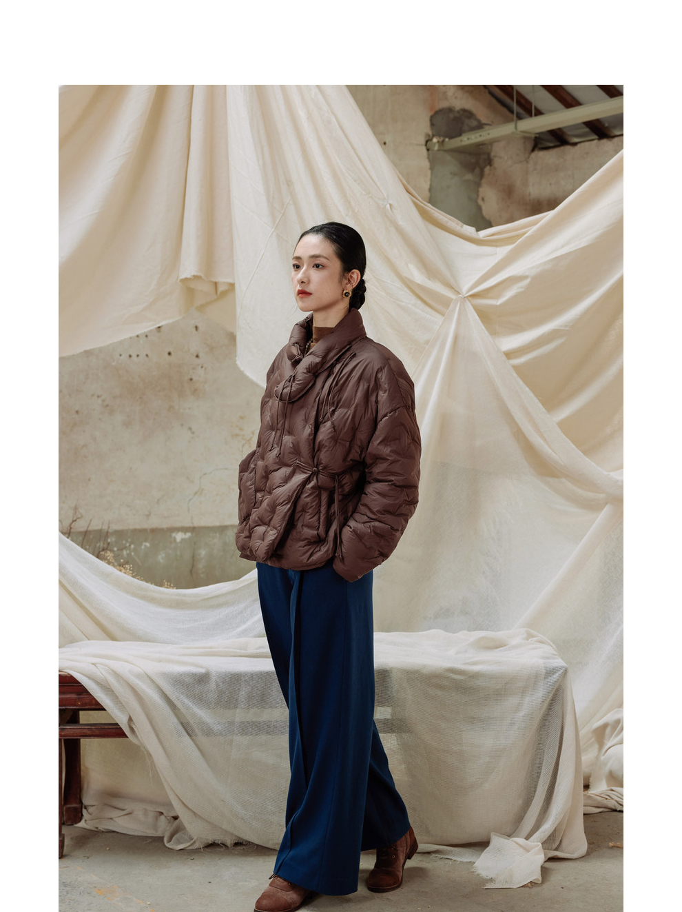 绽放786朵/新中式盘扣系带绗缝不对称圆领咖啡色轻薄短款羽绒服