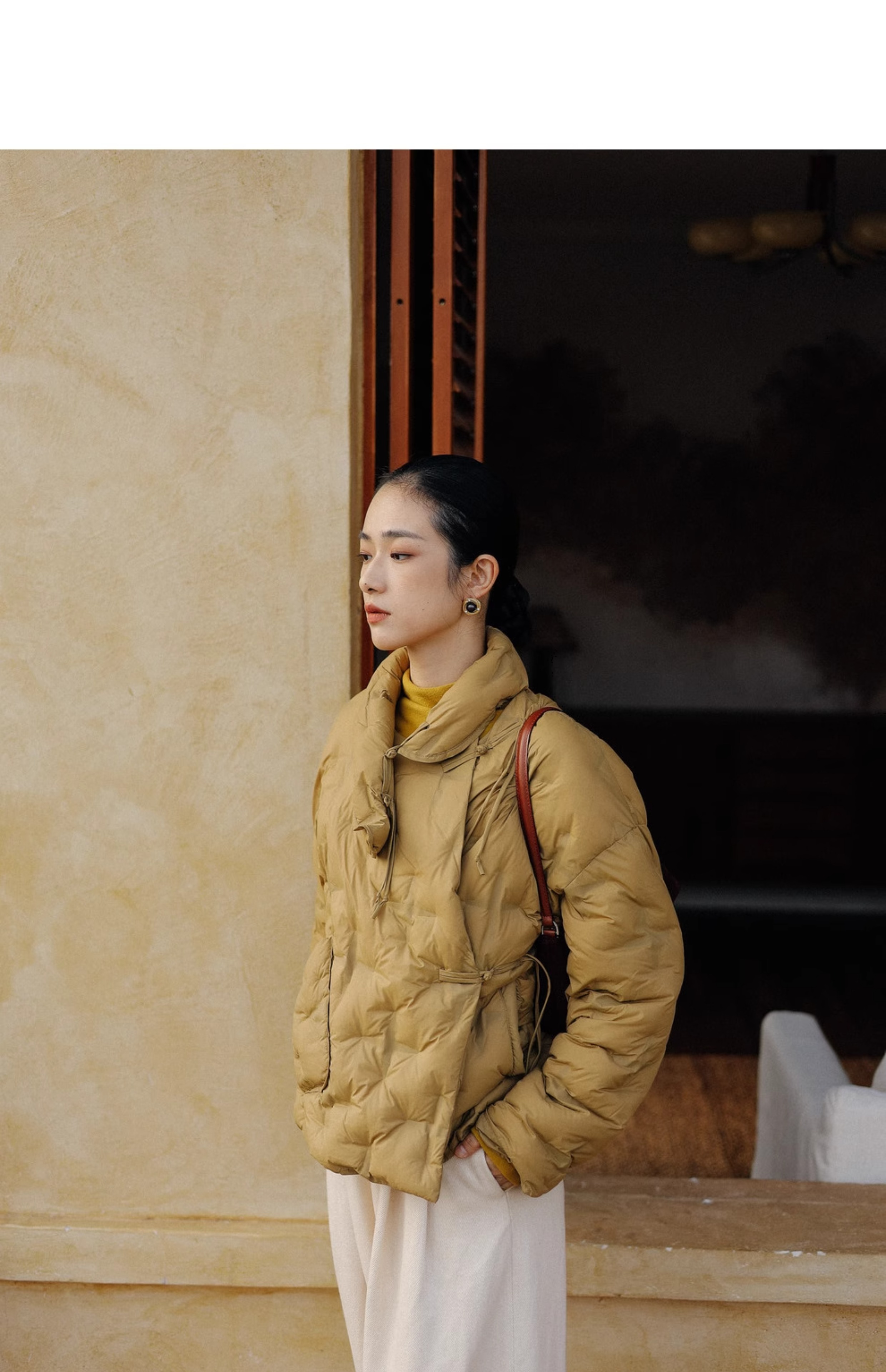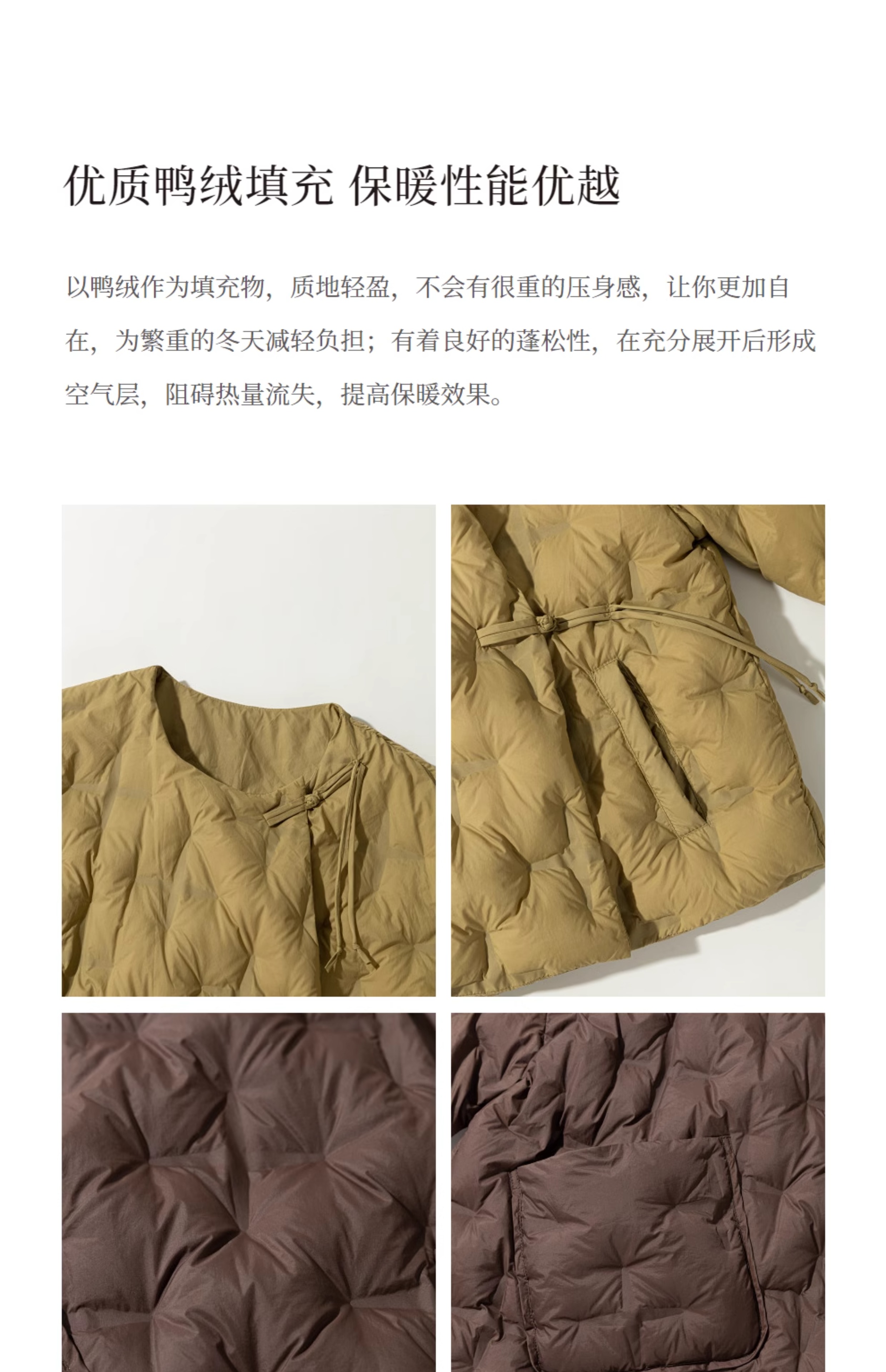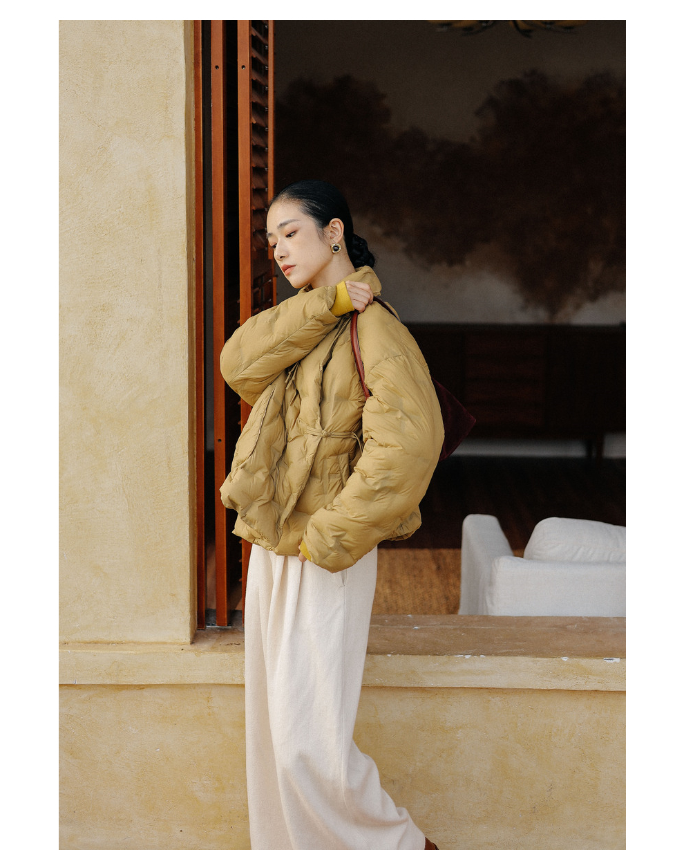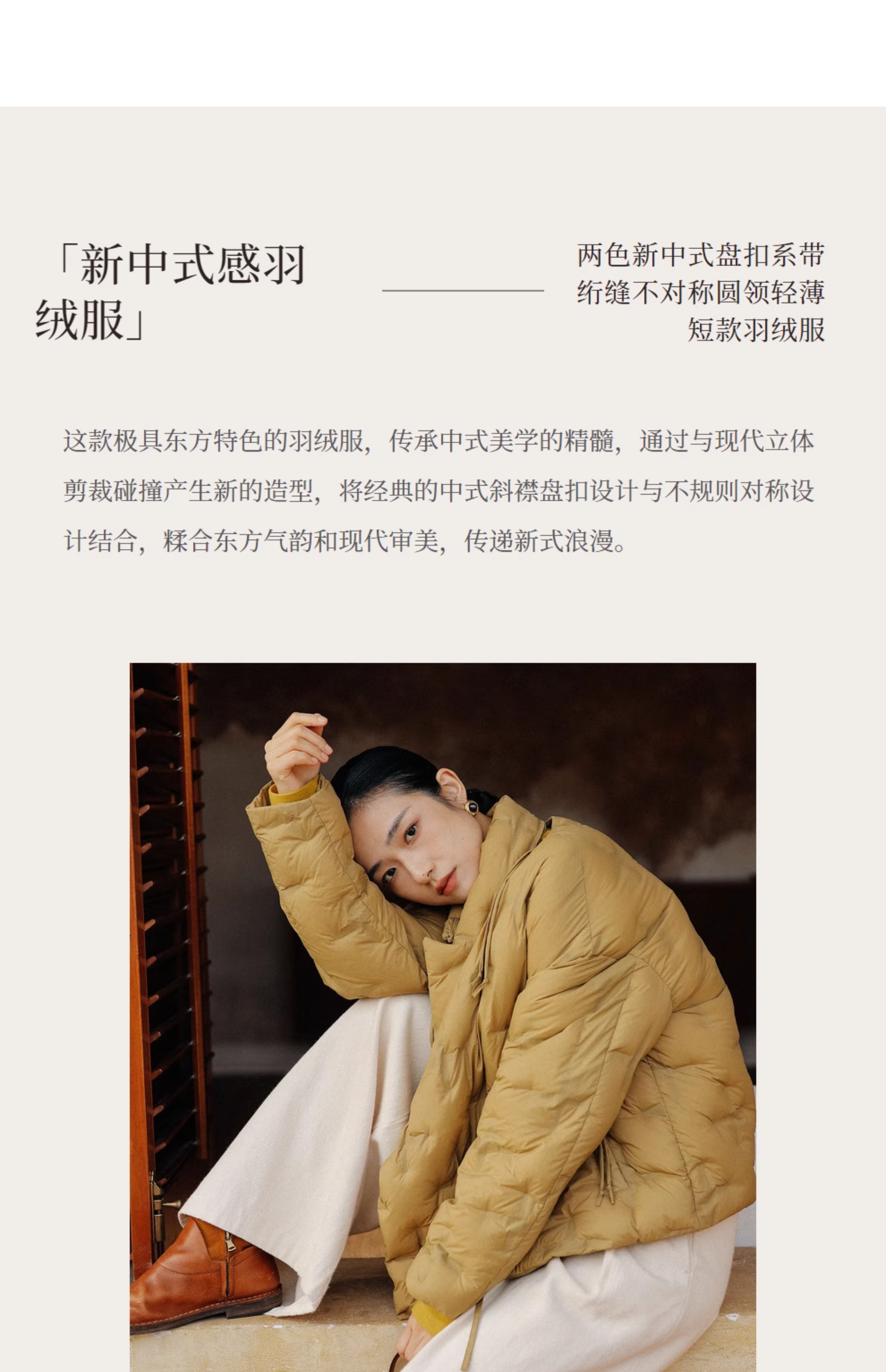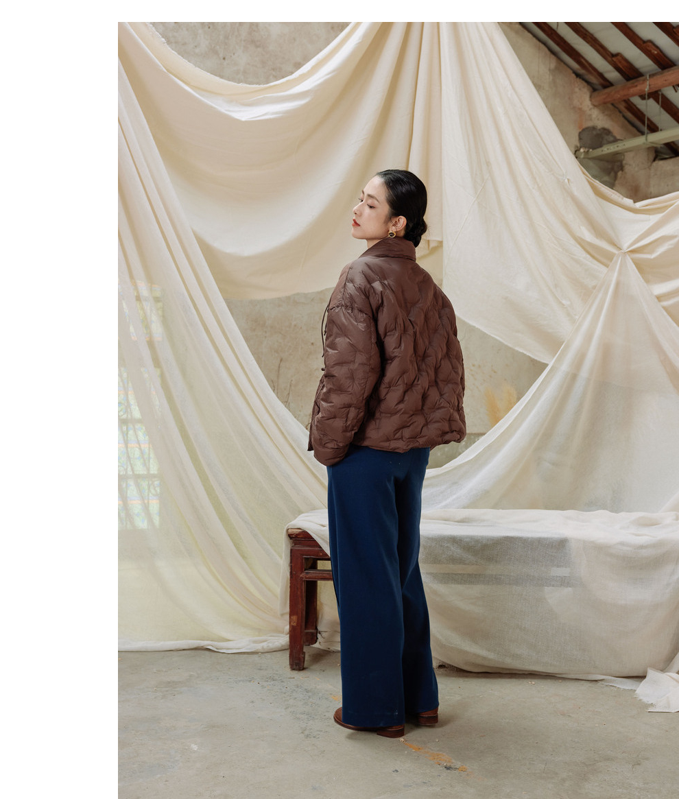 绽放786朵/新中式盘扣系带绗缝不对称圆领咖啡色轻薄短款羽绒服