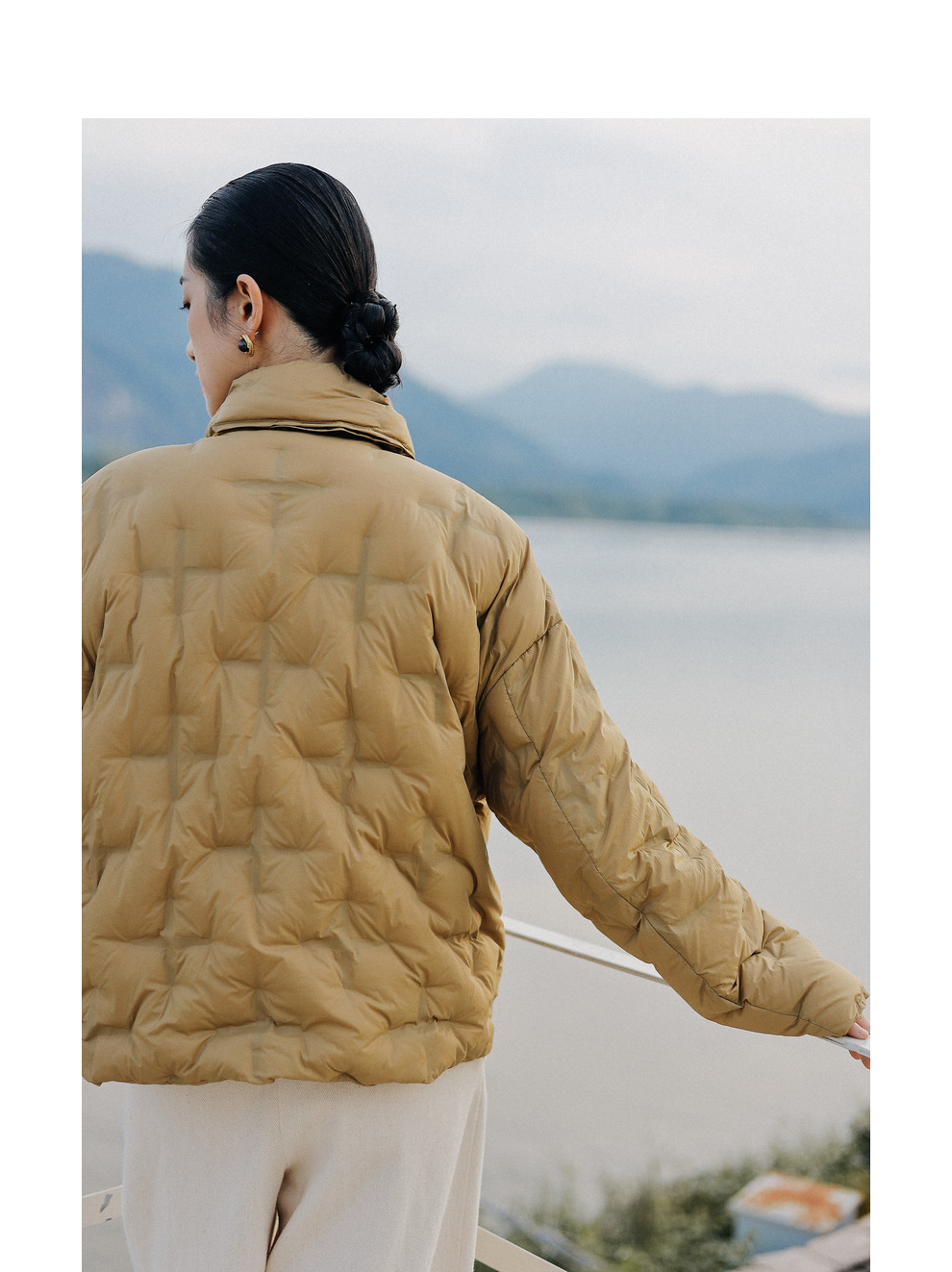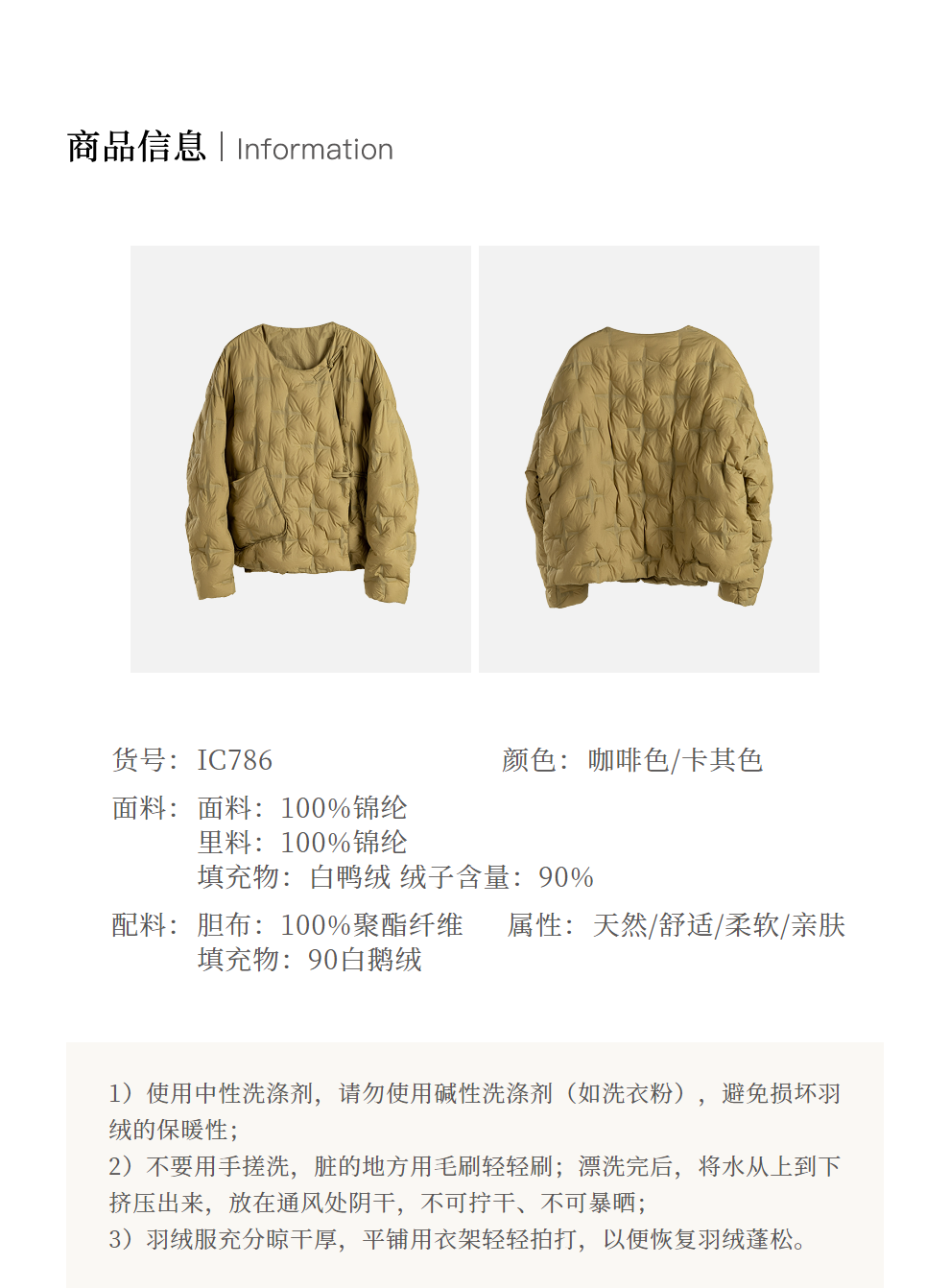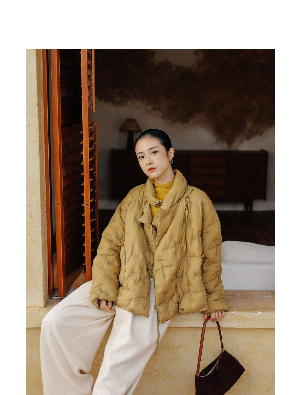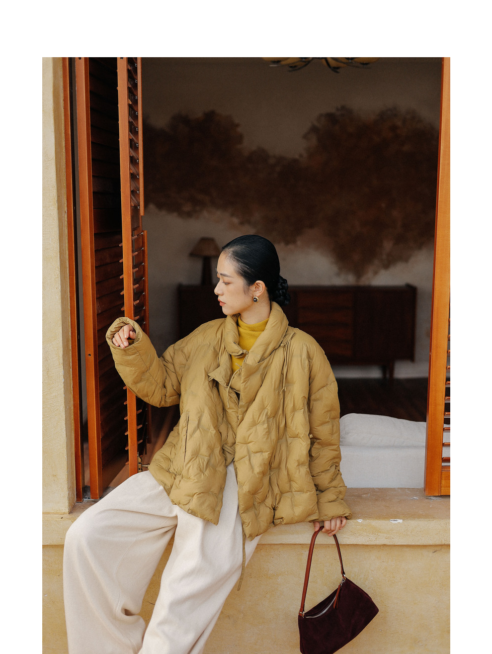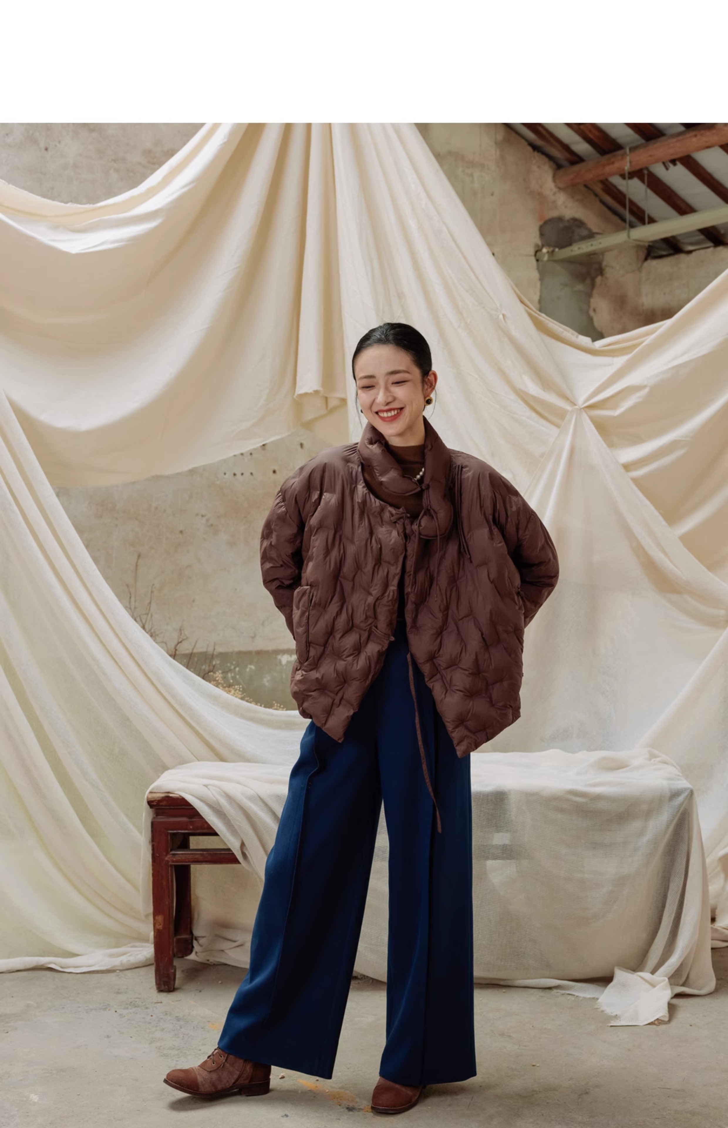 绽放786朵/新中式盘扣系带绗缝不对称圆领咖啡色轻薄短款羽绒服