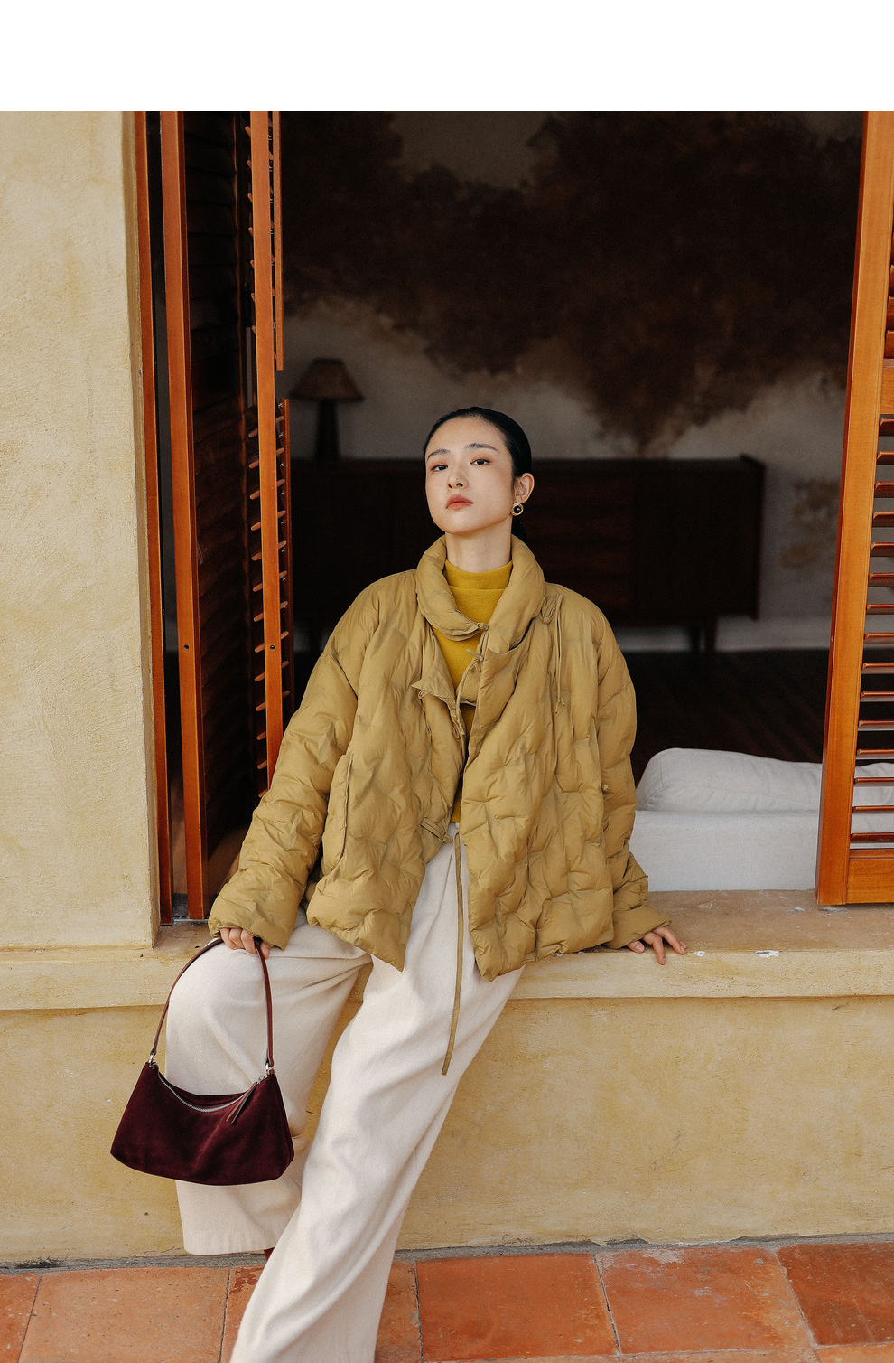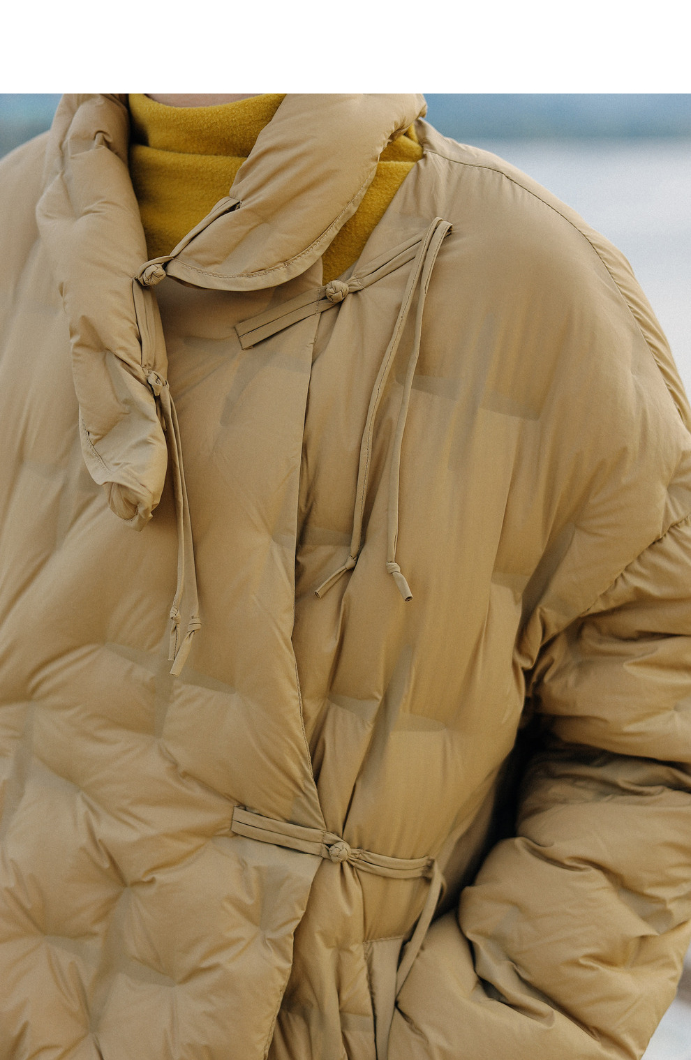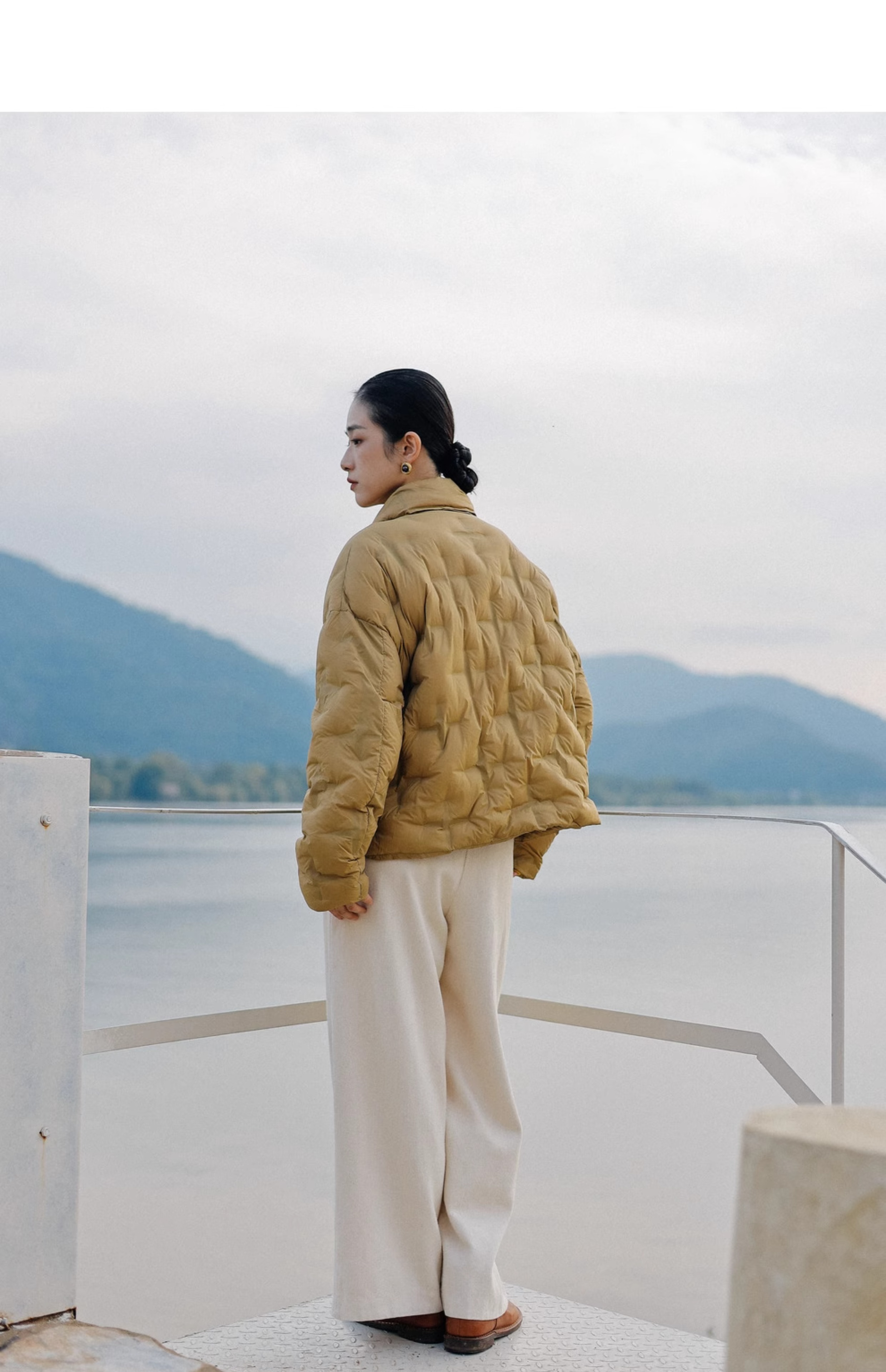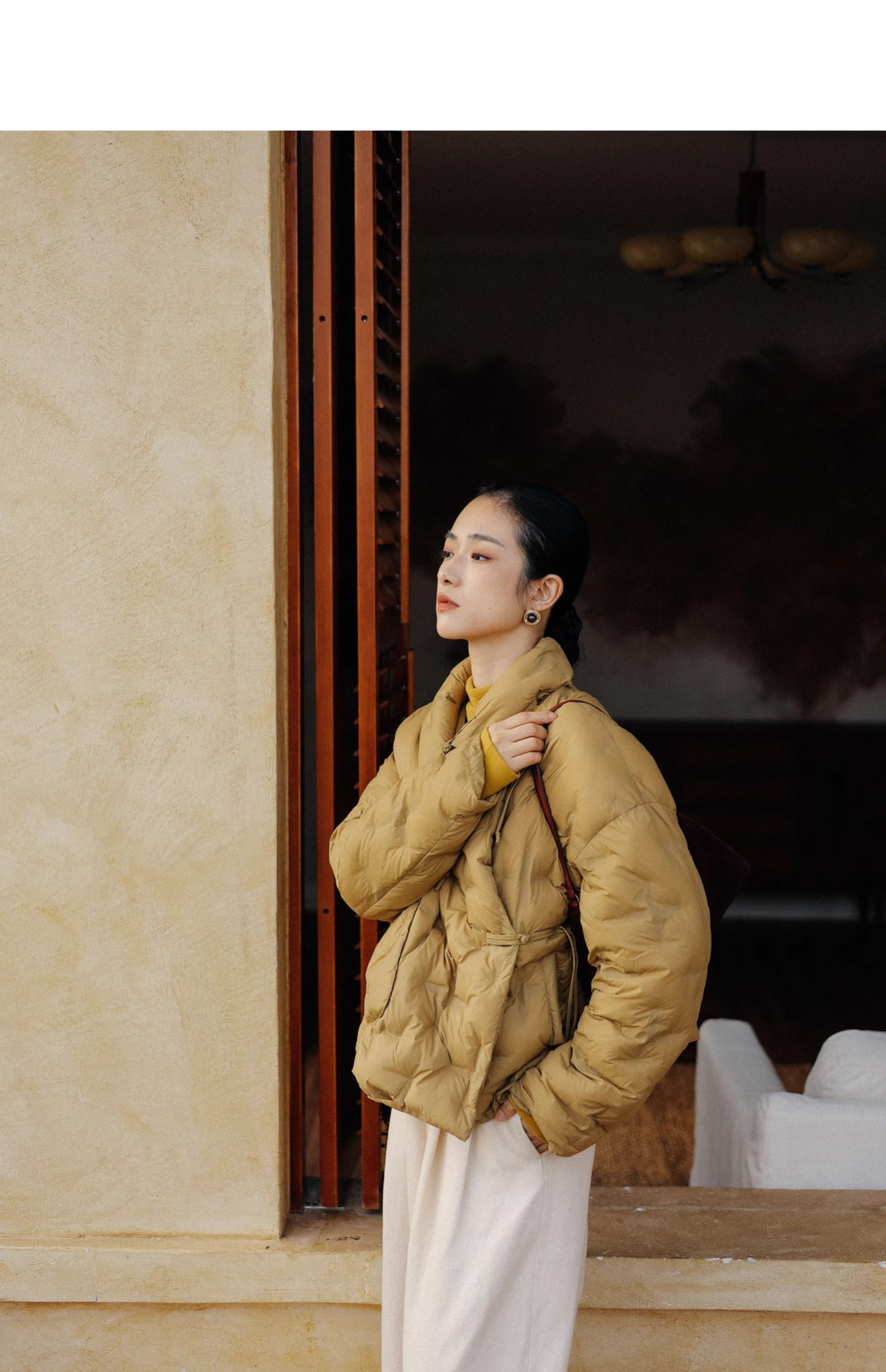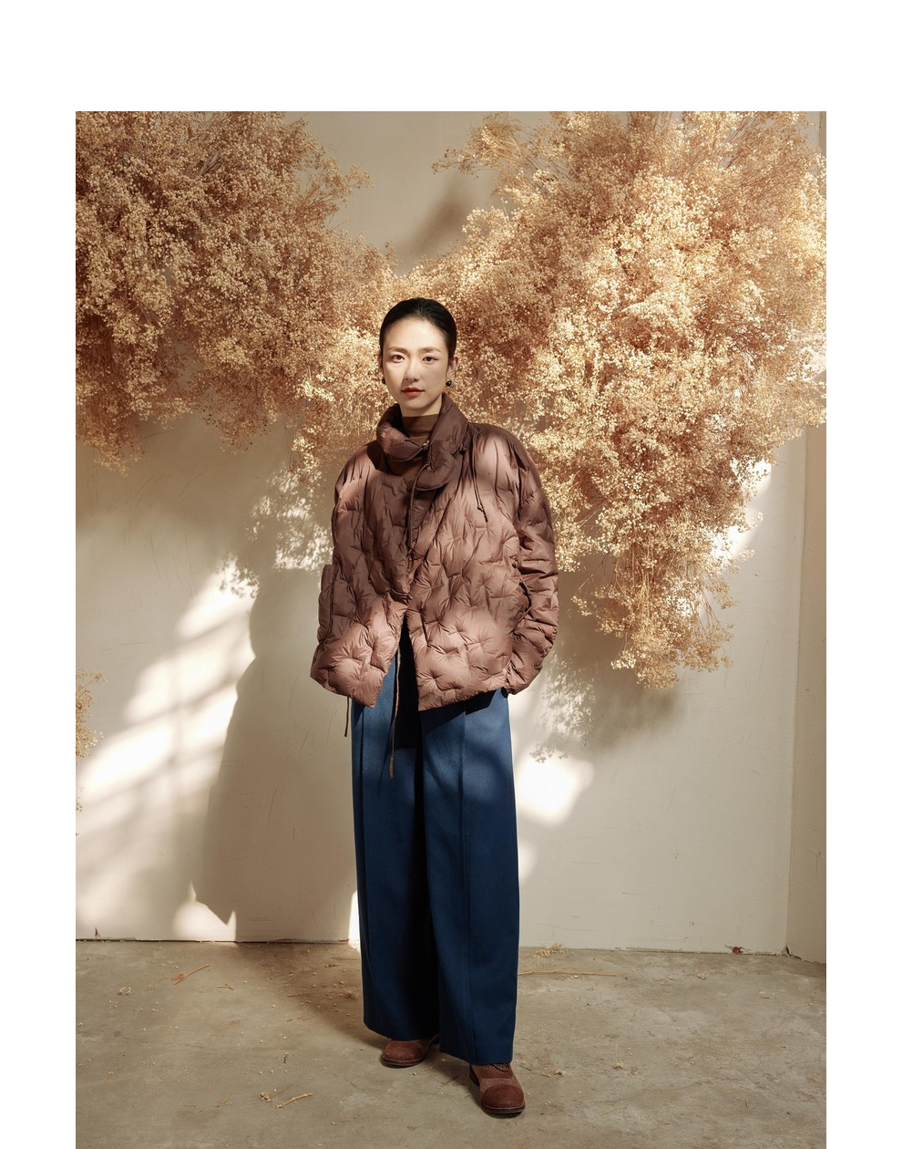 绽放786朵/新中式盘扣系带绗缝不对称圆领咖啡色轻薄短款羽绒服