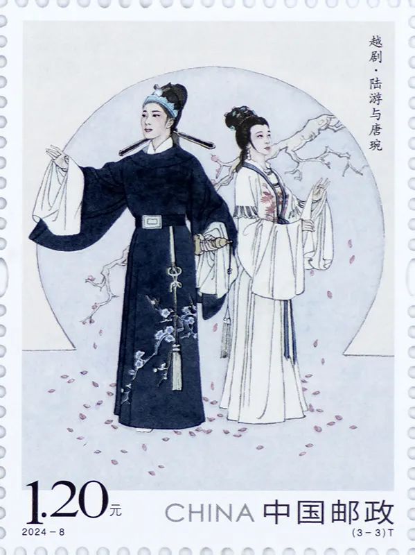 中国邮政将于 2024 年 5 月 20 日发行《越剧》特种邮票 1 套 3 枚,邮票图案分别为《梁山伯与祝英台》《九斤姑娘》和《陆游与唐琬》。该套邮票计划发行数量为 670 万套。