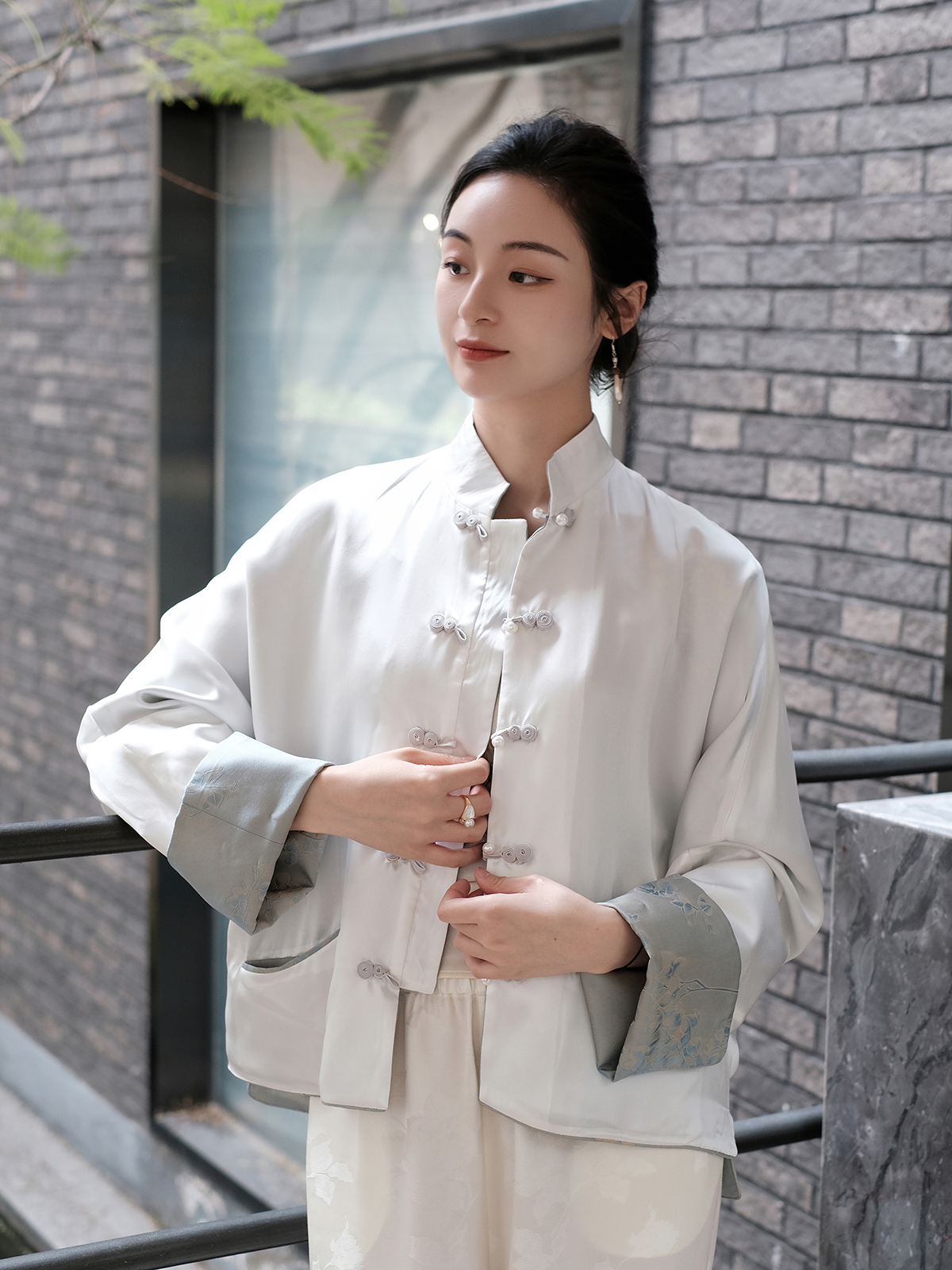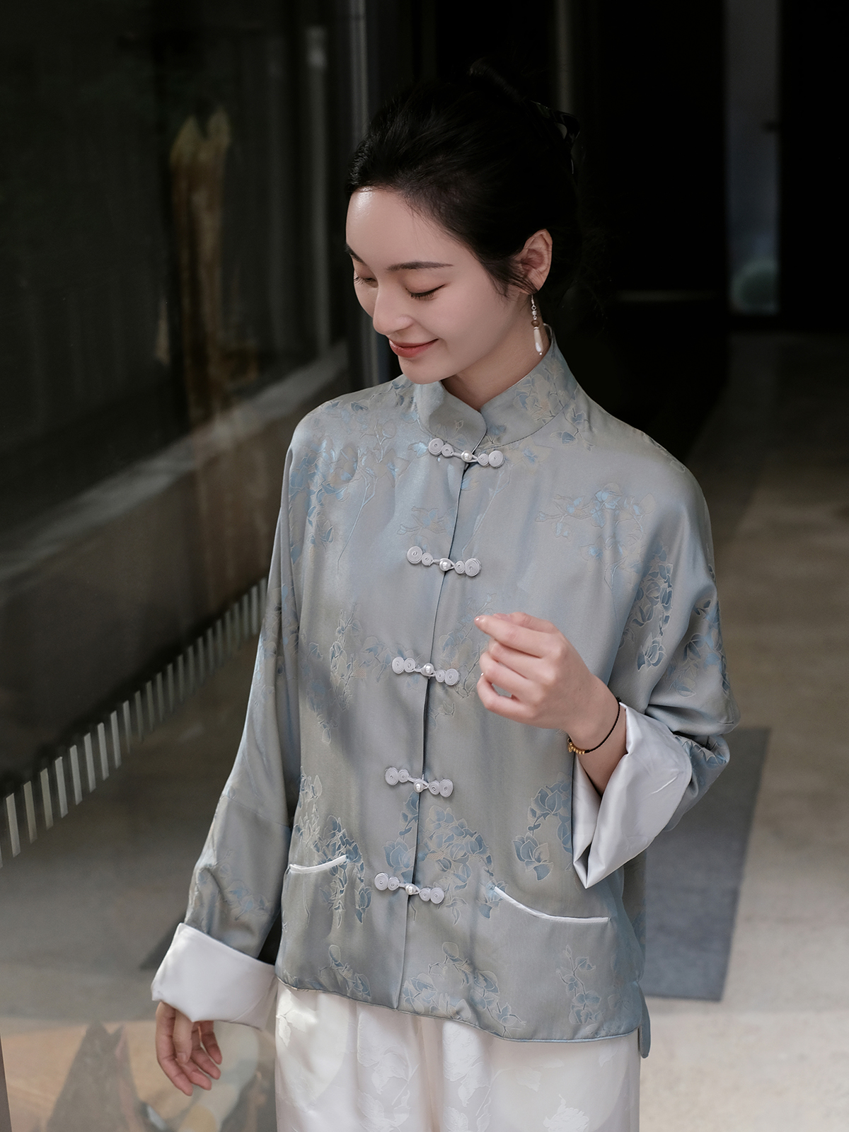 盛唐牡丹 |桃之夭夭蓝灰色真丝双面穿外套(不夹棉)
