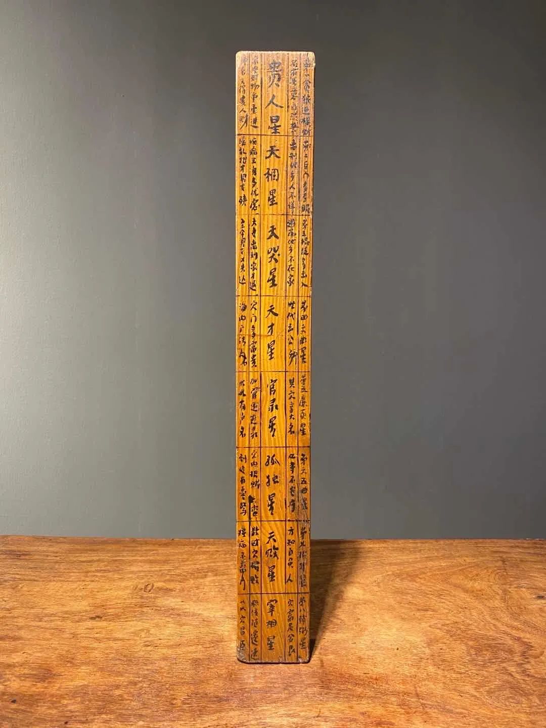 此件传统鲁班尺以杉木制作,剛劲挺拔的墨书标示成完整鲁班尺,形式遵循古制无一疏漏,清代书法与温润的包浆皮壳呈现历年使用过程与痕迹。