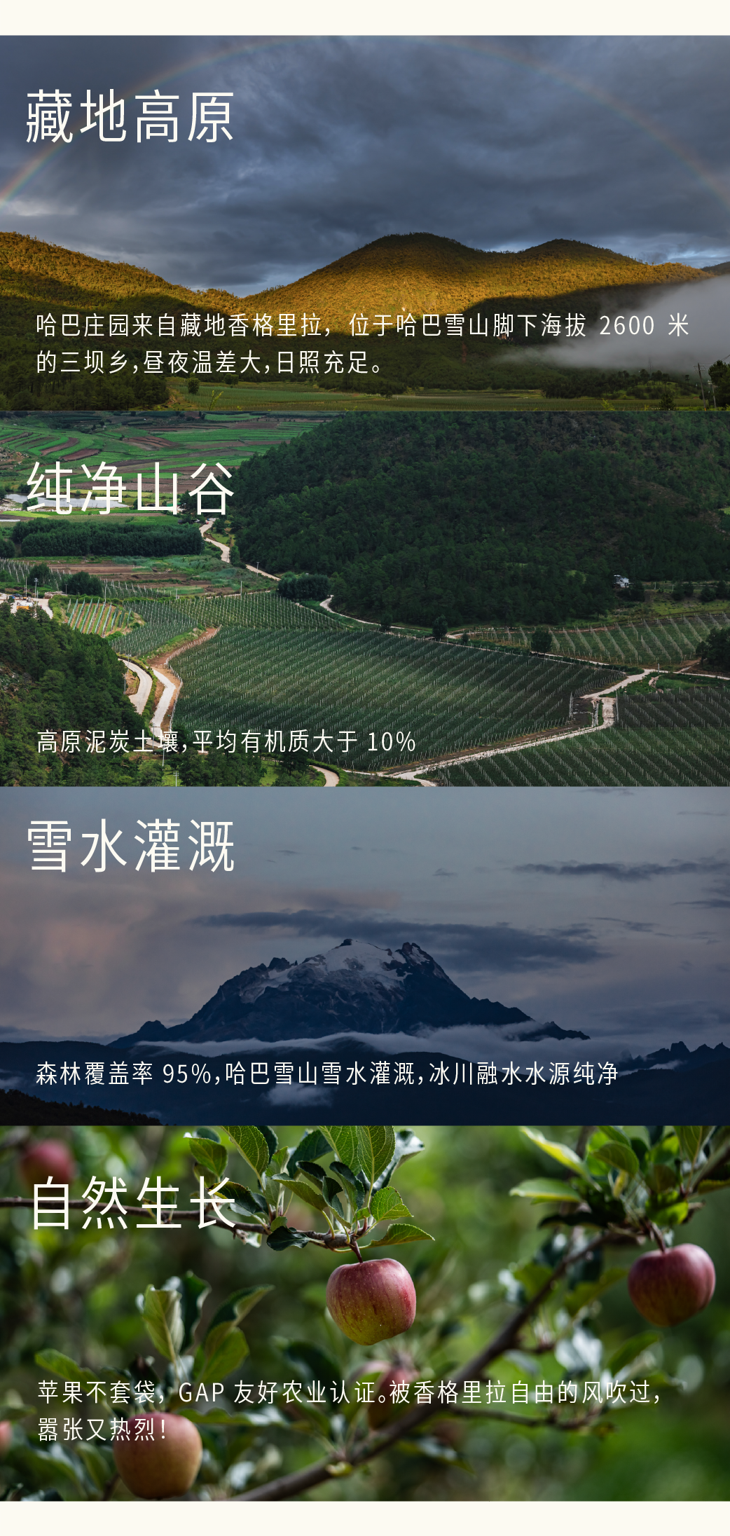 庄园位于哈巴雪山脚下,这里的苹果,自然生长,不套袋,获得GAP友好农业认证,独特的地理环境和气候,让它们拥有独特的香气和爽脆口感。