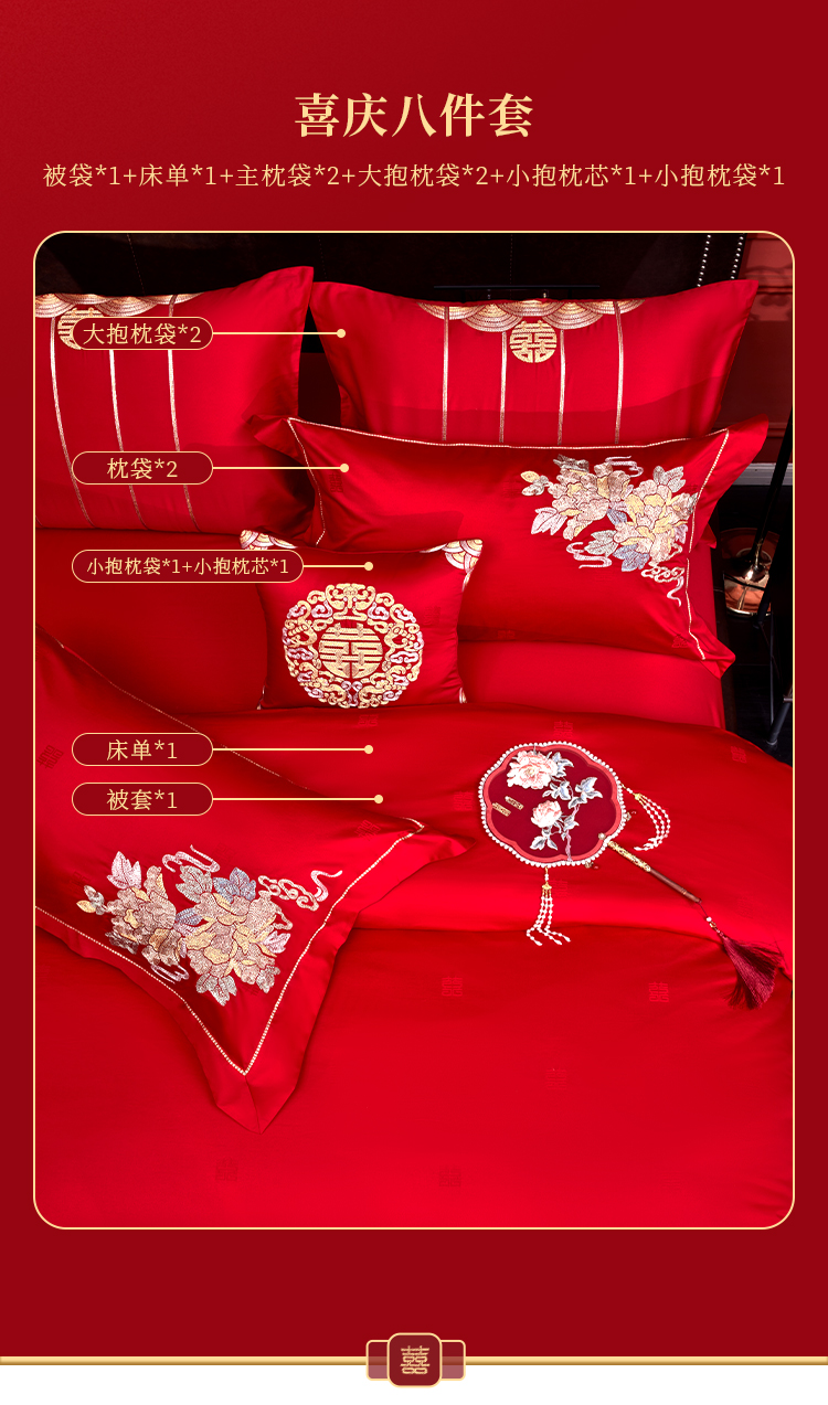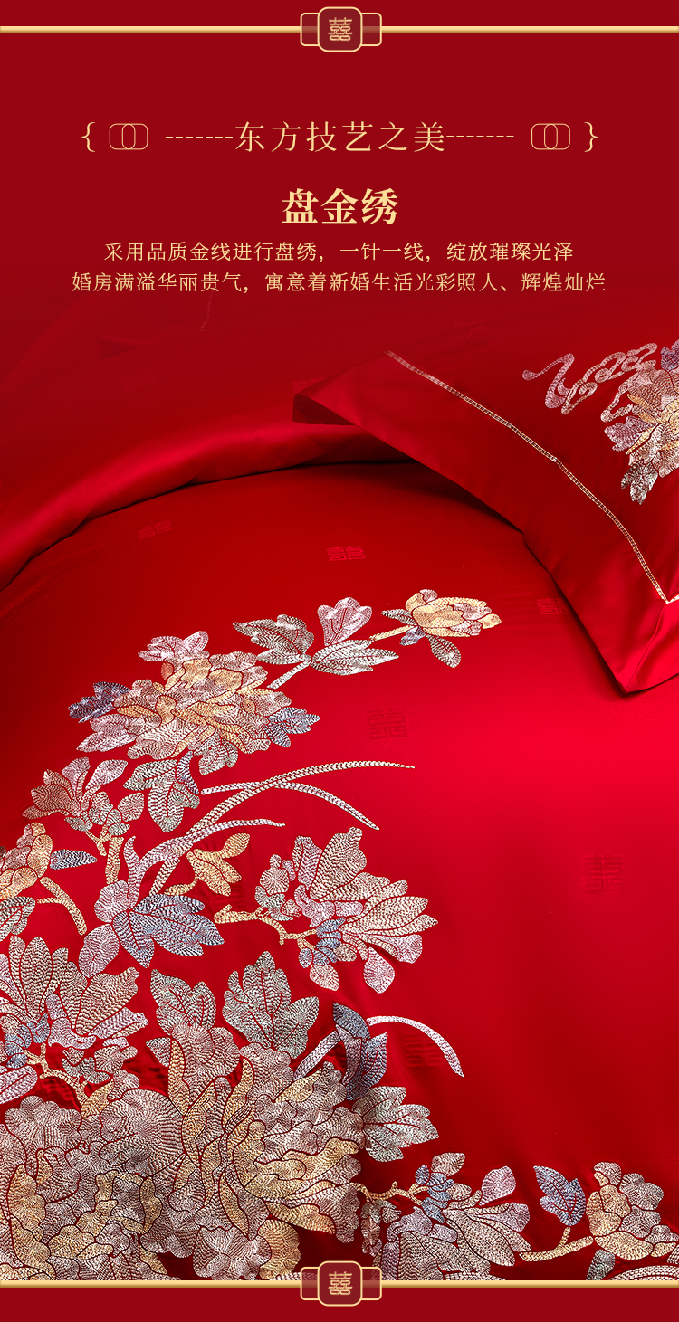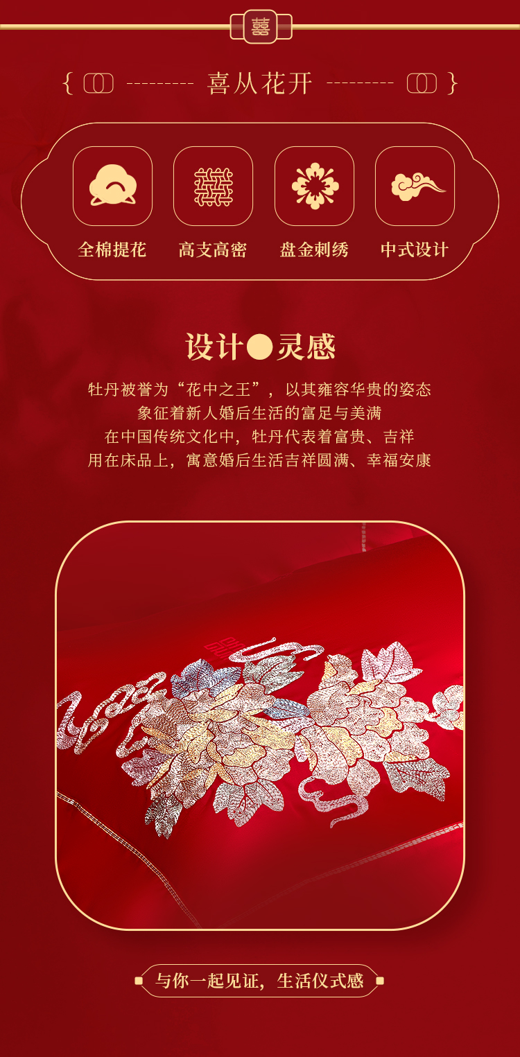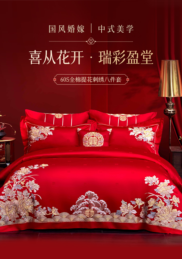 多喜爱 60S全棉提花刺绣八件套 喜从花开【拉杆行李箱包装】【60S全棉提花】【盘金刺绣】【立体提花工艺】高支高密 国风婚嫁 中式美学 色泽亮丽 手感细腻 织物柔软