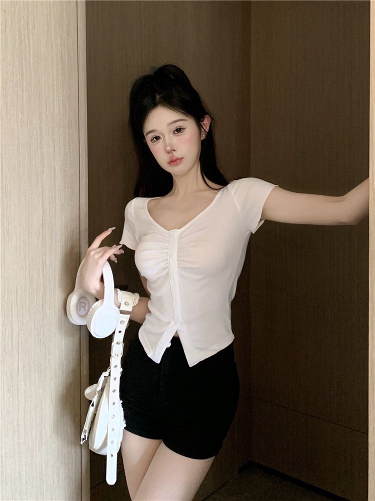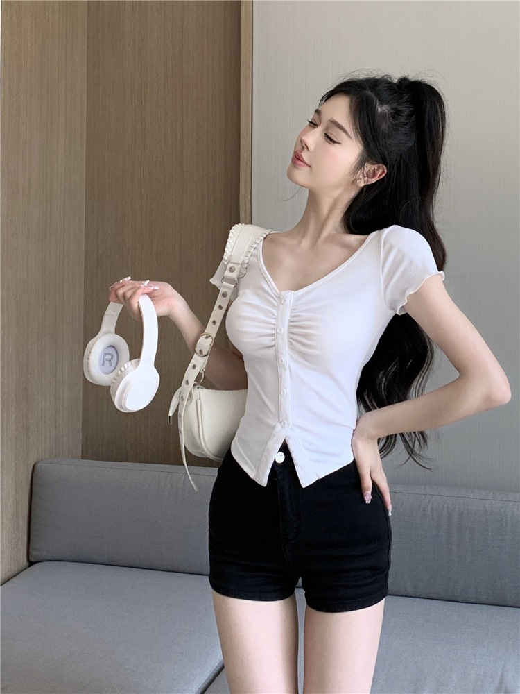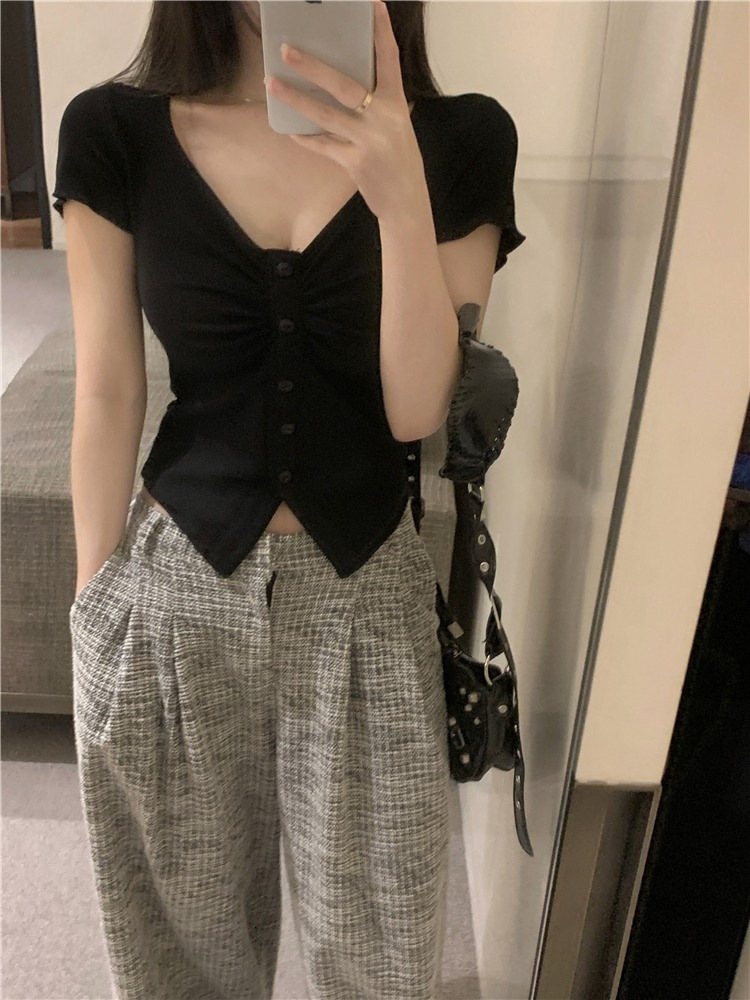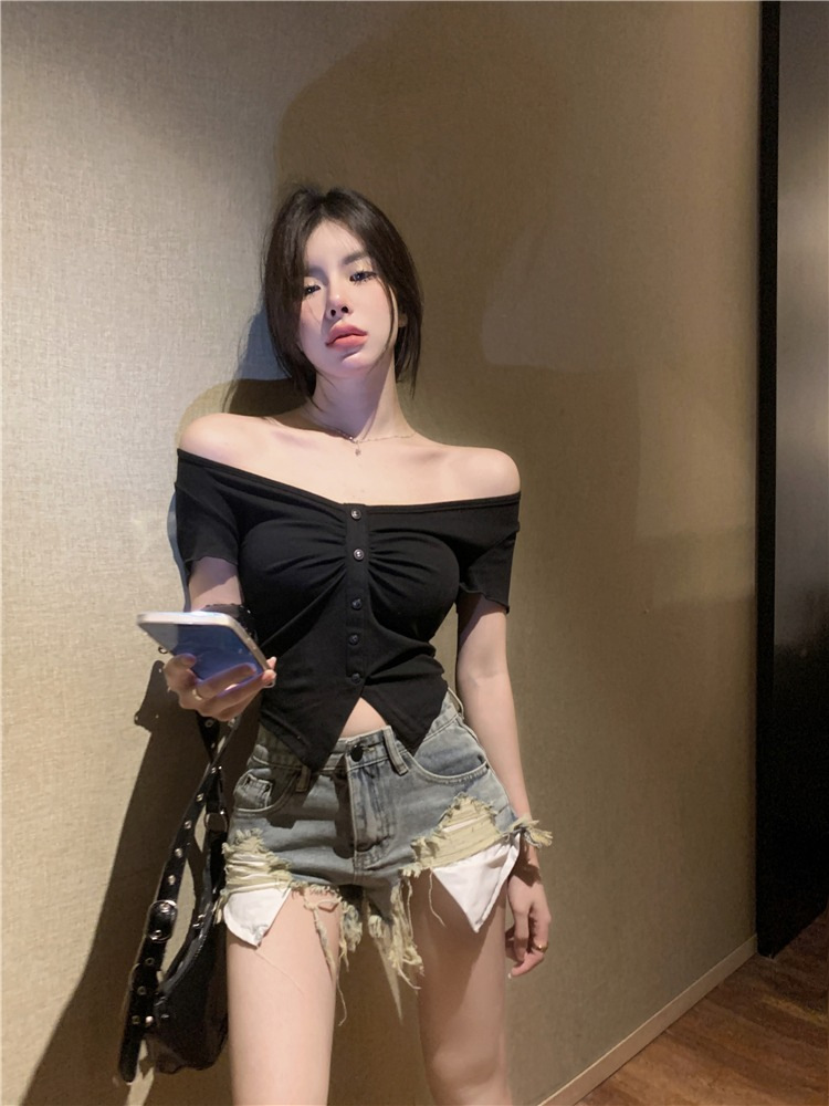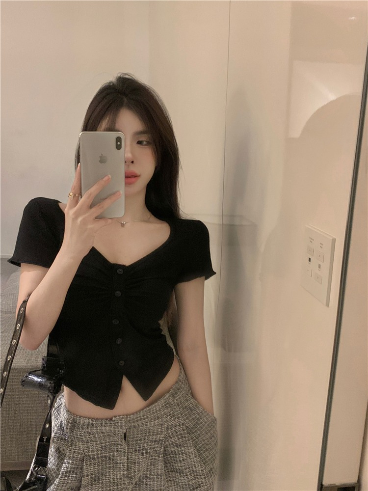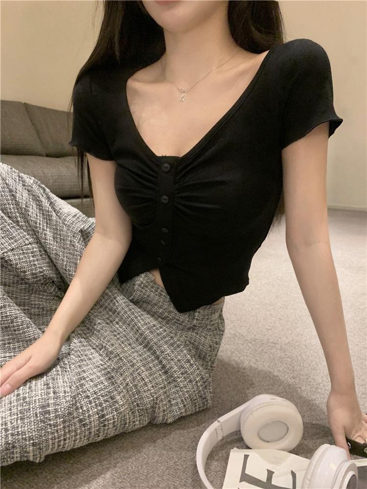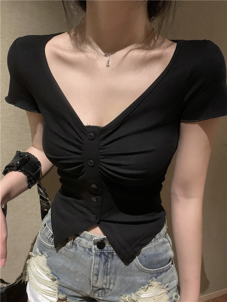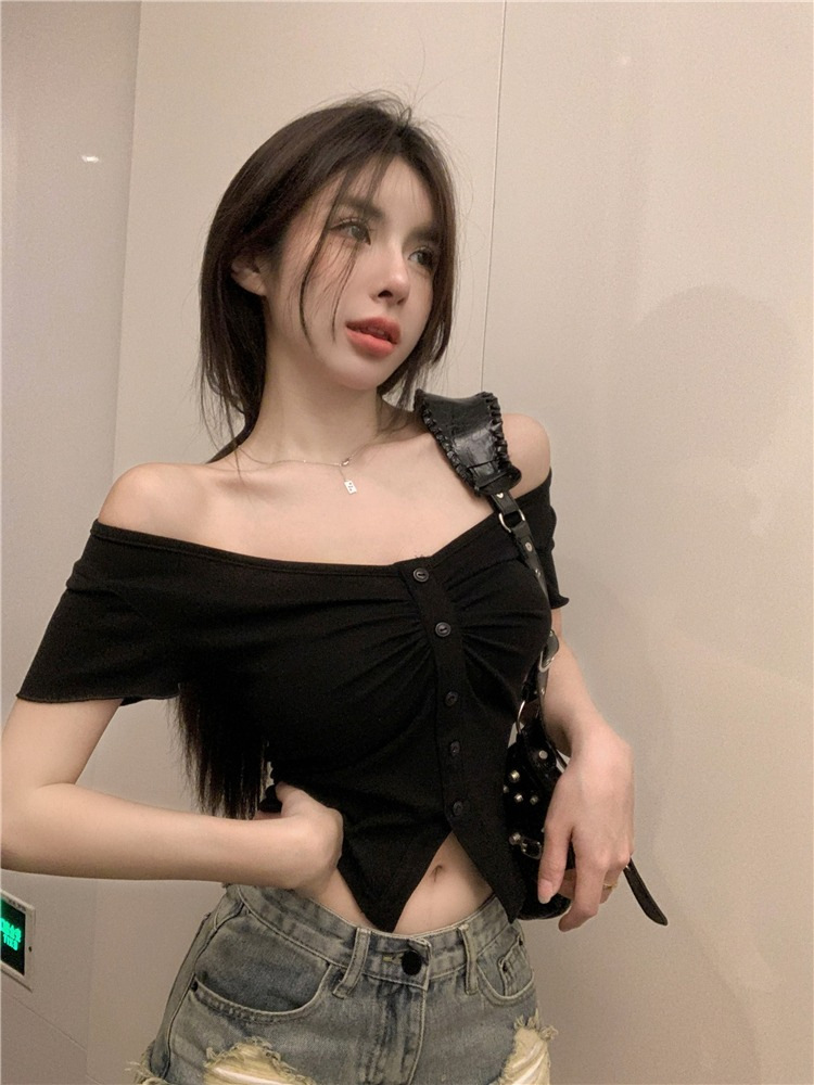 【夏性感V领,时尚夏日必备!】短款修身一字肩褶皱不规则短袖上衣,女装夏季黑色辣妹美式紧身T恤-lm!