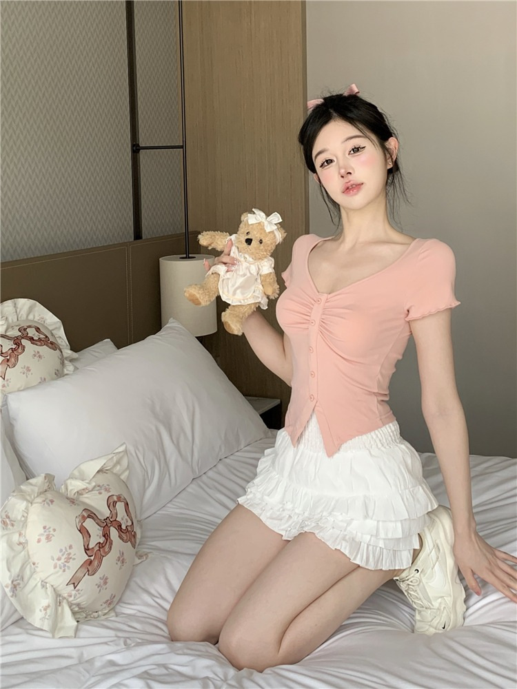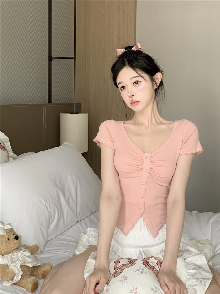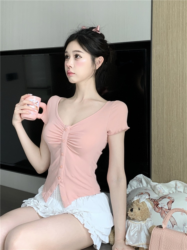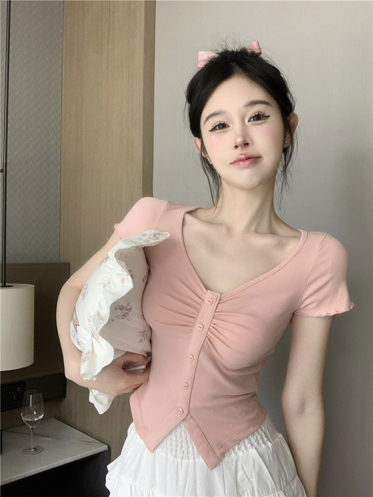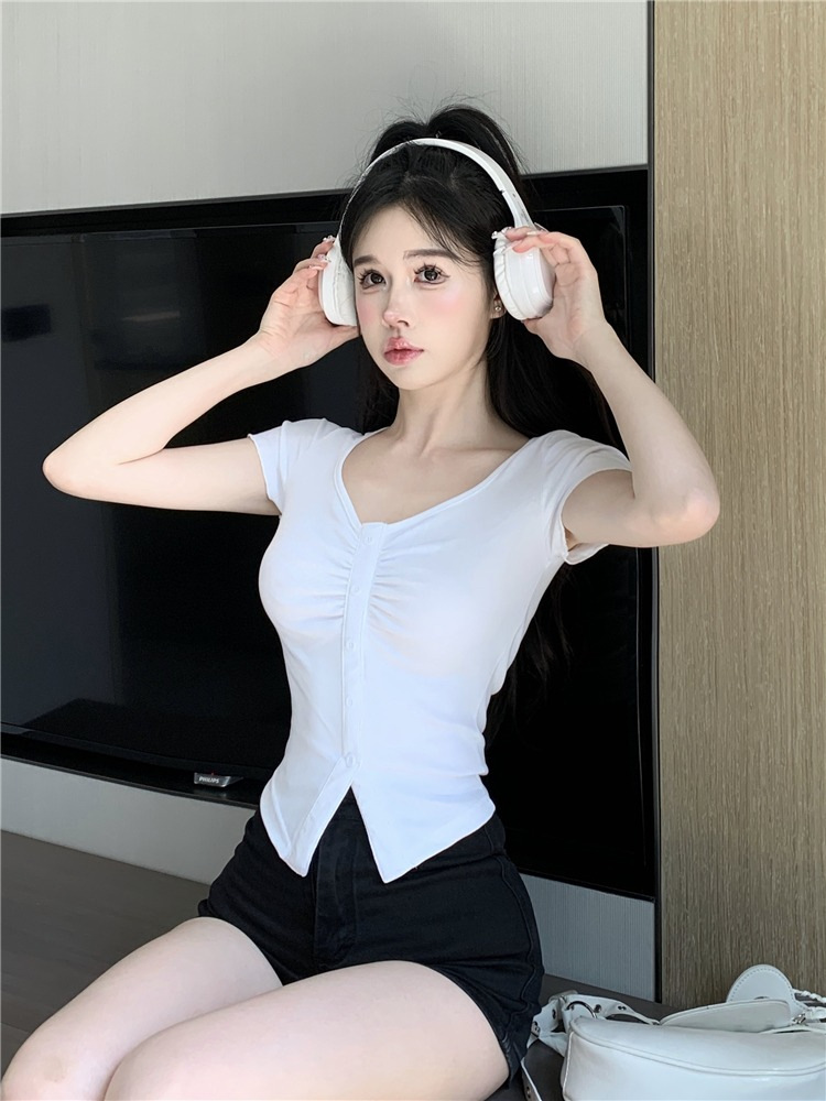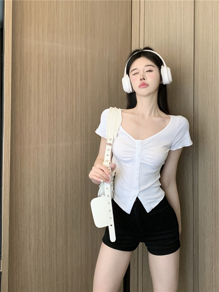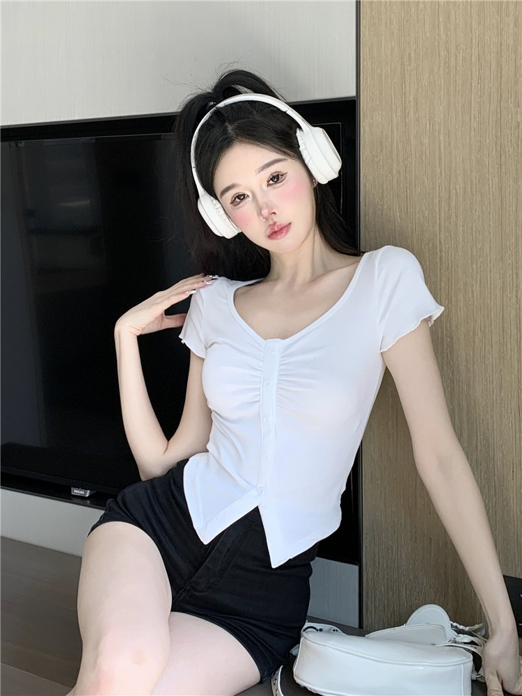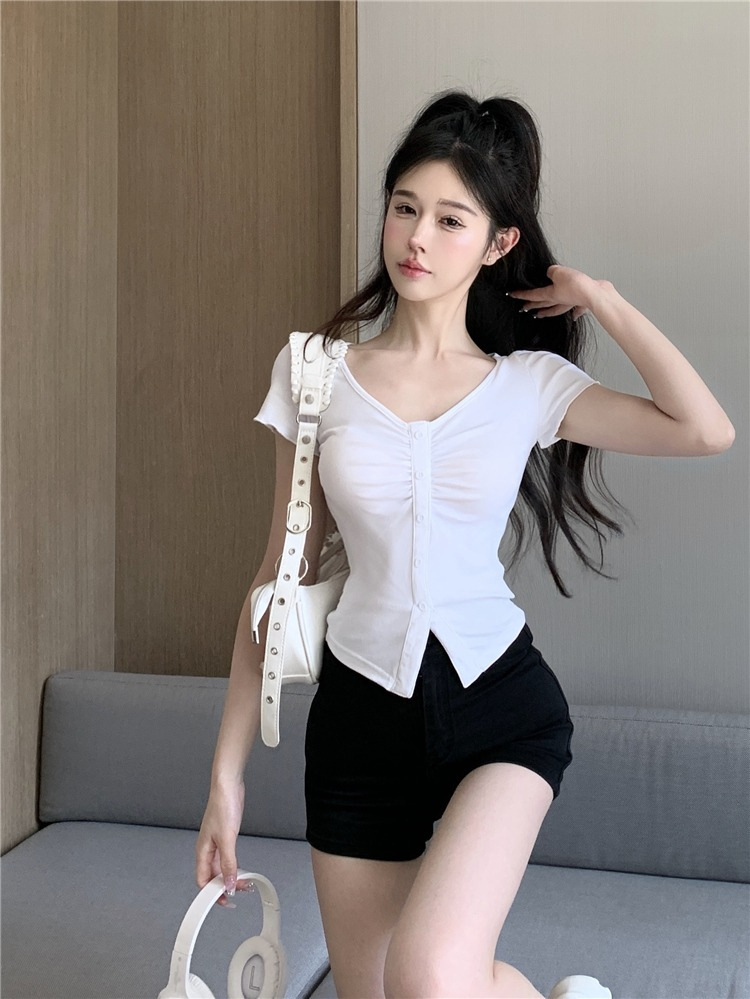【夏性感V领,时尚夏日必备!】短款修身一字肩褶皱不规则短袖上衣,女装夏季黑色辣妹美式紧身T恤-lm!