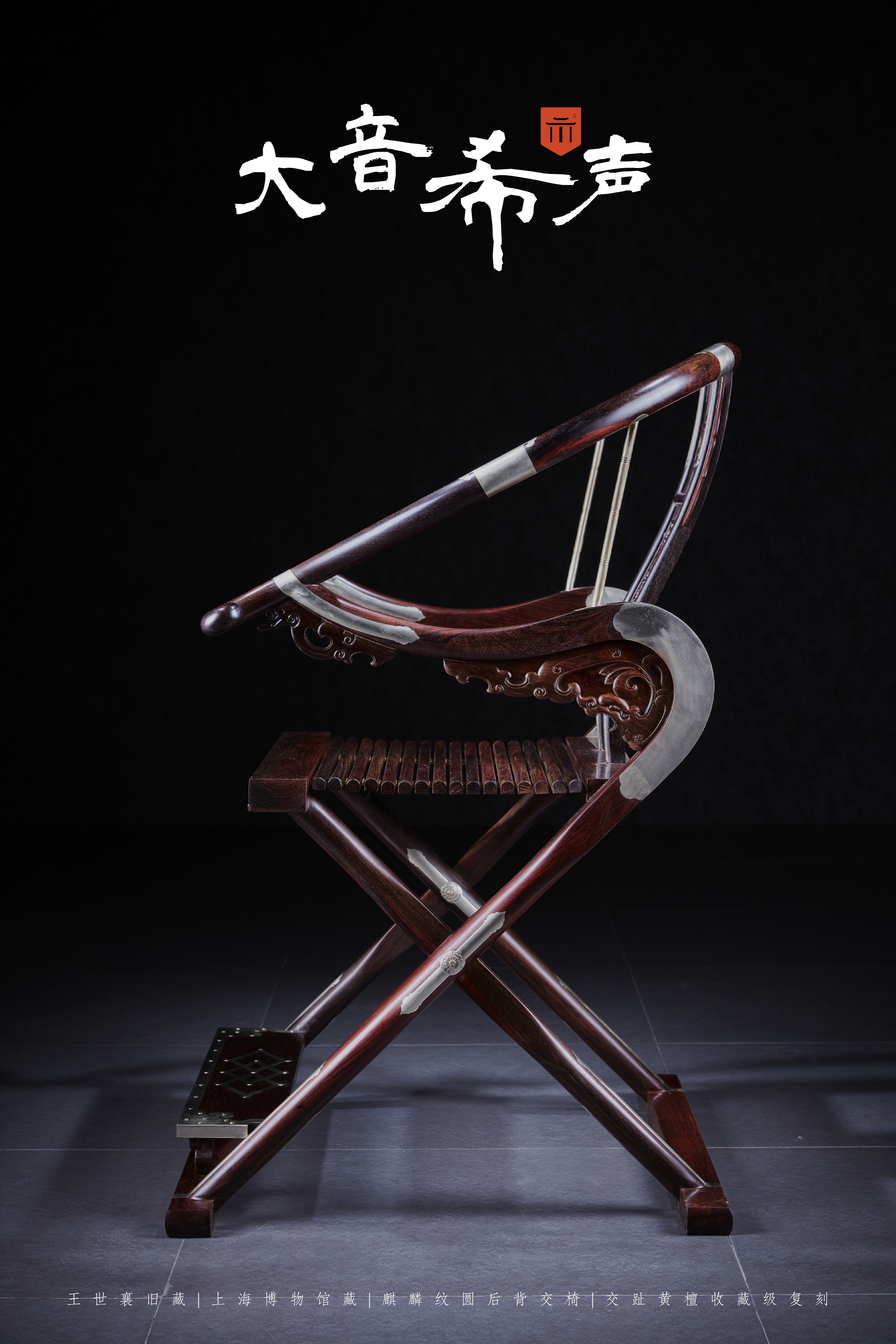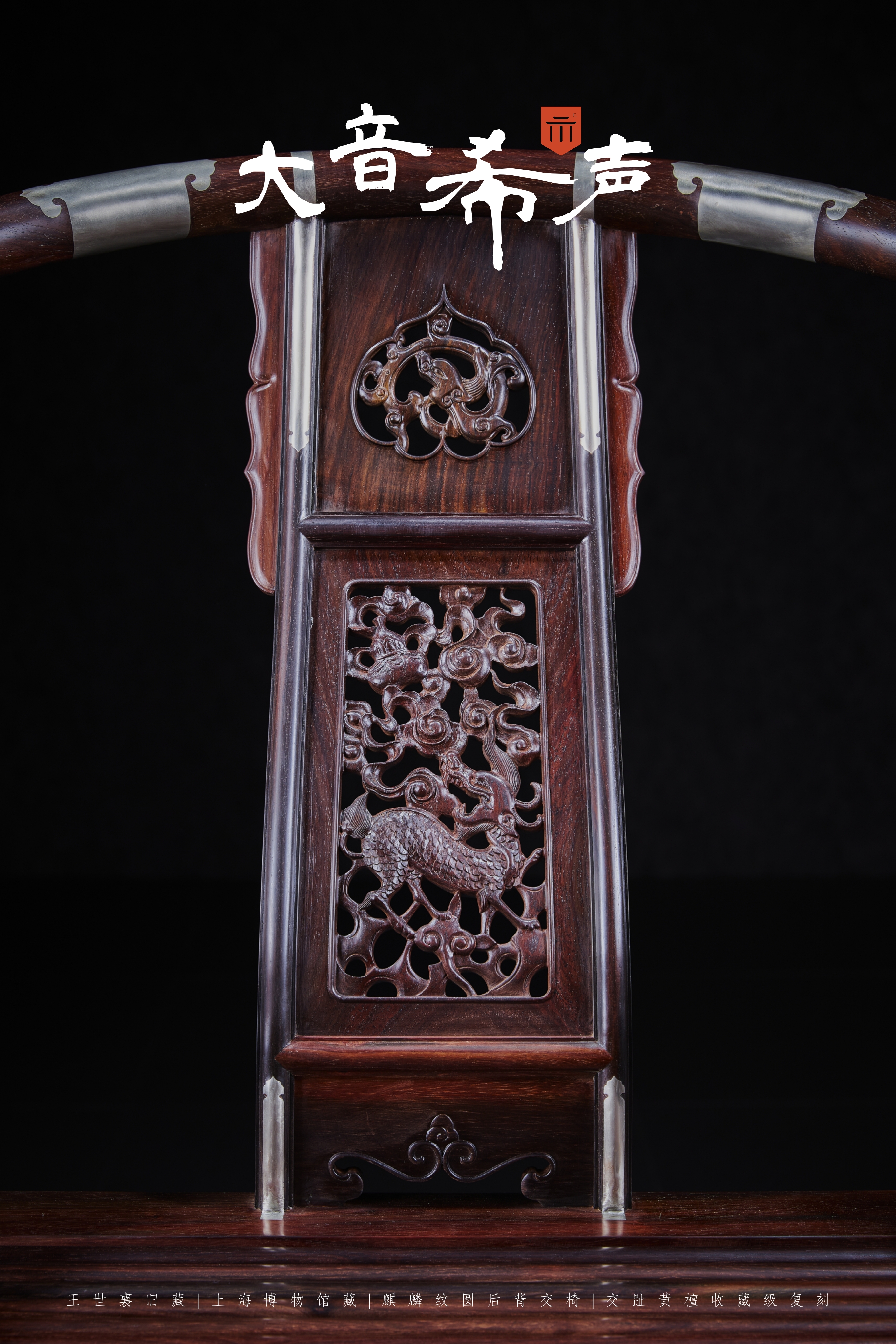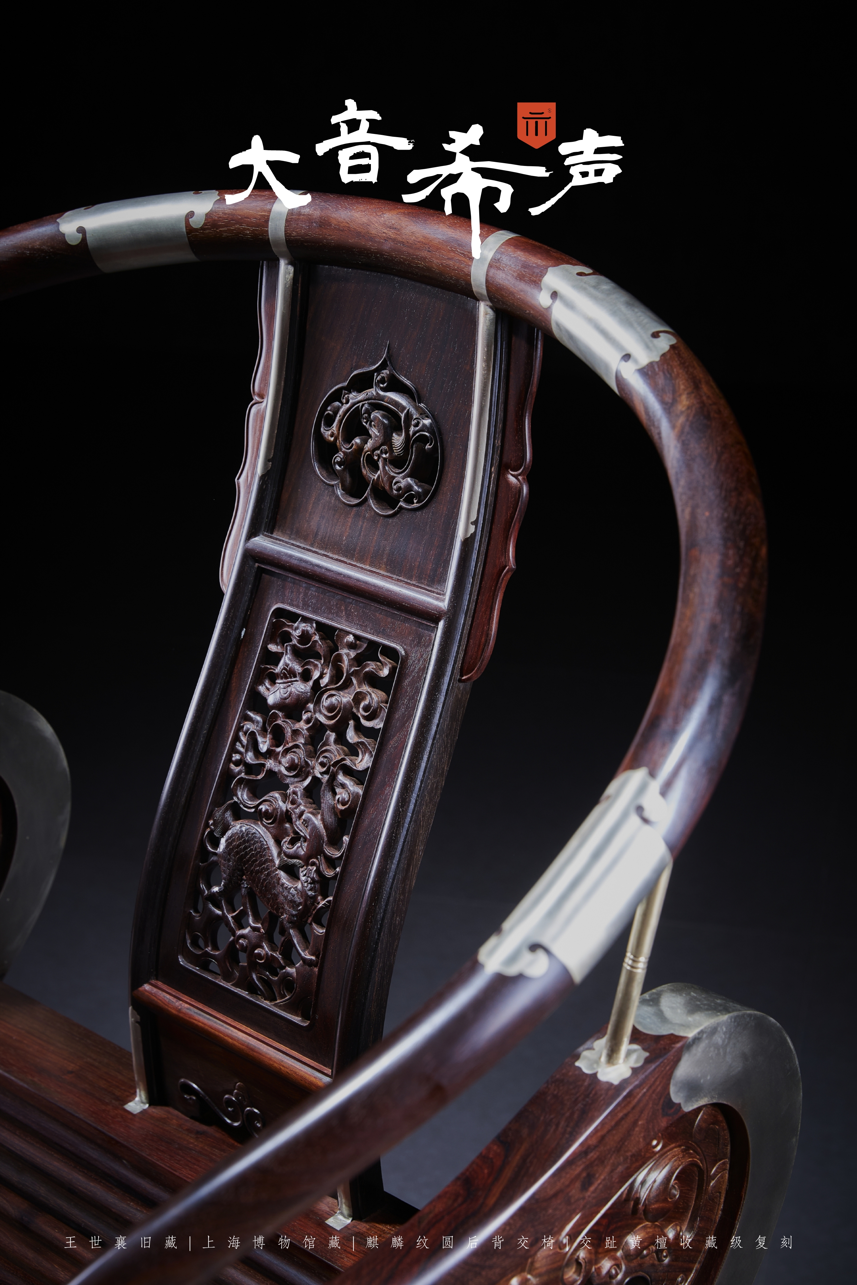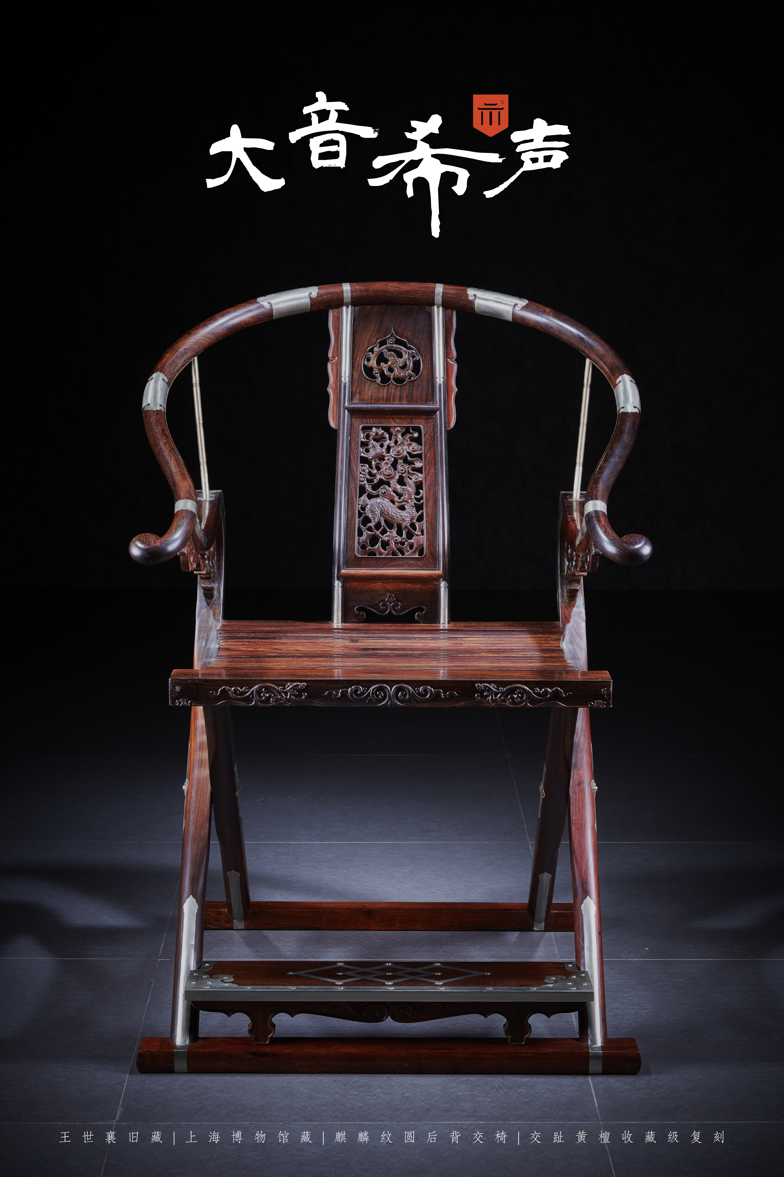 尤以这把王世襄旧藏黄花梨圆后背交椅,为众多行业人士,学习、复刻、研究的标准器,三截攒框镶板靠背,上部如意开光透雕螭龙纹,中部透雕麒麟、葫芦、山石、灵芝,下部亮脚起卷草纹阳线,嵌铜使其坚固,至精者,加微改良,施平嵌,工艺更为复杂,整体更为平顺,交椅在古时更为权势象征,今人多做主椅,赠长辈、领导,置空间显位营造氛围。