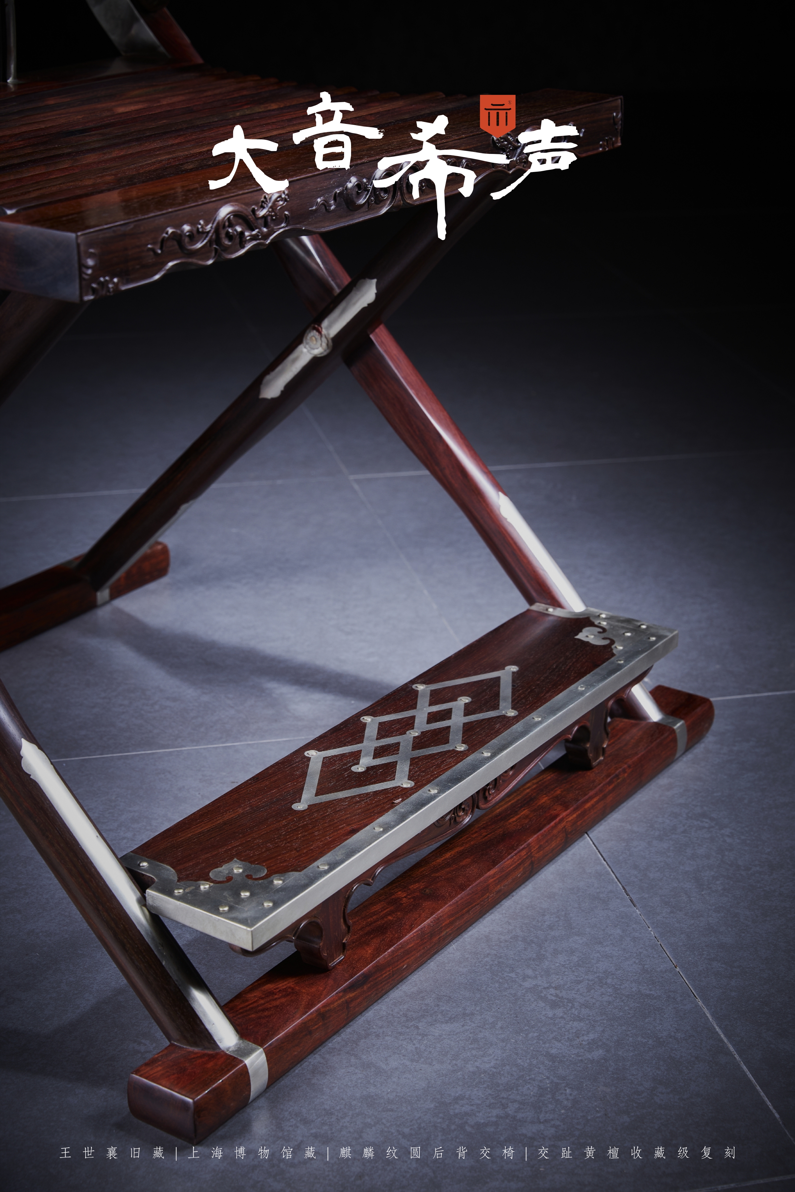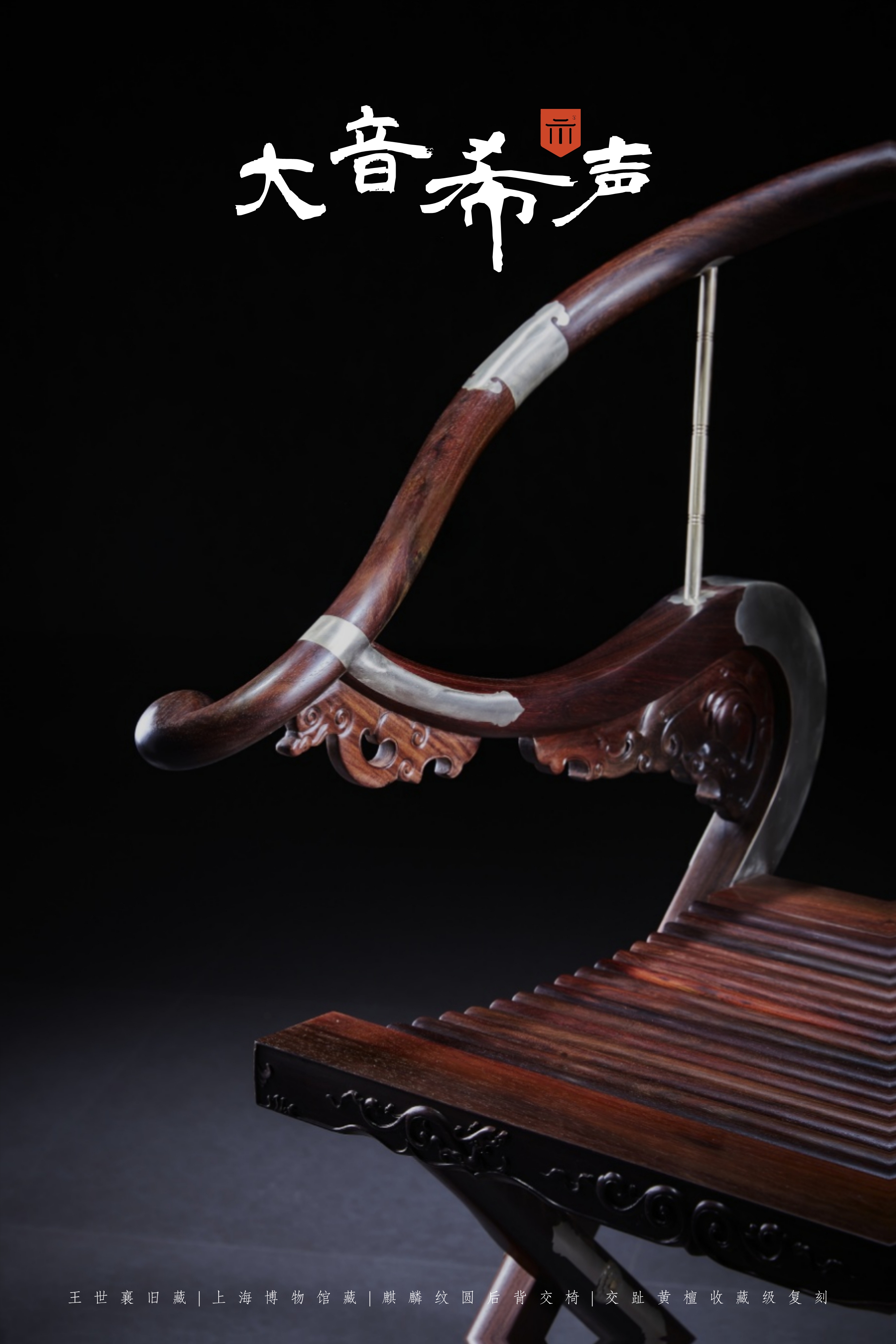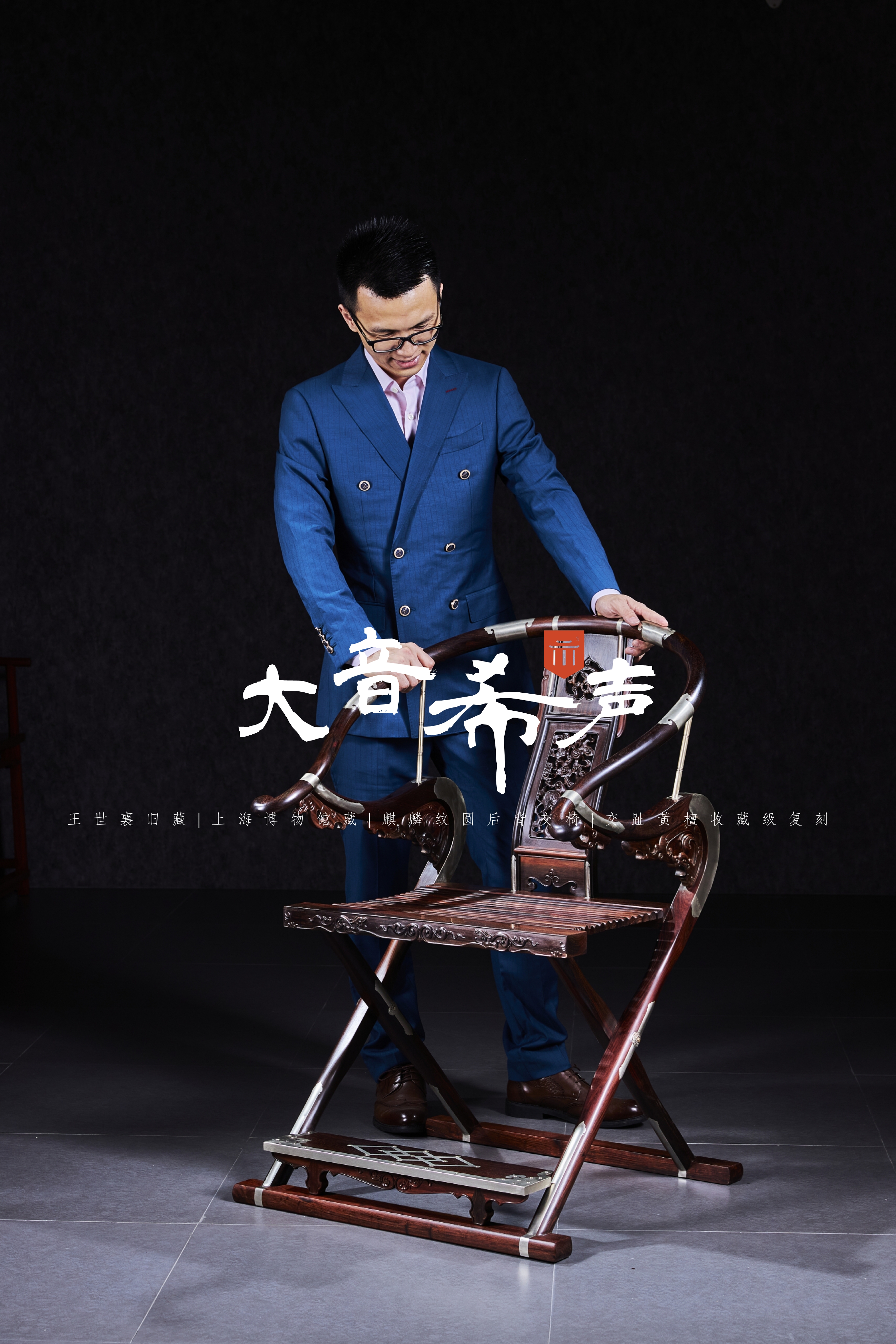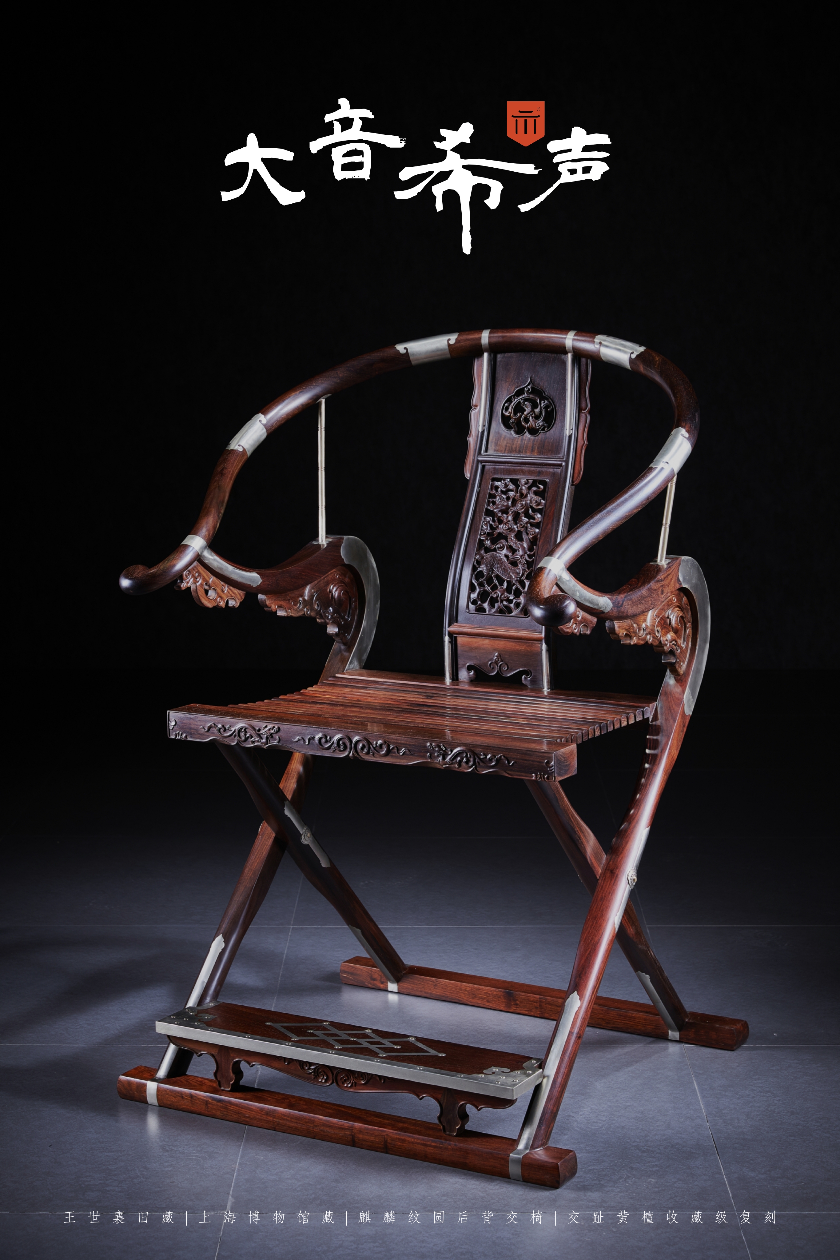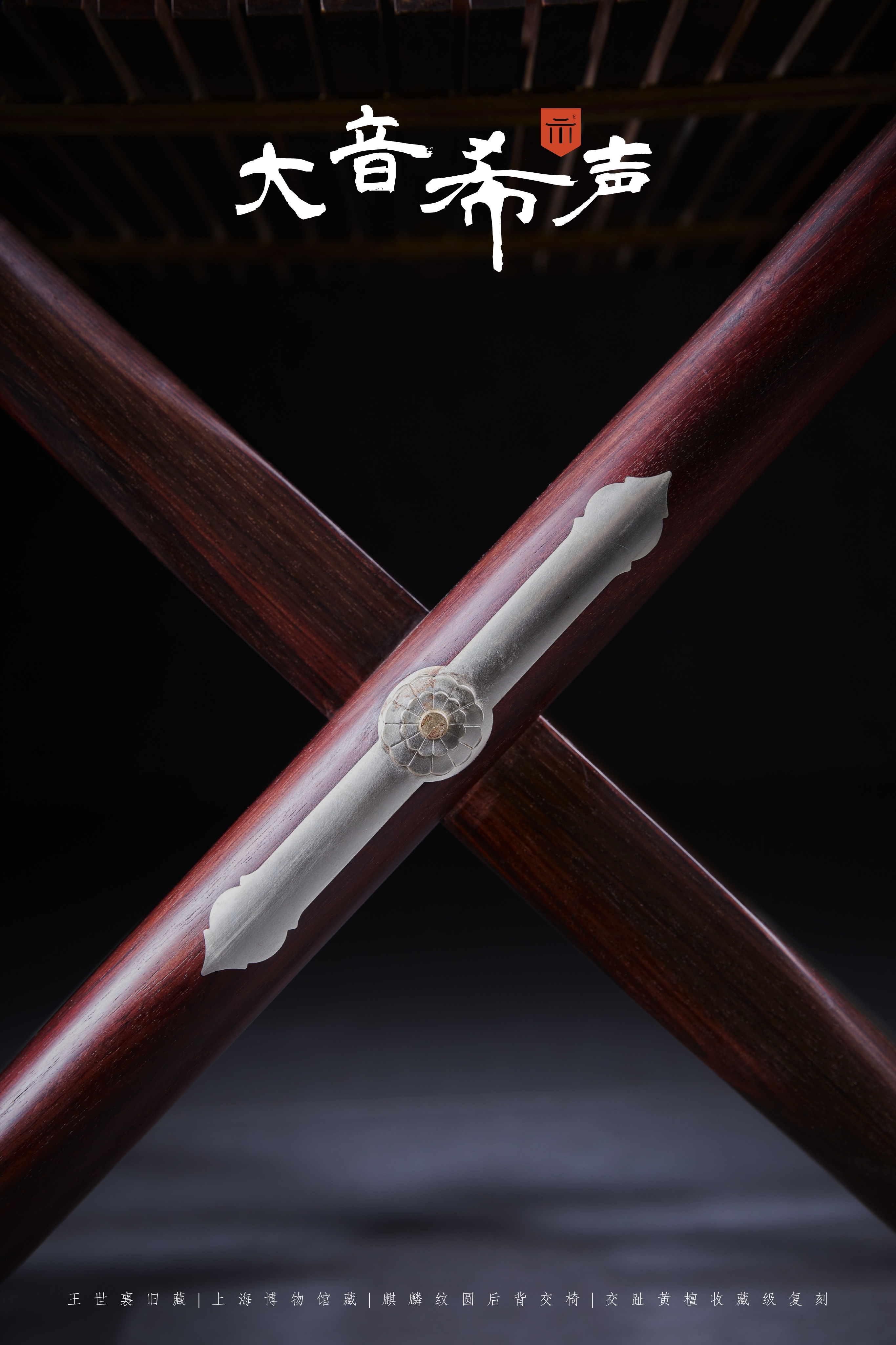 尤以这把王世襄旧藏黄花梨圆后背交椅,为众多行业人士,学习、复刻、研究的标准器,三截攒框镶板靠背,上部如意开光透雕螭龙纹,中部透雕麒麟、葫芦、山石、灵芝,下部亮脚起卷草纹阳线,嵌铜使其坚固,至精者,加微改良,施平嵌,工艺更为复杂,整体更为平顺,交椅在古时更为权势象征,今人多做主椅,赠长辈、领导,置空间显位营造氛围。