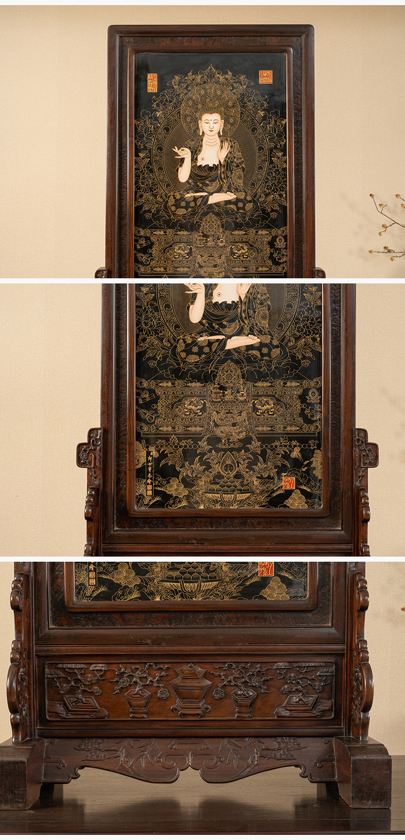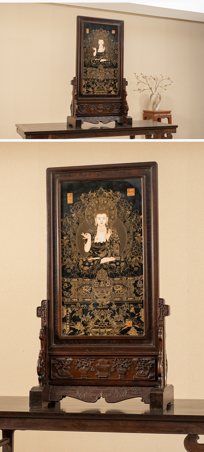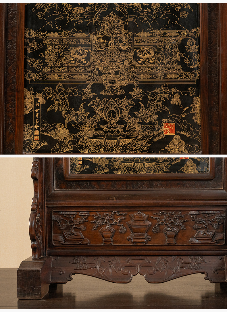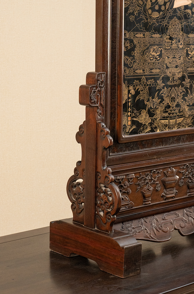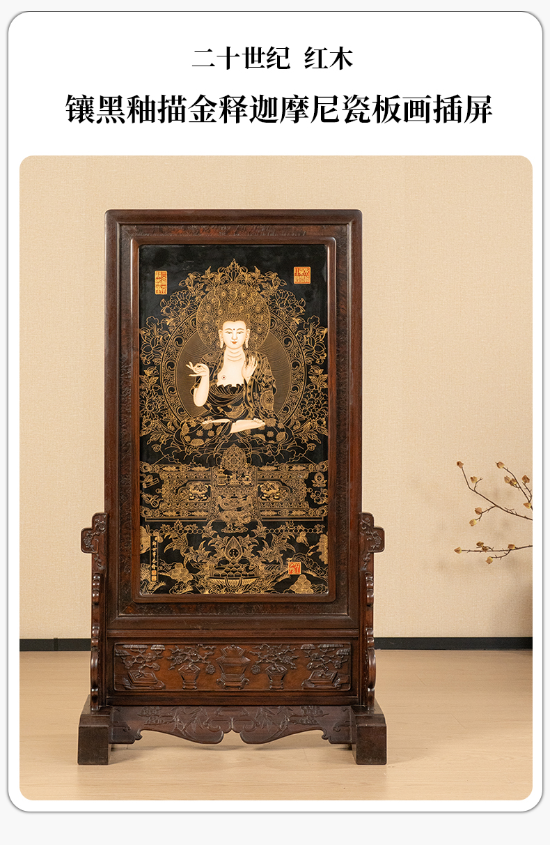 二十世纪 红木镶黑釉描金释迦摩尼瓷板画插屏