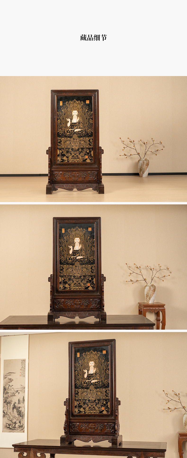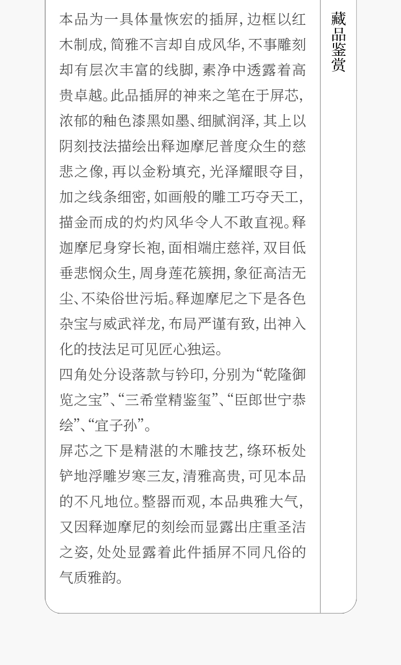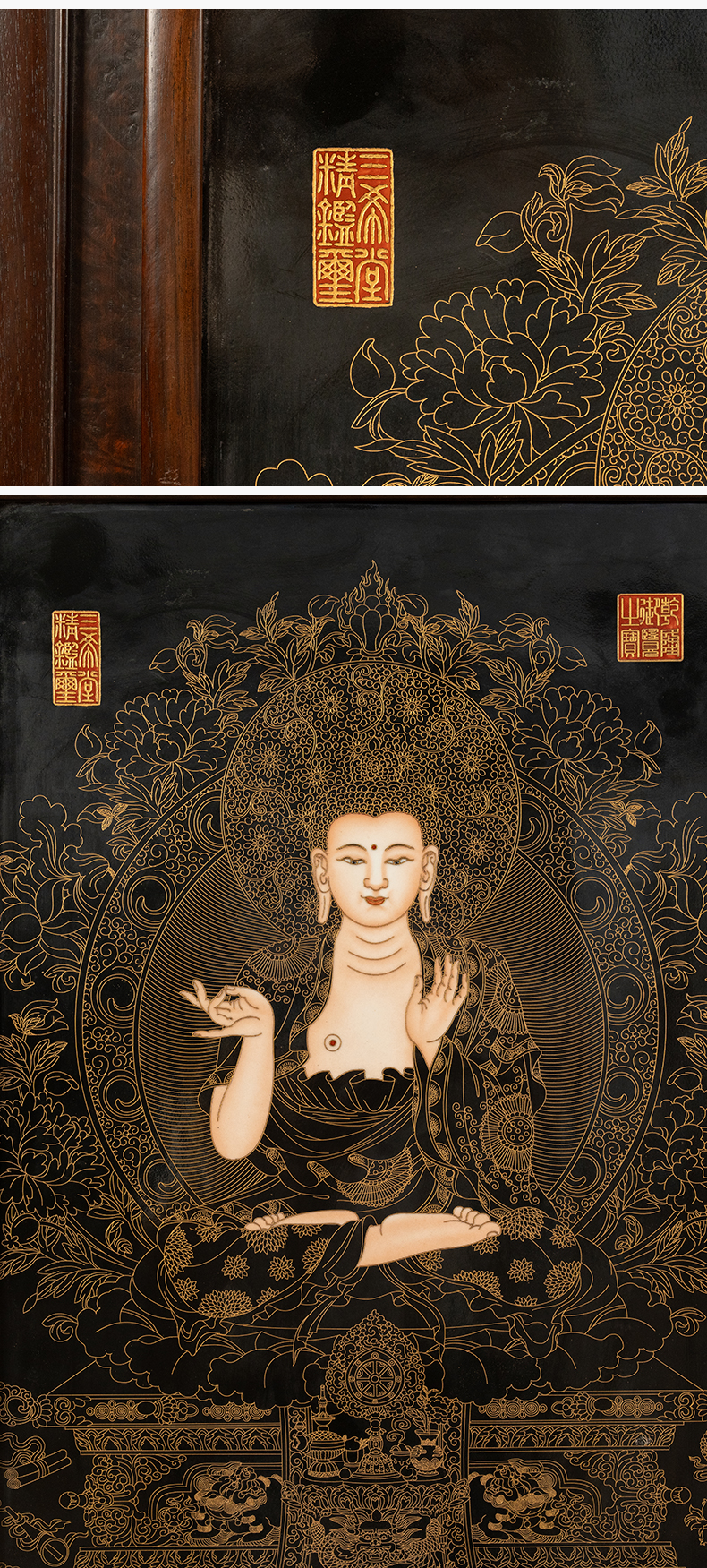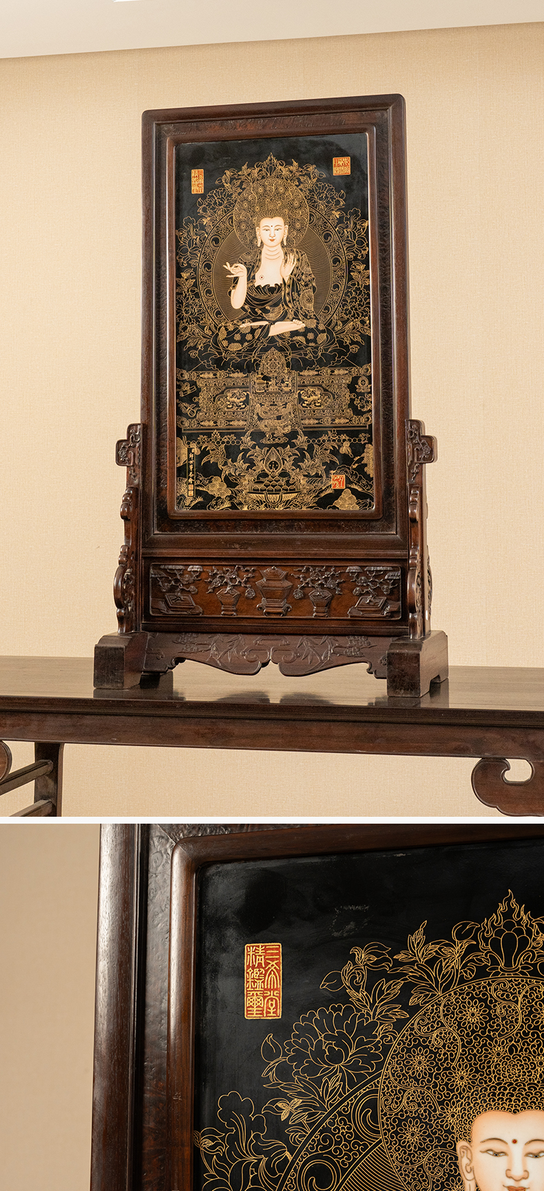 二十世纪 红木镶黑釉描金释迦摩尼瓷板画插屏