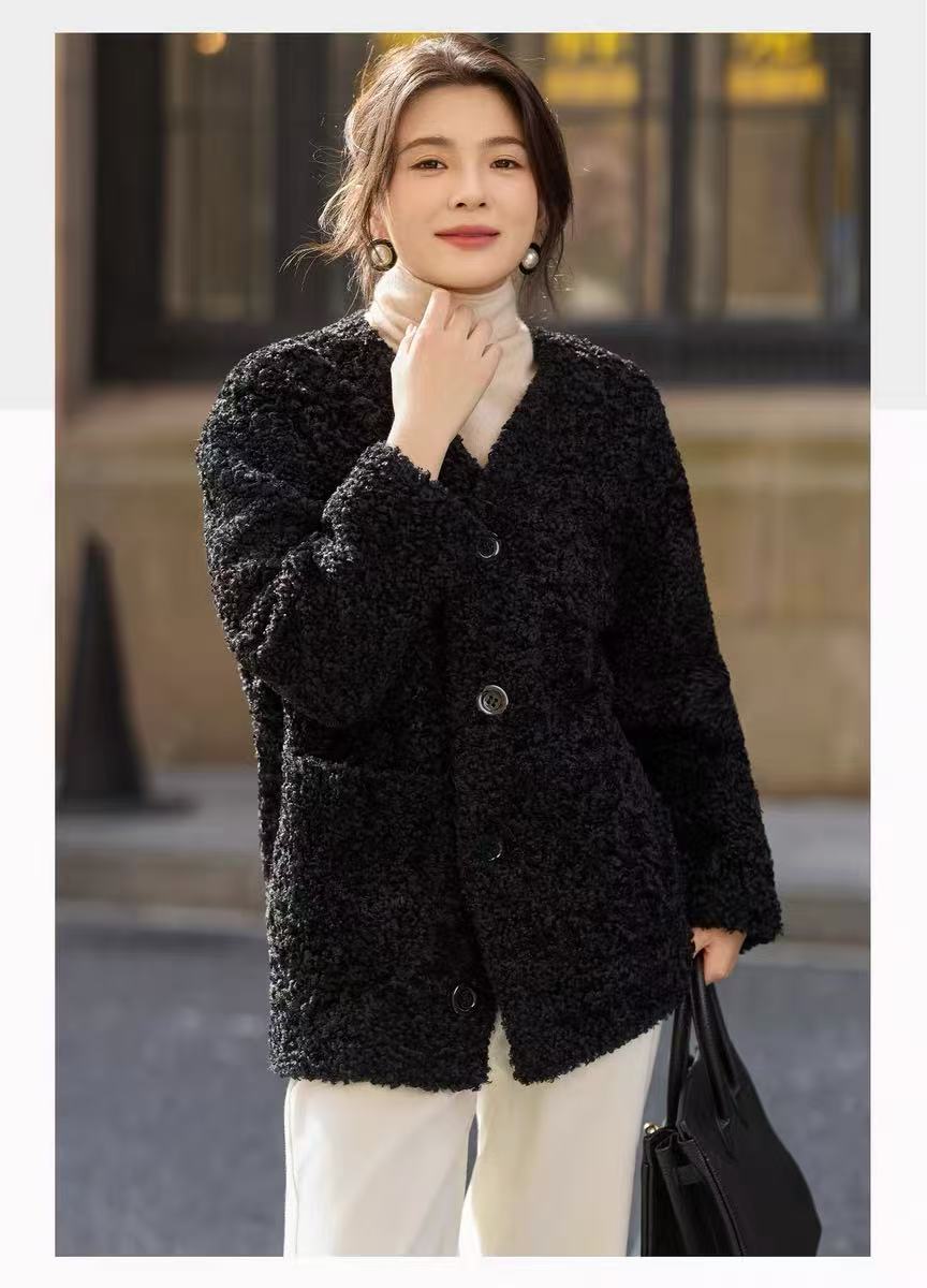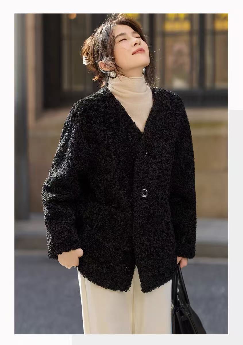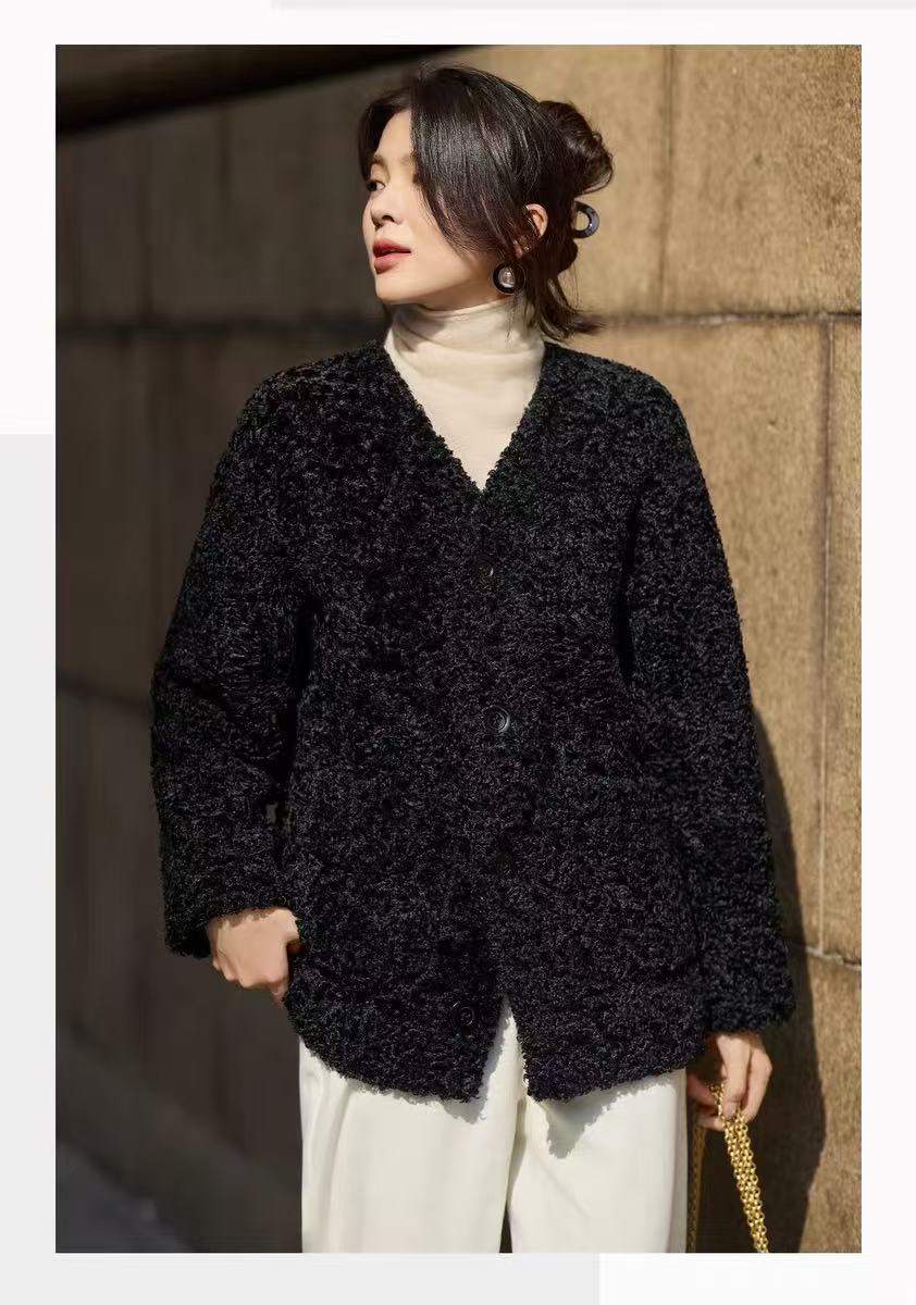 【环保皮草】P11 V领黑色卷卷毛皮毛一体秋冬大衣外套-喜出