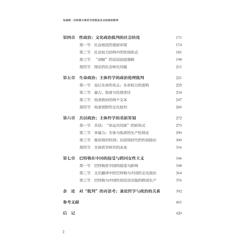 本书为教育部人文社科规划项目成果。本书综合运用多种研究方法,全面系统立体地对巴特勒主体哲学及其文化政治批判进行系统研究。第一章,理清主体在西方哲学史中的发展历程,探讨巴特勒主体哲学思想体系的建构。对主体本体论意义的重构始终贯穿巴特勒思想发展的各阶段,这构成其介入文化政治批判实践的深层哲学基础。第二至六章,分别探讨巴特勒文化政治批判的五个具体领域:性别政治、身体政治、性政治、生命政治、认同政治,系统探究文化政治批判的逻辑性展开及其生成机制与衍变理路,这也体现了主体哲学向文化政治批判介入与实践的内在展开逻辑。第七章,落脚巴特勒在中国的接受与生成,对中国特有的性别理论研究与话语实践进行梳理与审视。