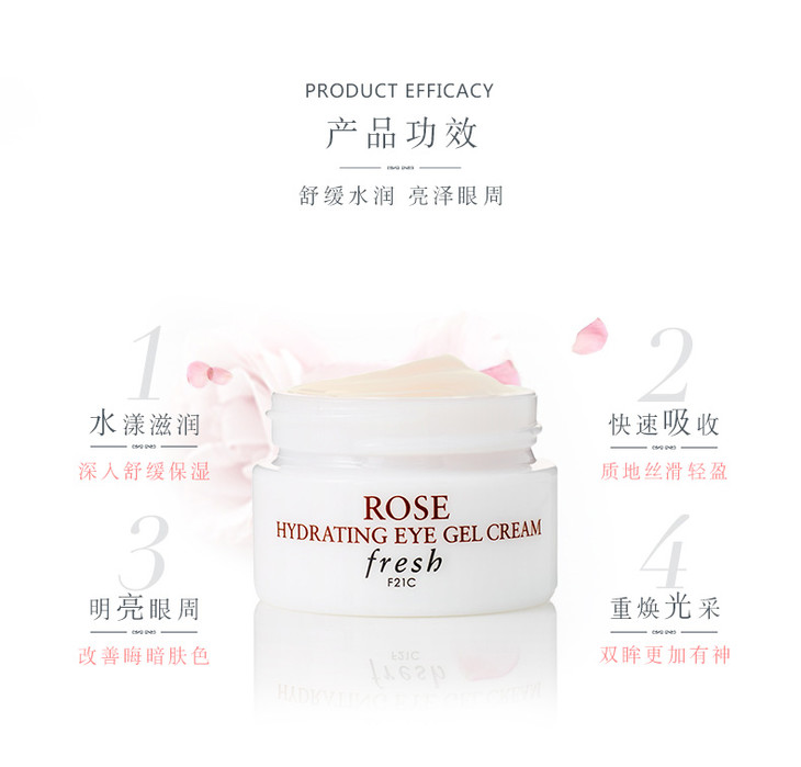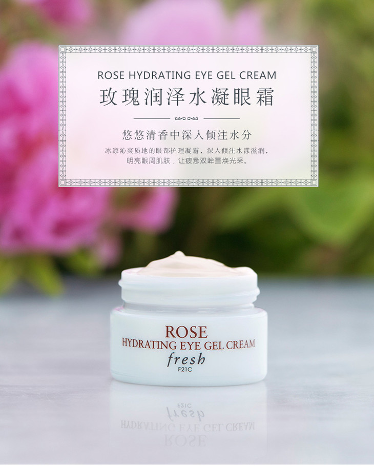 馥蕾诗Fresh玫瑰啫喱眼霜15ml緊緻抗皺祛黑眼圈清爽啫喱質地💦,非常滋潤一點不油膩。保濕去細紋效果很好!🌸主要針對眼部黑眼圈、💃🏻乾紋、💚細紋。採用新鮮的玫瑰加上多種優質天然成份,🎏帶來即時且長效的保濕功效✨。激活細胞的活性,改善眼部組織的內環境,👣增強眼部皮膚的營養和水分狀態,舒緩放鬆眼部疲勞,㊙️有效防止表情紋的惡化,全面解決眼部問題。💪🏻