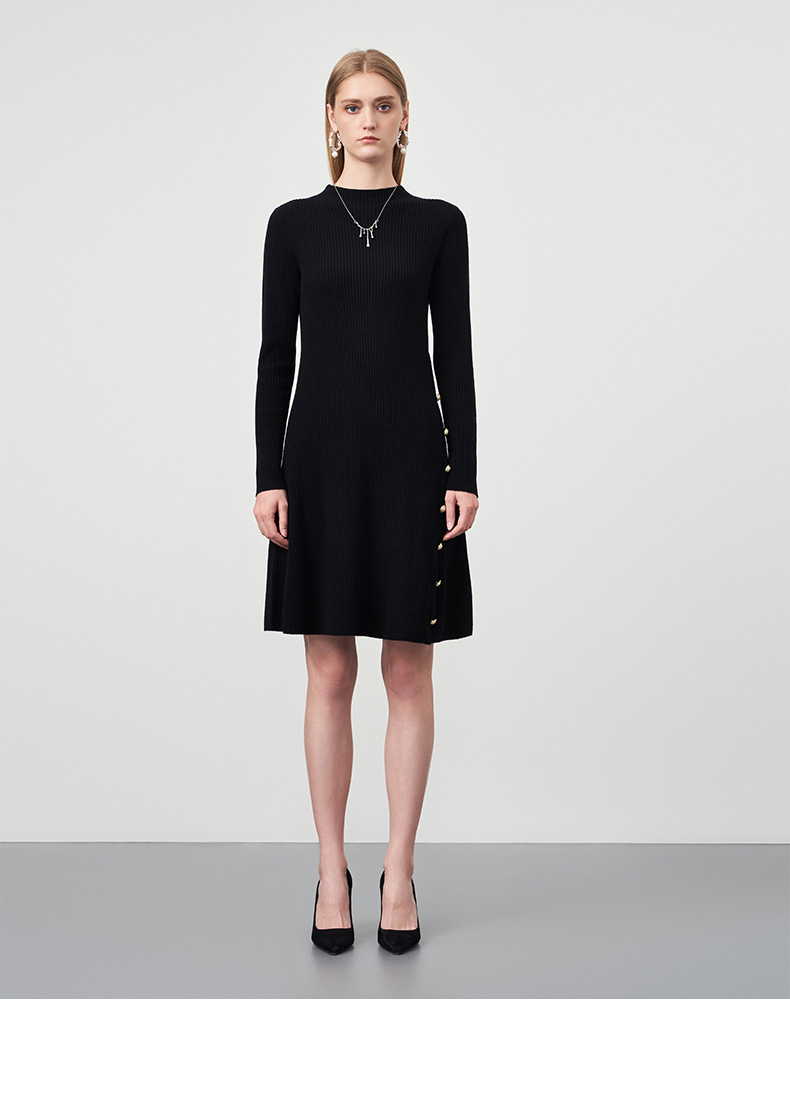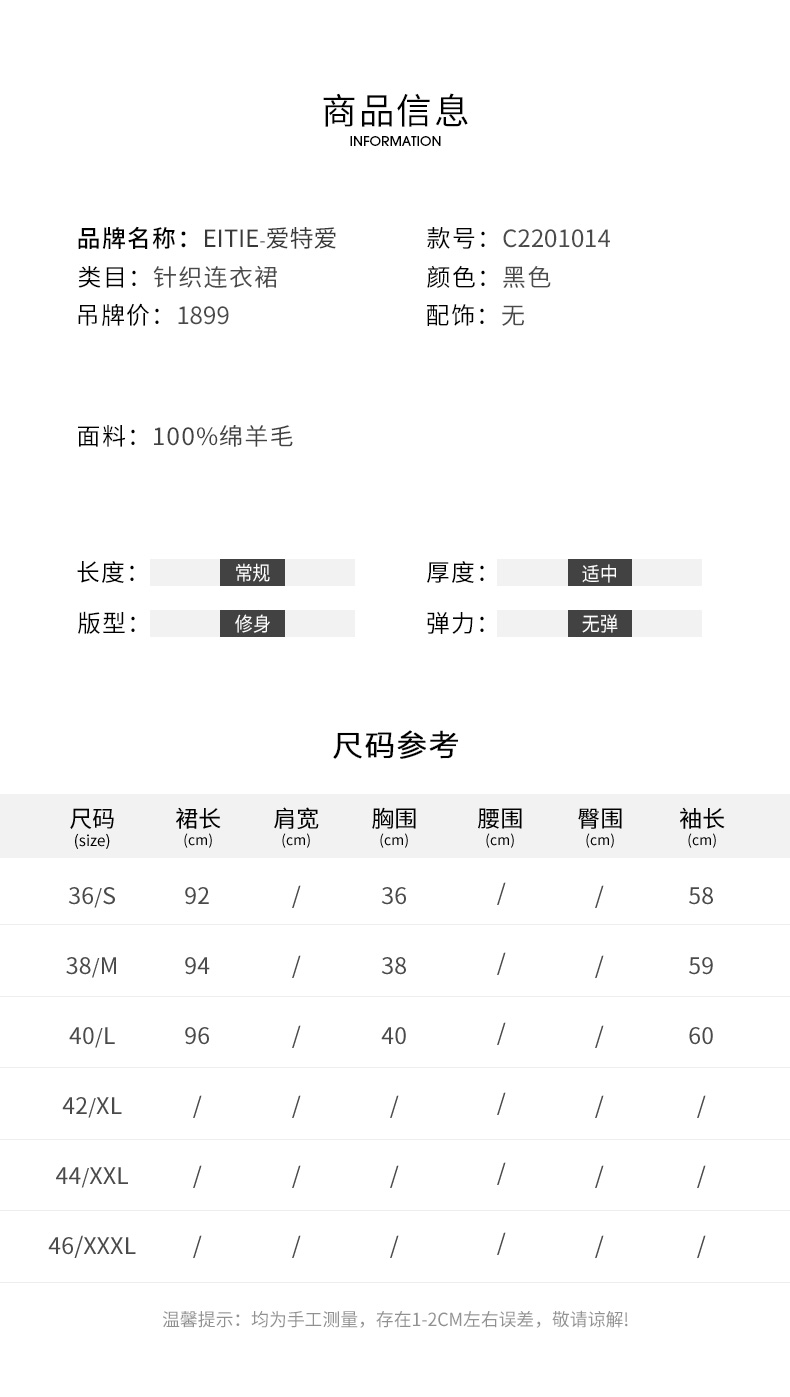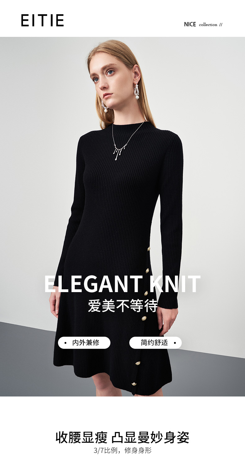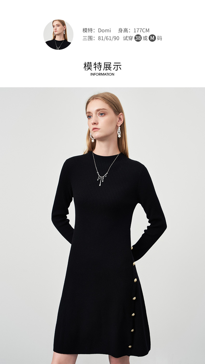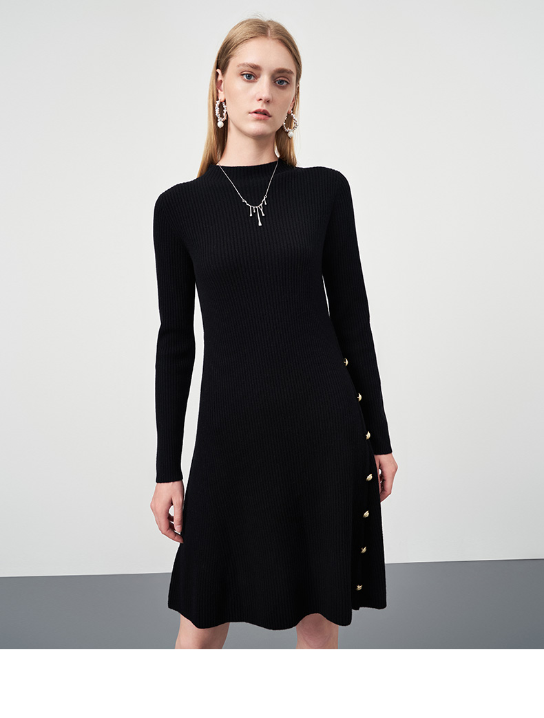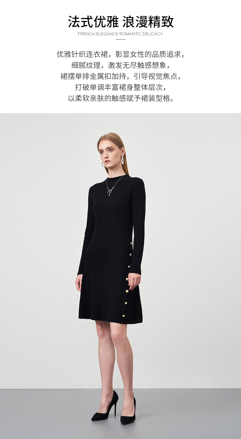 EITIE爱特爱秋季新款100%绵羊毛气质半高领黑色修身显瘦通勤针织连衣裙C2201014