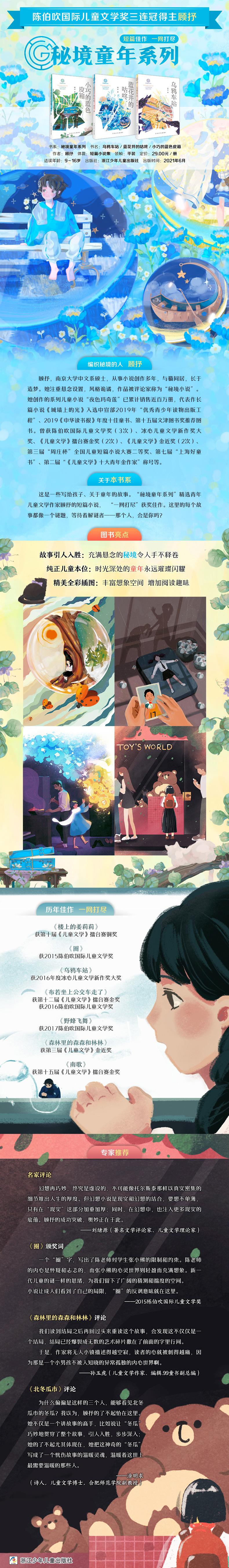 本套系为顾抒优秀短篇作品集,收录作品时间段跨十六年,展现了顾抒短篇小说的创作风貌,顾抒为本书撰写了自序。在顾抒的作品中,“童年”是占据首位的主题;叙事手法上,她擅长制造悬念,很容易把读者拉进她制造的“秘境”里:丛书名“秘境童年系列”正源于此。图书采用黑白内文、彩色插页的形式,文质兼美。《小巧的蓝色皮箱》收录七篇作品。《布若坐上公交车走了》《森林里的森森和林林》是顾抒的获作品。《北冬瓜市》是顾抒较新的代表作。