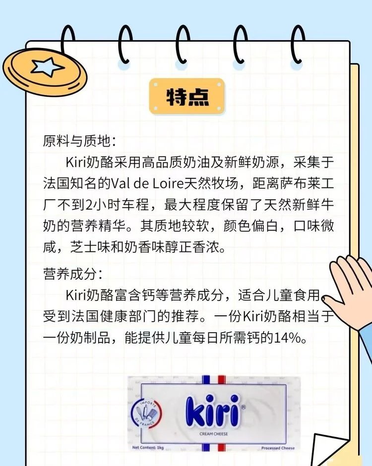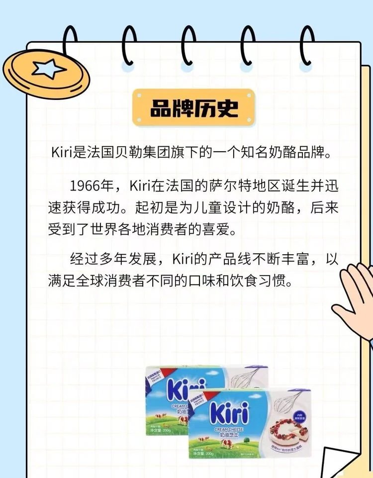 Kiri是法国贝勒集团旗下的一个知名奶酪品牌。 1966年,Kiri在法国的萨尔特地区诞生并迅速获得成功。起初是为儿童设计的奶酪,后来受到了世界各地消费者的喜爱。 经过多年发展,Kiri的产品线不断丰富,以满足全球消费者不同的口味和饮食习惯。