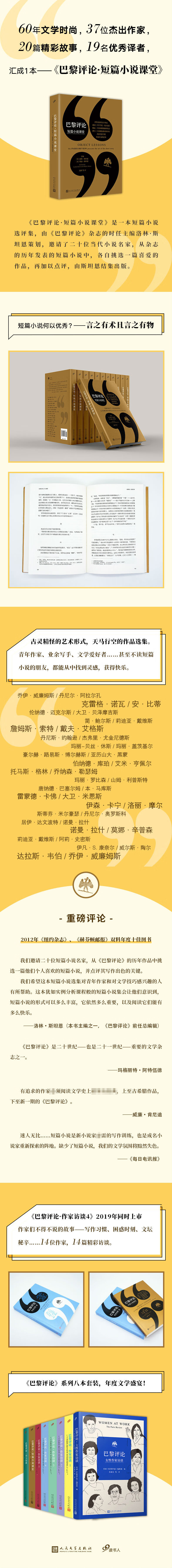 九久读书人早在数年前就推出了《巴黎评论》“作家访谈”系列。其实在访谈之外,《巴黎评论》本身也是国际*线的精品文学阵地,一直坚持刊发世界*的短篇小说,从一九五三年创刊以来已积累了数百篇精致的文字艺术品。二〇一二年,时任《巴黎评论》总编辑的洛林·斯坦恩邀请了二十位当代短篇小说作家,按照他们自己的喜好与审美,各挑选一篇该杂志发表过的短篇小说,并为之撰写一则短评。之后,洛林·斯坦恩与塞迪·斯坦恩再将这些选中的小说和短评一起结集出版。