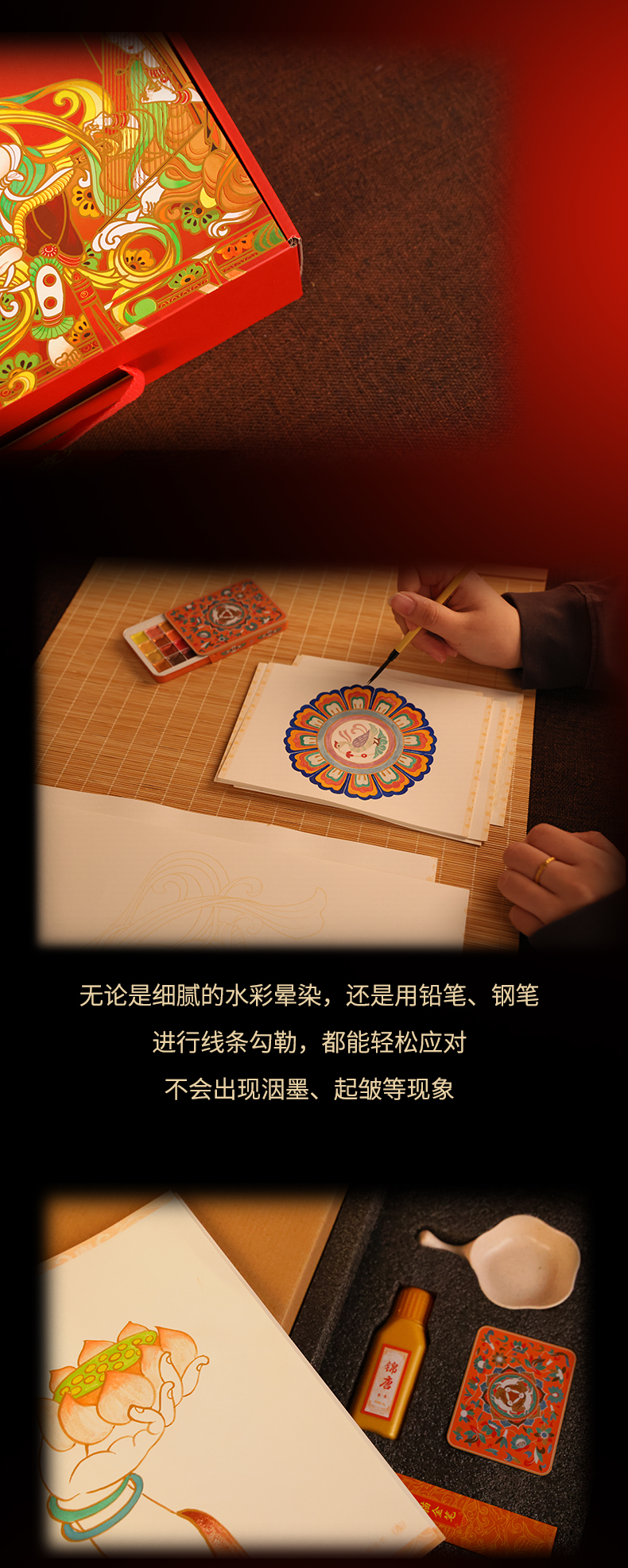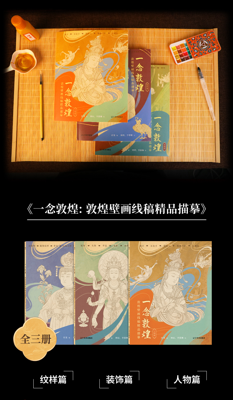《一念敦煌》壁画线稿描摹本·礼盒精装版, 赠超值赠品: 1.24色珠光水彩。 2.60ml金墨(配墨蝶)。 3.1支描金笔(附5支替换芯)。 4.3支勾线毛笔。 5.8张八开描摹卡+8张32开描摹卡。
