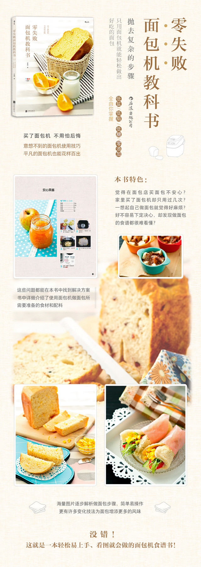 小鱼妈以新手的角度将做法写得非常详尽,再佐以超过550张步骤图解,相信此书对初学者一定有极大的助益,只要照着图片step by step,您也能做出属于自家风味的好吃面包,爱孩子就从亲备餐点开始吧!