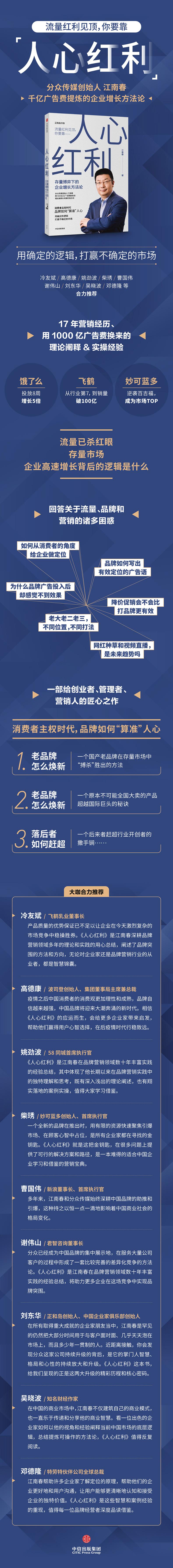 《人心红利》是江南春在品牌营销领域数十年丰富实践的经验总结,其中体现了他长期以来在品牌营销实践中的独特理解和思考,既有深入浅出的理论阐述,也有翔实落地的案例实操,值得大家学习借鉴。 姚劲波 58同城首席执行官