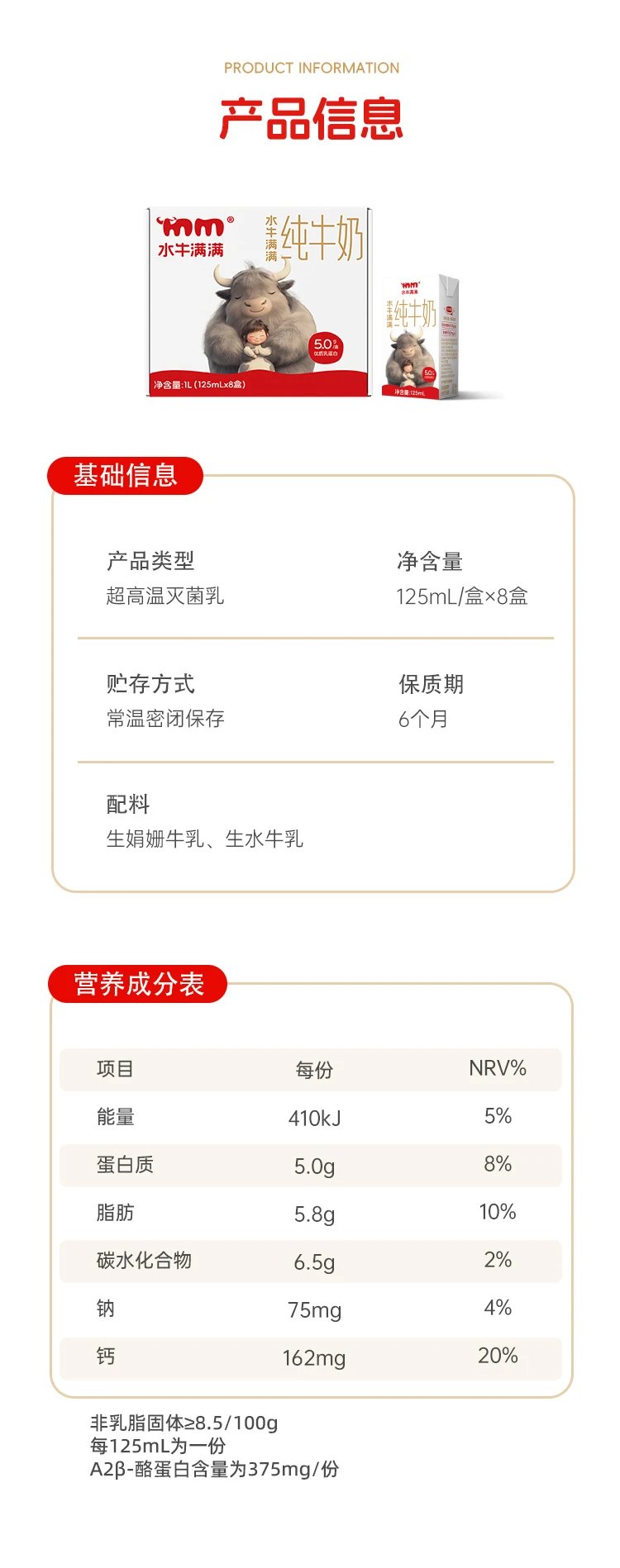 【名称】水牛满满5.0水牛纯牛奶 【规格】125ml/盒 【生产日期】8月18日(批次更新) 【保质期】6个月 【保存方式】常温避光储存 【发货地】广西北海 【发货快递】中通,申通随机发。 【发货时间】48小时 【物流规则】新疆西藏港澳台不发货,宁夏甘肃海南青海+5/提,内蒙古+10元/提 【售后原则】:不支持7天无理由退换货、运输过程中产生的售后(破损、丢件)由我司承担,破损买家需要提供带面单的快递外包装和内物破损图片,签收后24小时内提供,超时不作售后。