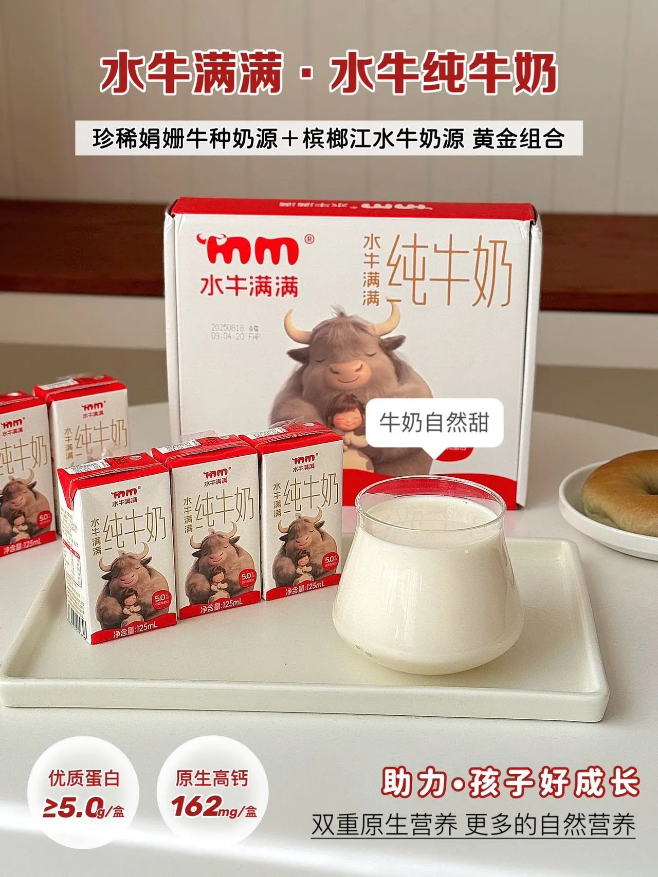 试喝3盒9.9起,水牛满满纯牛奶 珍稀娟姗牛种奶源+槟榔江水牛奶源 5.0g/盒原生蛋白+162mg/盒原生高钙 含A2β-酪蛋白 配料表干净基地直邮