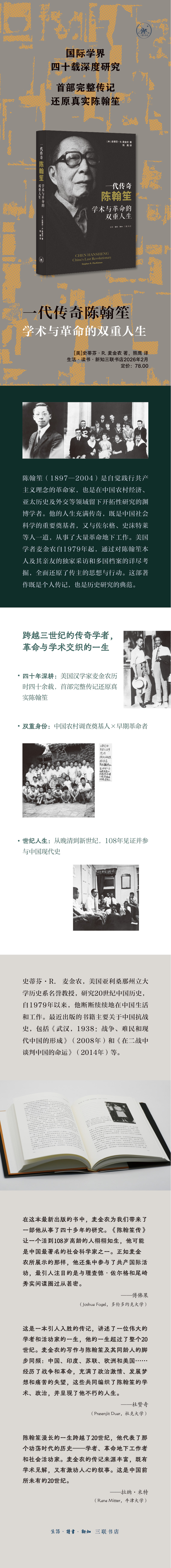 这是一本引人入胜的传记,讲述了一位伟大的学者和活动家的一生,他的一生超过了整个20世纪。麦金农的写作与陈翰笙及其同龄人的脚步同频:中国、印度、苏联、欧洲和美国……经历了战争和革命,充满了政治激情、发展梦想和痛苦的失望,这些共同编织了陈翰笙的学术、政治,并呈现了他不朽的人生。