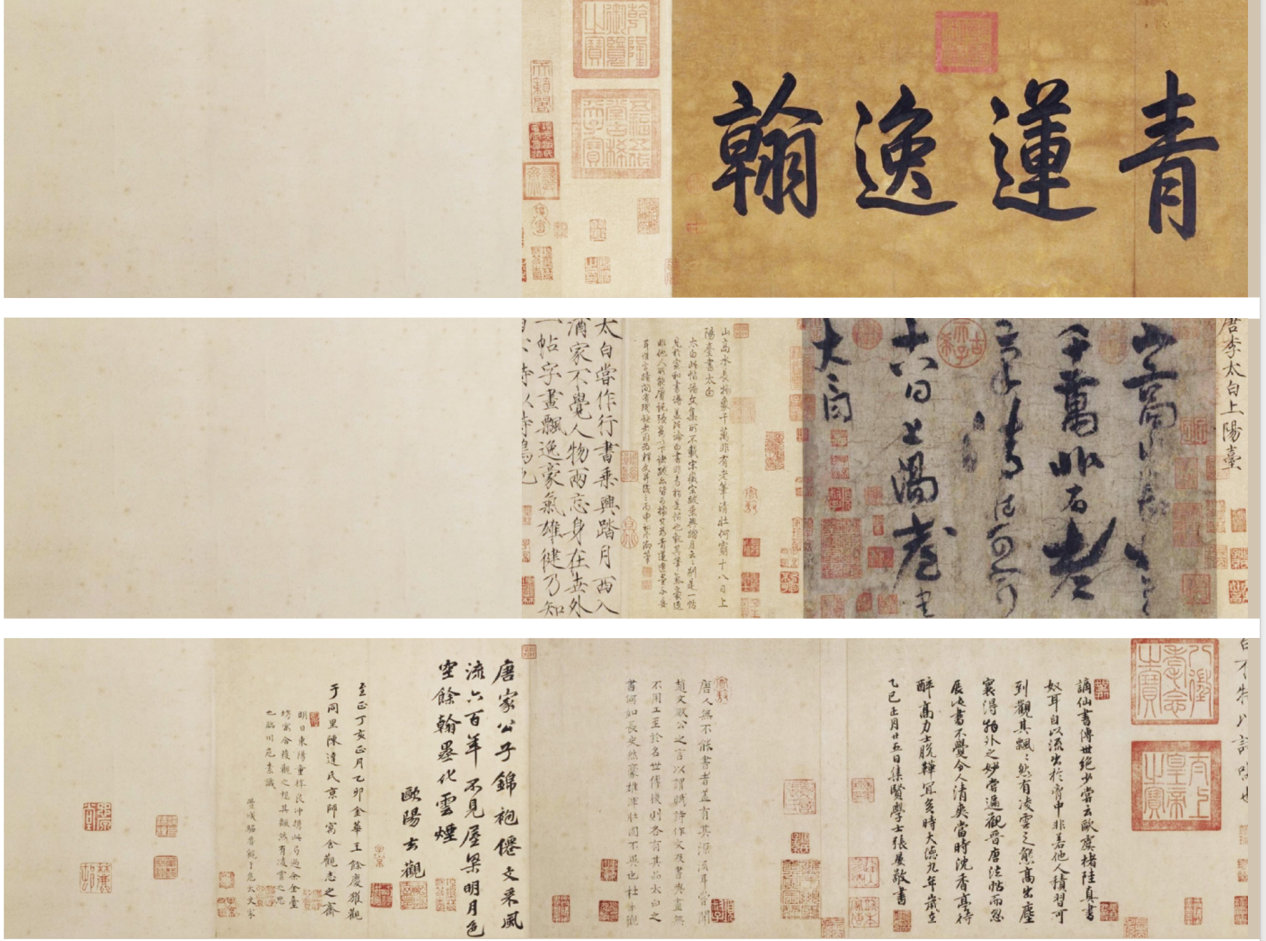 《上阳台帖》为李白唯一传世的书法诗帖。历经近1300年的传承流转,自宋徽宗鉴藏以来,诗帖共有14位帝王与历代名家鉴赏,除宋徽宗外,还有清乾隆帝、收藏家张晏、项元汴等,共留下9段题跋,近100枚鉴藏钤印。