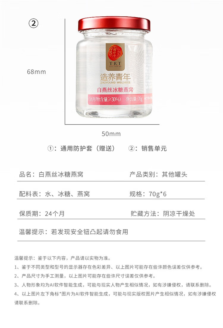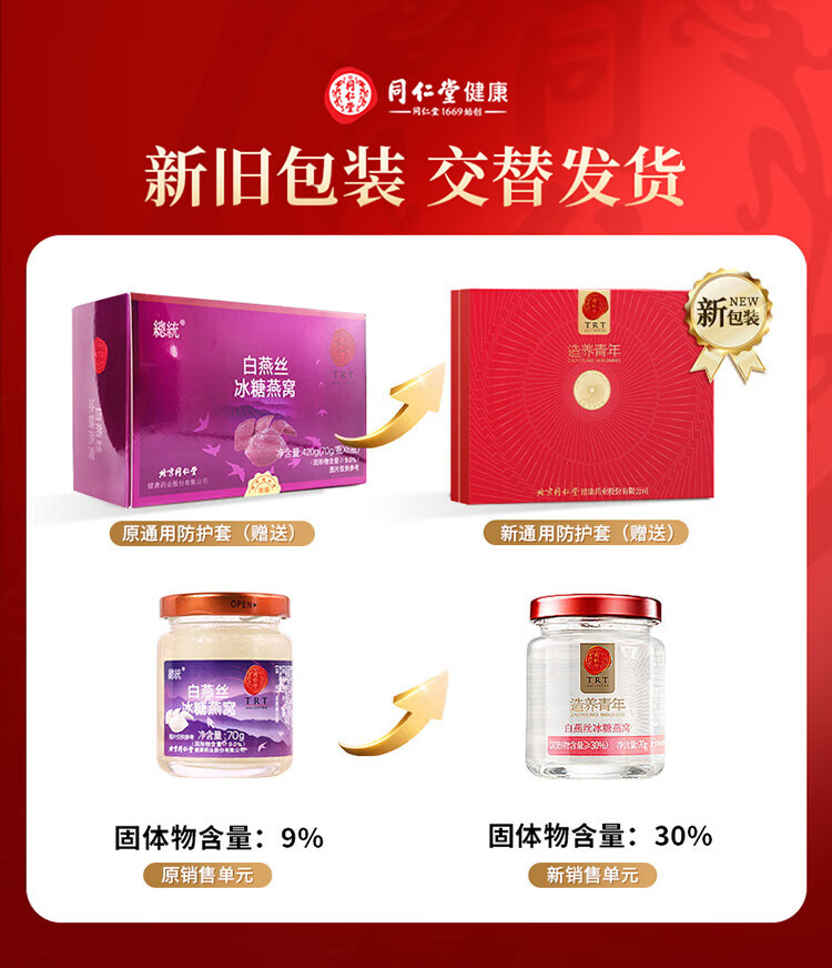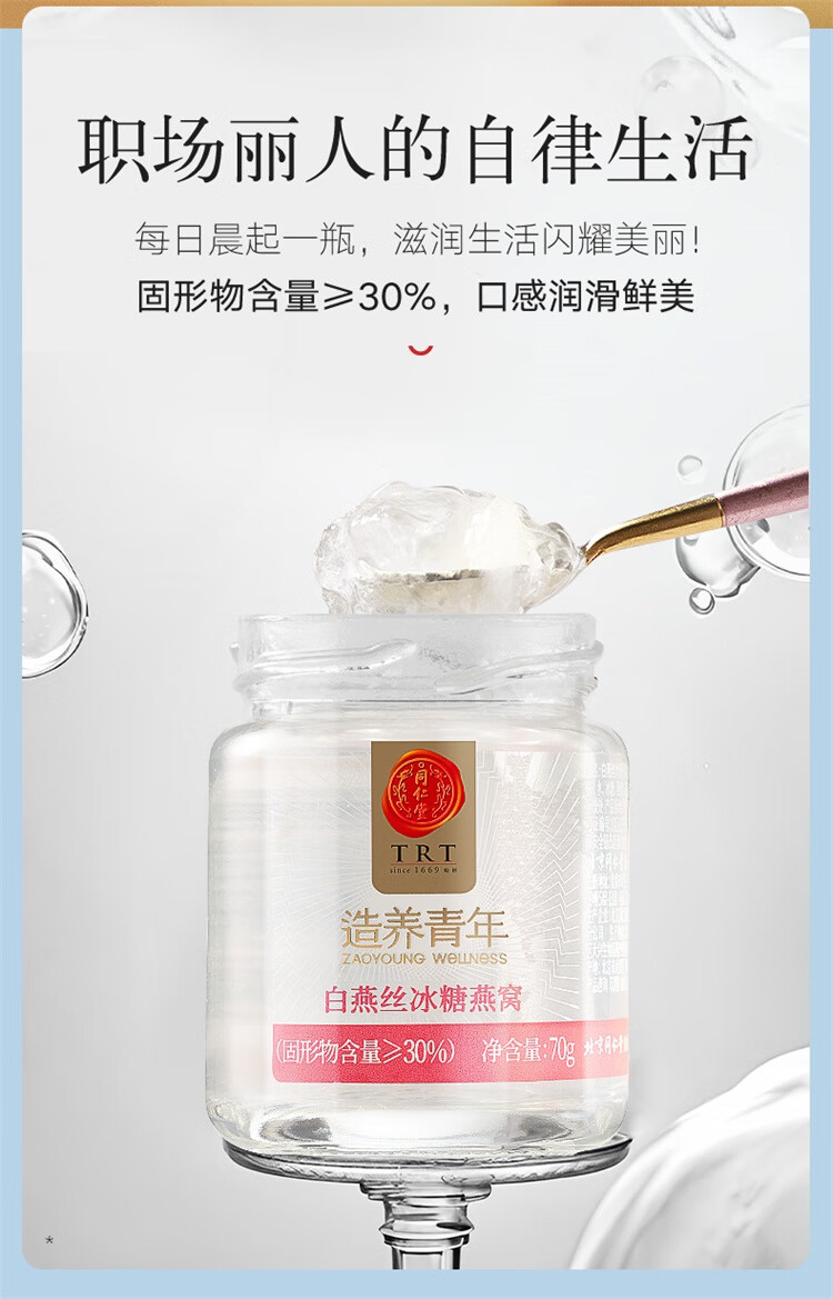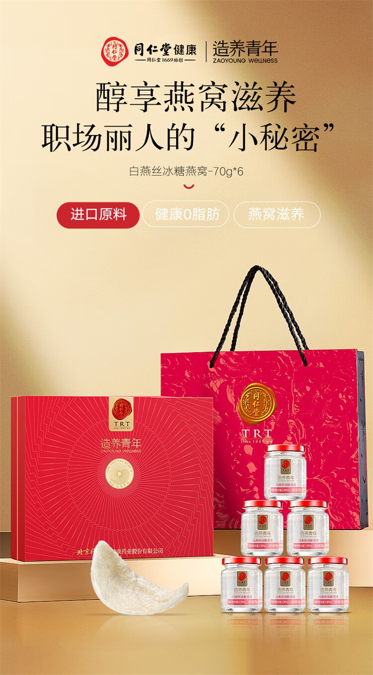 【正宗同仁堂品牌】北京同仁堂 即食白燕丝冰糖燕窝420g家庭装(70g*6瓶)老人孕妇燕窝滋补品送礼盒0脂肪固形物≥30% SY