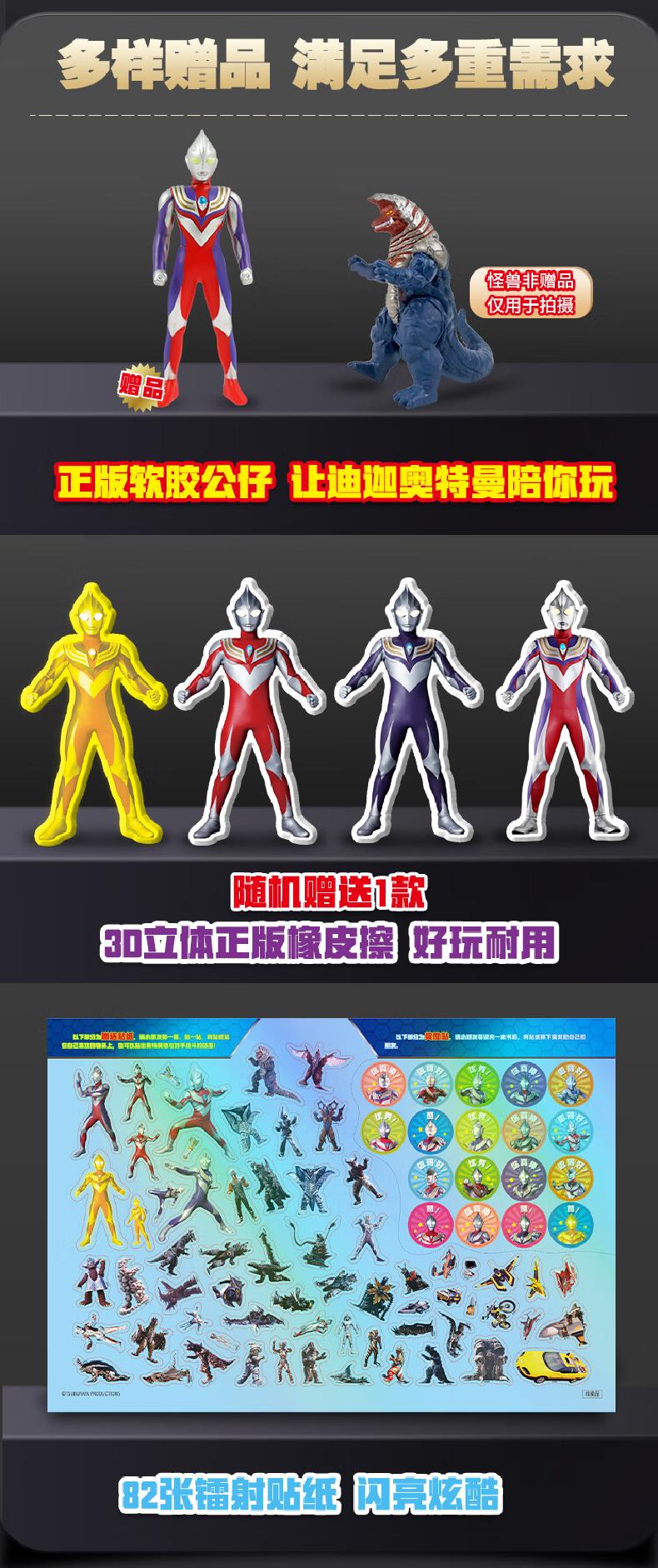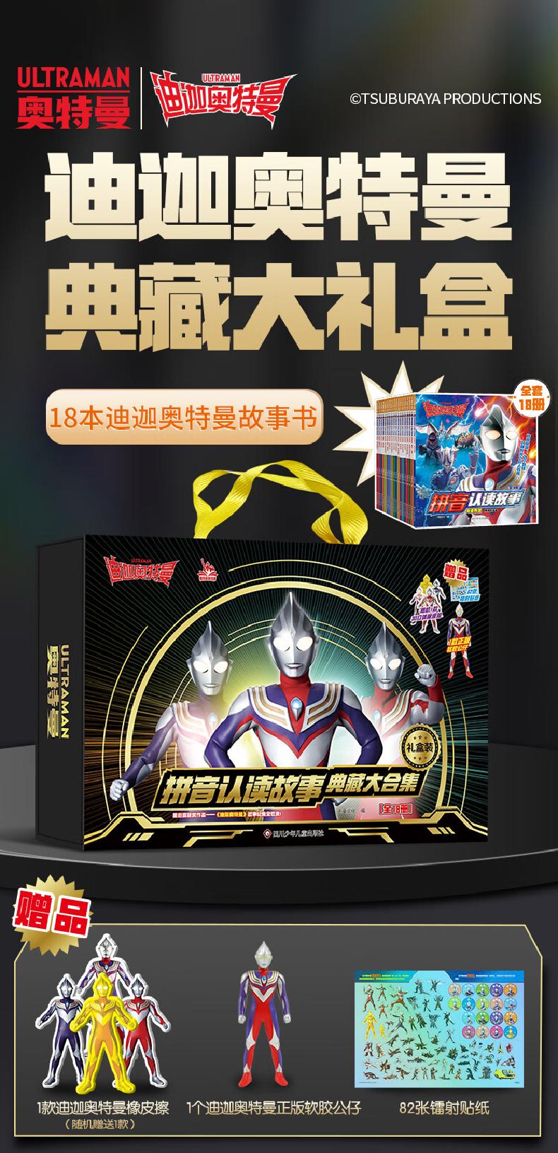 《迪迦奥特曼拼音认读故事 典藏大合集》是一套以电视剧《迪迦奥特曼》剧情为主要内容的图画故事书礼盒装,全套共18册,讲述了迪迦奥特曼与人类并肩作战,保卫地球和平的故事。每个故事均以简练的文字和高清的剧照,原汁原味地呈现精彩剧情,展现奥特英雄的英姿。全书采用大字注音,既便于家长与孩子亲子共读,又适合孩子根据注音独立认读,培养孩子自主阅读能力。附赠正版公仔和镭射贴纸,随机赠送一块迪迦奥特曼3D橡皮擦,满足小朋友对迪迦奥特曼的喜爱。