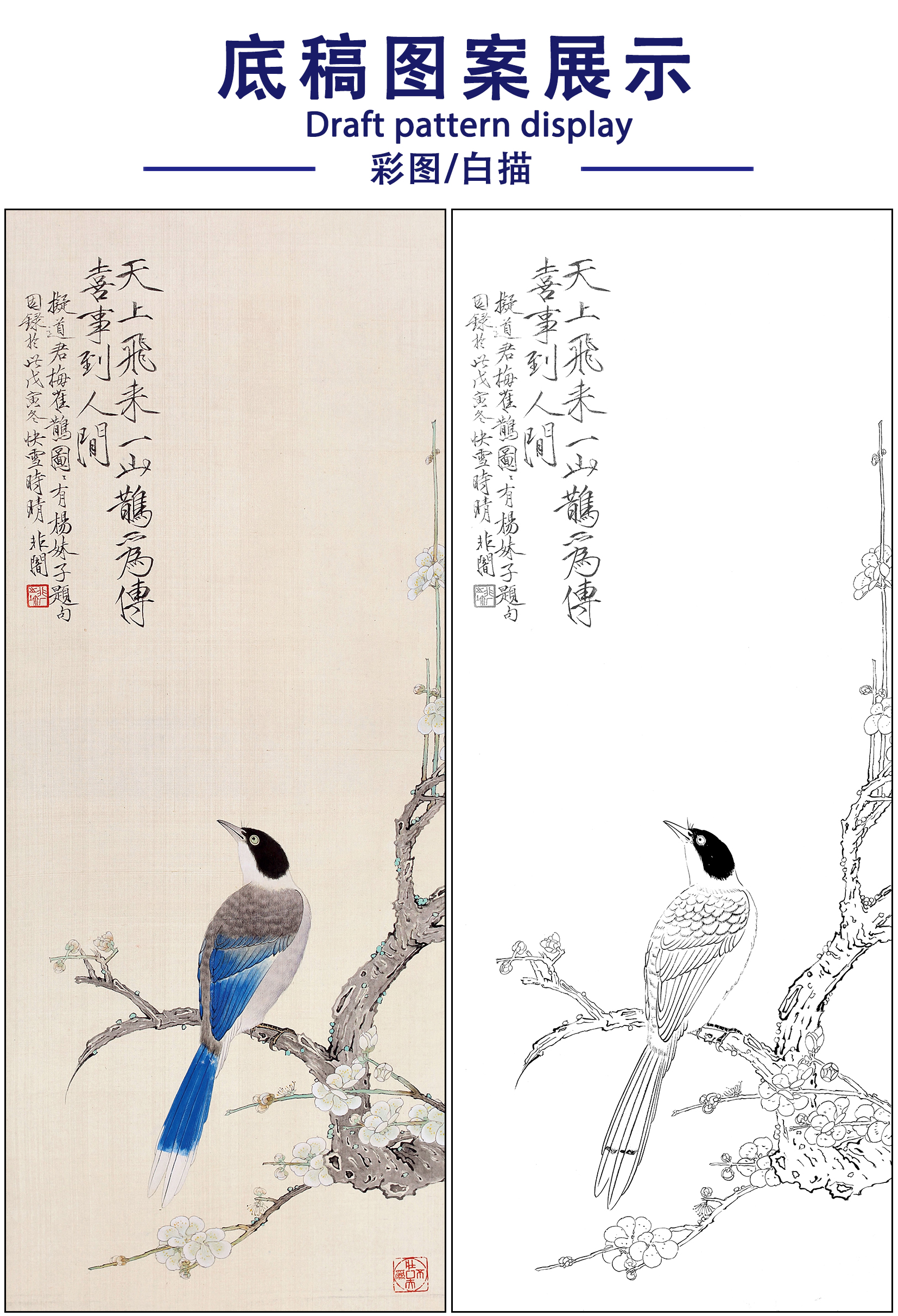 于非闇花鸟工笔画白描底稿《山鹊传喜》临摹勾线高清打印稿FA12