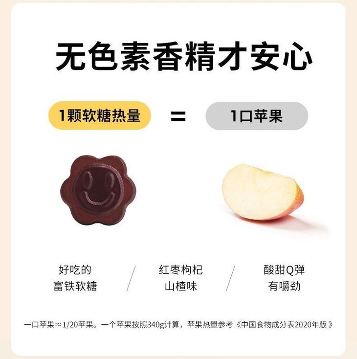 但是minayo富铁软糖小小的一颗里就富含3mg的铁元素,相当于380颗黑枸杞或12颗红枣的含铁量,每天吃6颗左右(建议不超过6颗),加上每天吃的食物里微量的铁元素,很容易满足铁元素的日常所需。